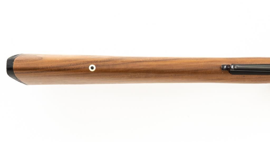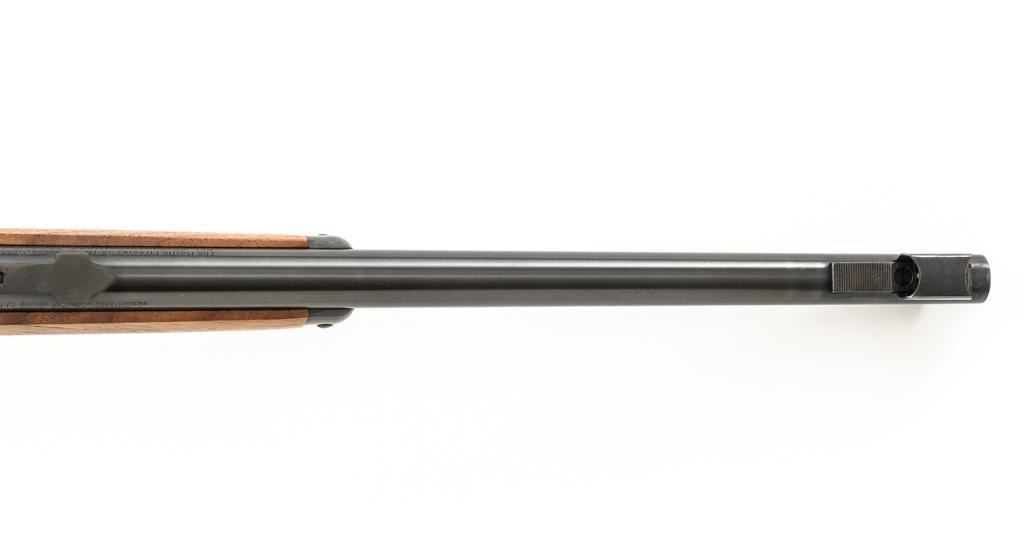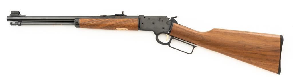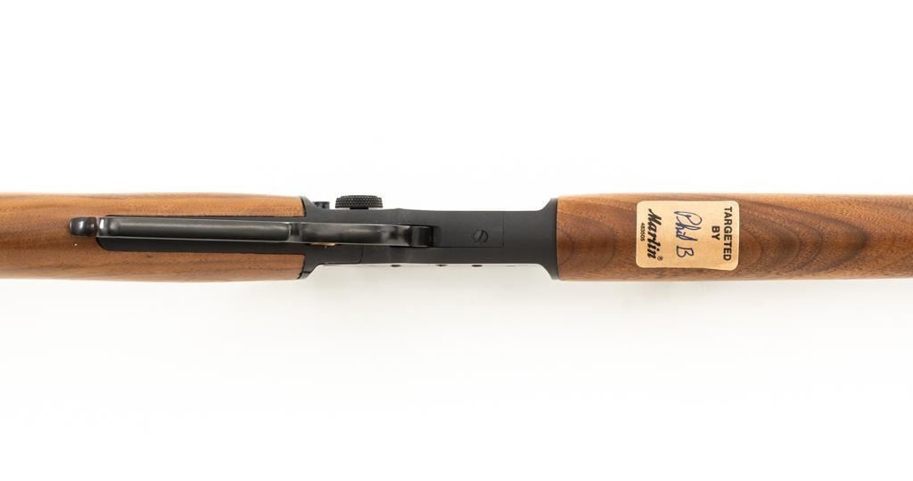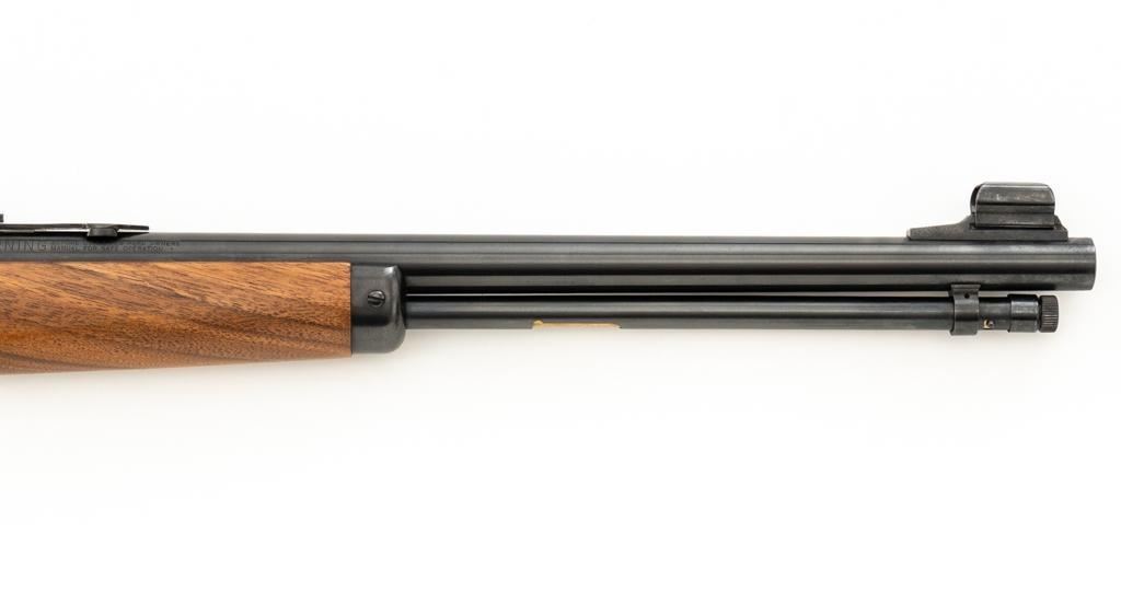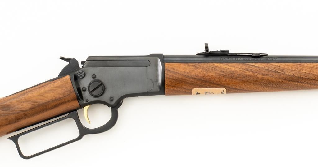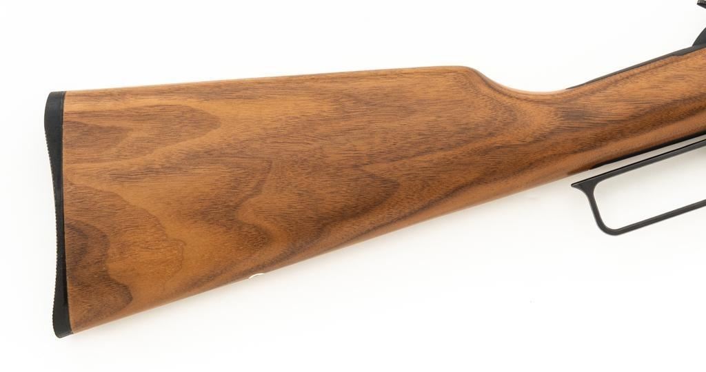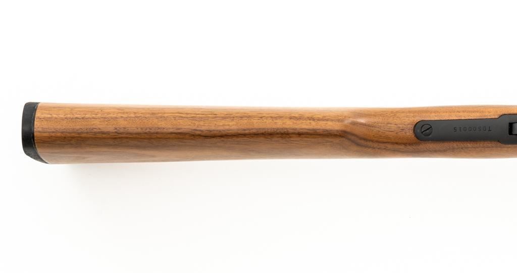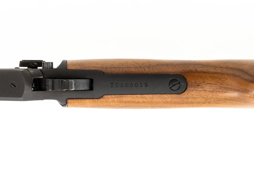 1st Year Production Marlin Model 39 TDS Lever Action Trapper Carbine, #TDS00015, .22 S-L-LR cal., 16.5'' ''JM'' marked micro-groove barrel, blue finish, smooth walnut forend and straight grip stock, ending with a checkered plastic Marlin buttplate, providing a 13.5'' LOP. Carbine also features a hooded ramped blade front and adjustable semi-buckhorn rear sight, factory drilled and tapped receiver, and gold colored trigger. Includes the factory cardboard box with matching end label, shipping box, hanging instruction manual, and Marlin padded boot. Mfg'd 1988. Carbine is in excellent, as new condition, with only light storage marks, appearing unfired. The original Marlin inspector's sticker is still on the forend. Action is crisp. Bore is mirror bright with excellent rifling. Est.: $900-$1,200. (Modern/PPT)