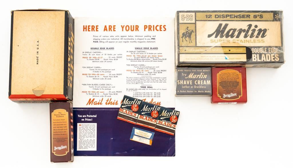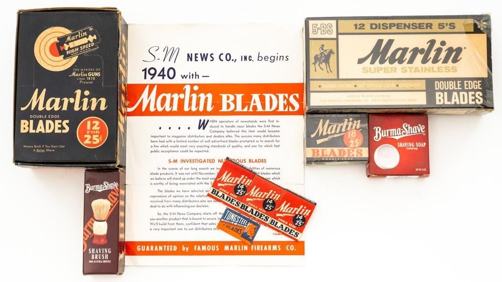 Vintage Lot of Marlin Firearms Co Shaving Blades, includes: 1.) Checkout counter display box of Marlin High Speed Shaving Blades; 2.) Two (2) packages of Marlin Rifle ''Super Stainless Steel'' shaving blades; one is in its un-opened packaging, with original 12-pack box. 3.) Box of 18 Marlin shaving blades; box has been sealed and we have not opened. 4.) Three (3) books of paper matches marked ''Marlin Blades 18 for 25''; one of the books is missing matches and shows use. 5.) One ''Tungsteel Double Edge Blades''. 6.) Marlin Firearms Co. sales brochure for their shaving blades. 7.) Burma-Shave Shaving Soap. 8.) Burma-Shave Shaving Brush. Est.: $50-$100/lot.