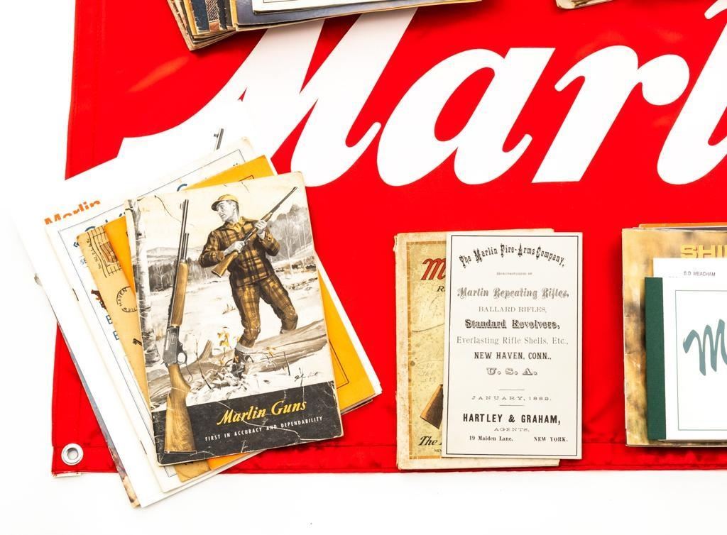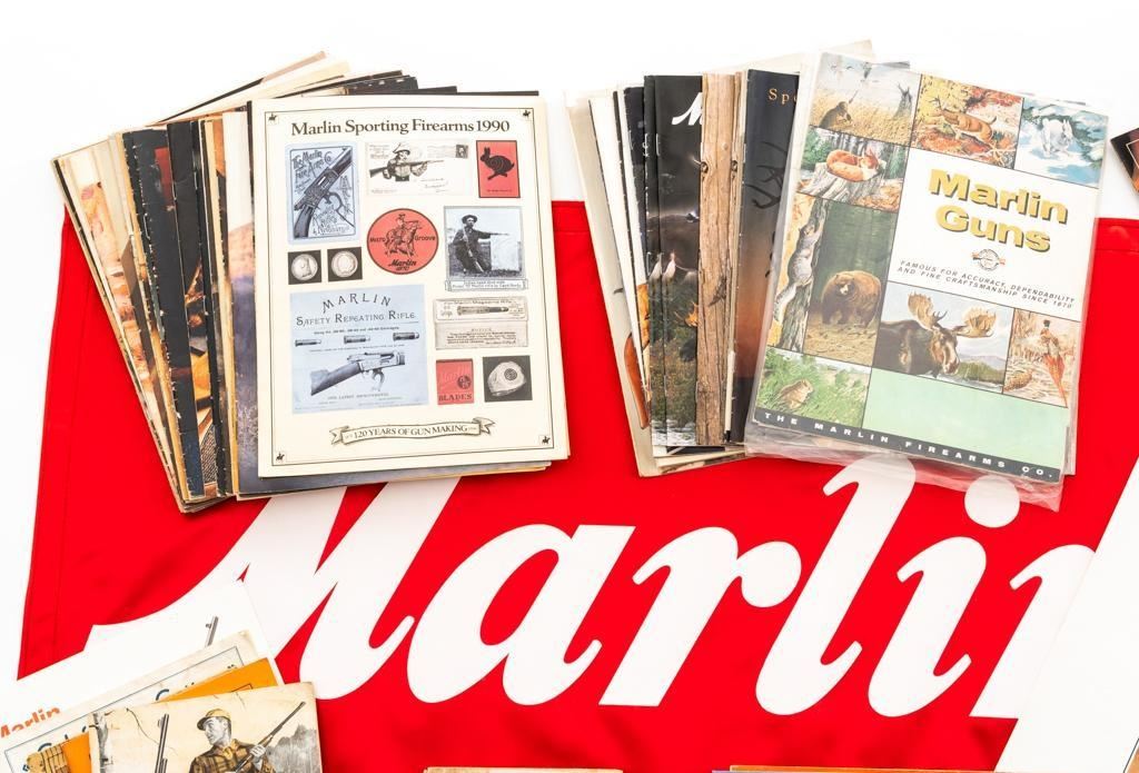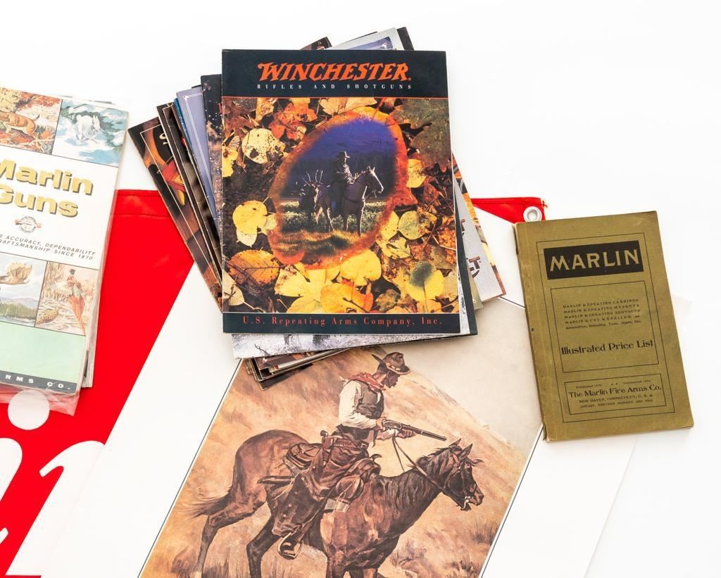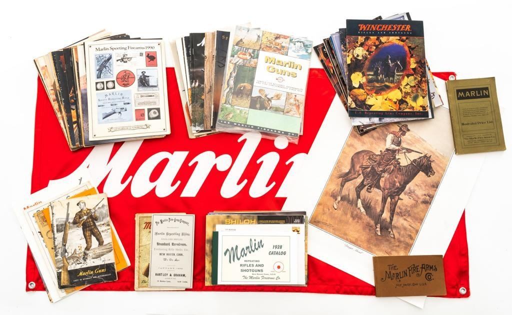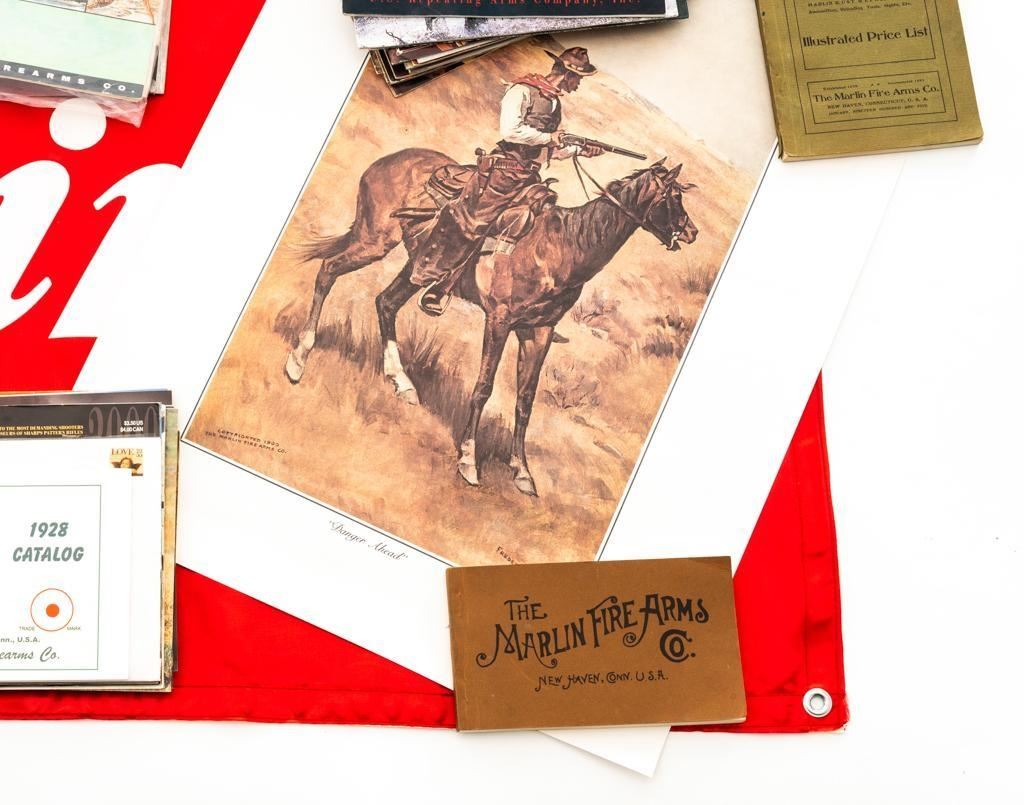 Bonanza Lot of Marlin Collectibles and Ephemera, includes: 1.) Marlin Firearms Collectors Association (MFCA) copy of Frederic Remington's iconic ''Danger Ahead'' print, measuring 23'' across and 17'' tall, in the original MFCA cardboard tube. The print is in excellent condition and ready for framing. 2.) Red and white satin ''Marlin'' Flag, measuring 45'' across and 24'' tall. The flag is as new in the original packaging. 3.) Lifetime collection of firearm catalogs and sales literature; primarily Marlin Firearms with additional literature and catalogs from Colt, Winchester, Savage, Ruger, H&R, and Weatherby, among others. The lot contains over 90 pieces with a nice mixture of original and reproduction documents chronicling American firearms from the late 19th century to present time. Long out of print and collectible, these items are a great source of information. Est.: $150-$300/lot.