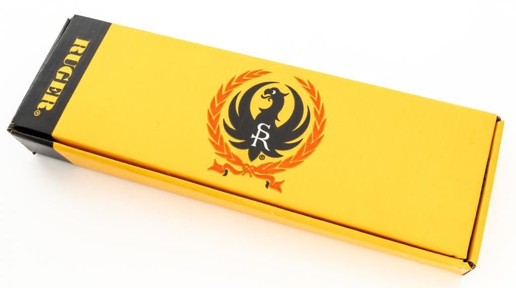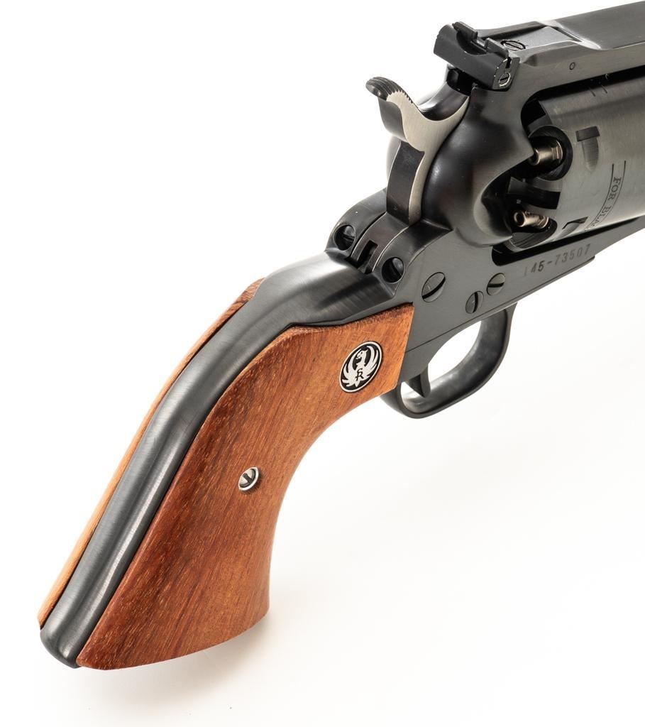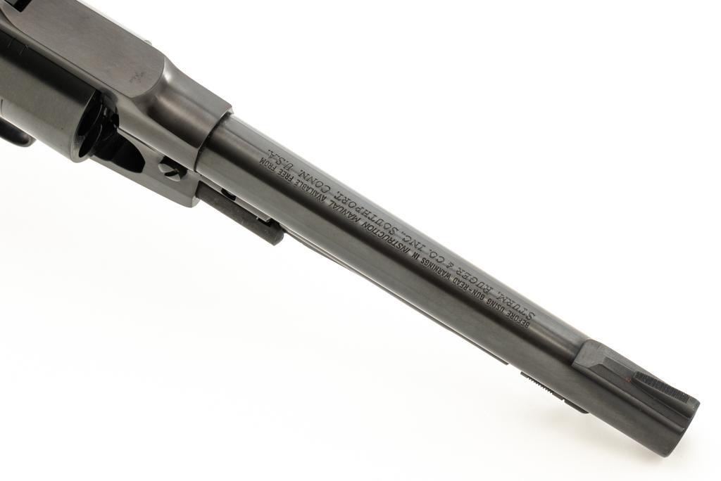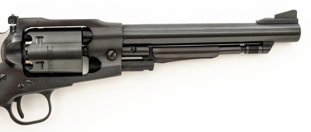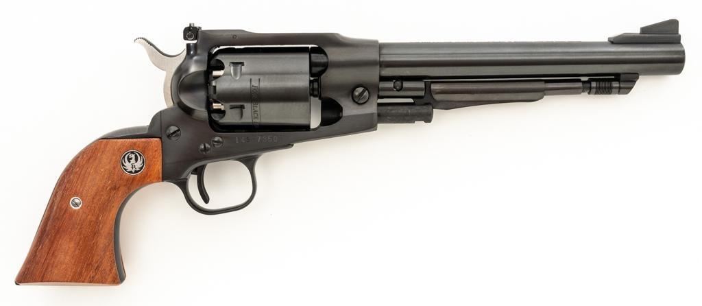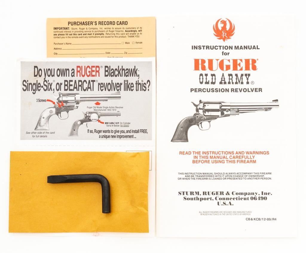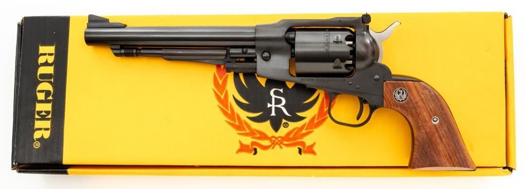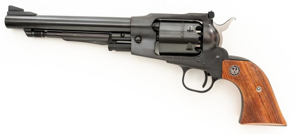 Ruger Old Army Black Powder Percussion Revolver, #145-73507, .44 cal., 7.5'' barrel, blue finish, smooth rosewood two-piece grips with Ruger medallions, ramped blade front and adjustable square-notch rear sight. Includes Ruger factory cardboard box with instruction manual, warranty card, and associated packaging materials. Mfg'd 1995. Revolver is excellent, appearing as new, showing little evidence of use. Action is crisp and locks up securely. Bore is mirror bright and may be unfired. Est.: $700-$900. (No FFL Required)