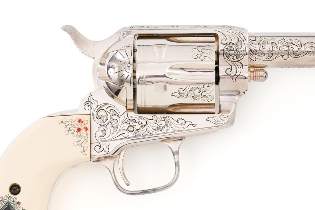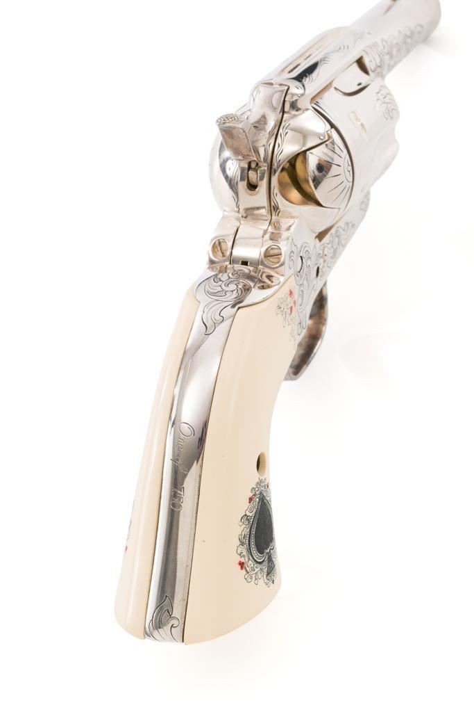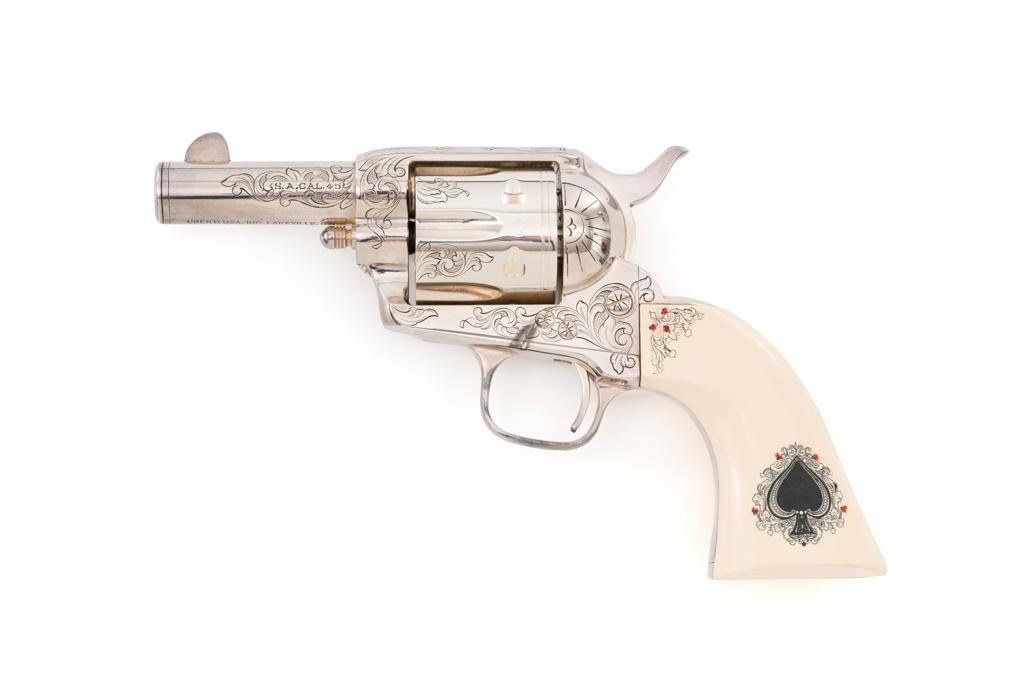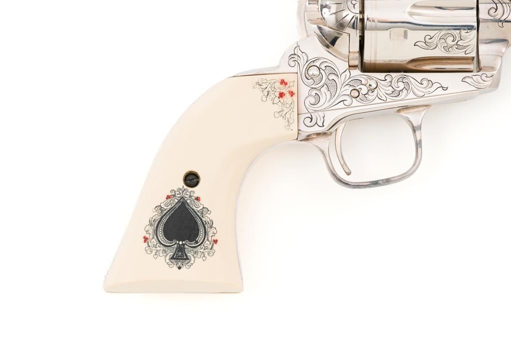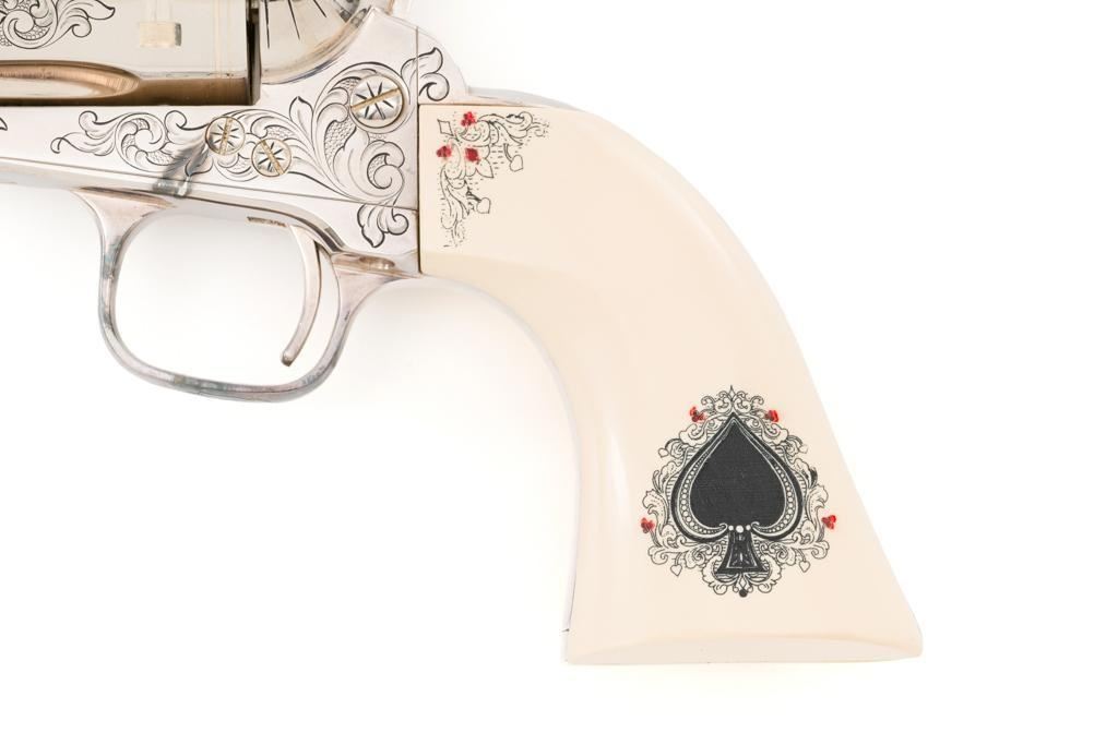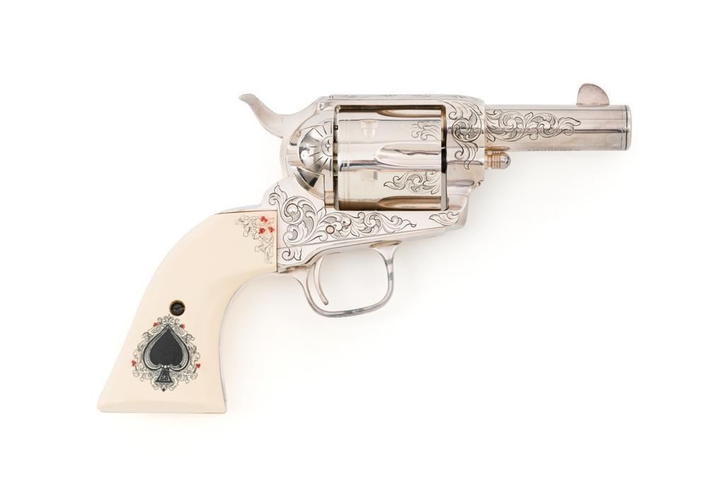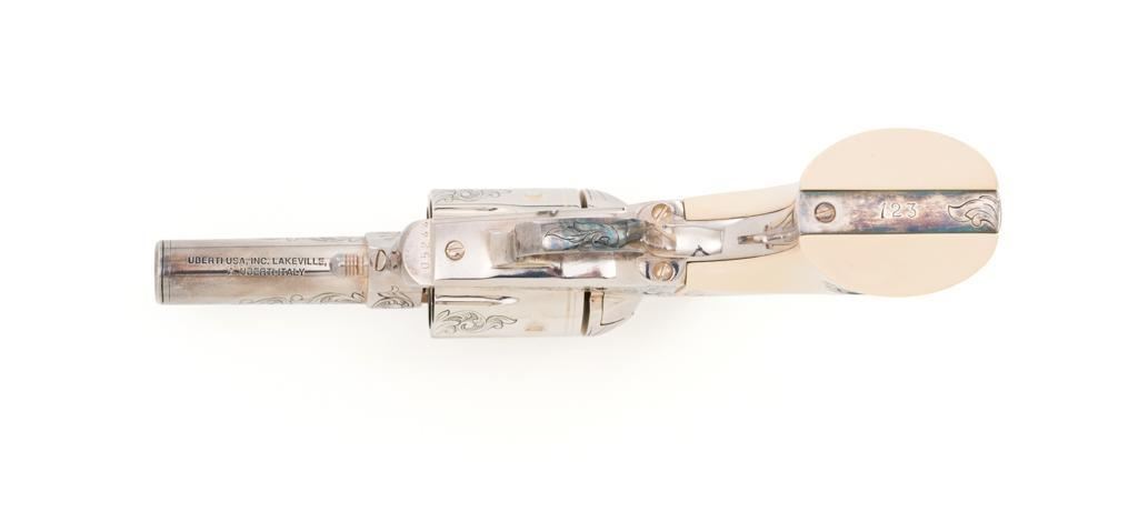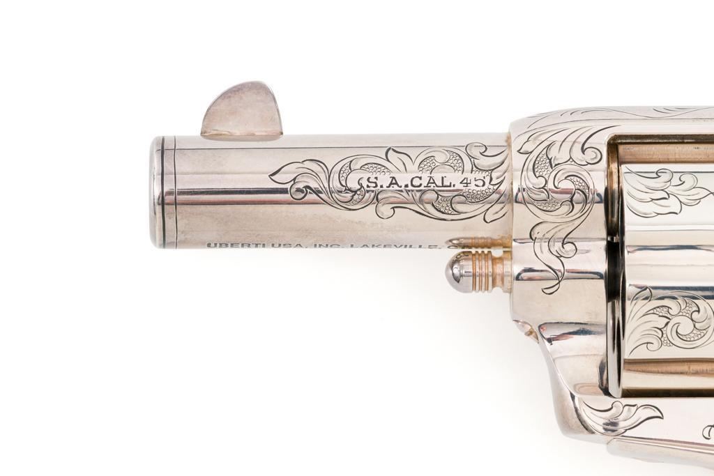 Engraved Uberti Model 1873 Sheriff's Model Gambler SAA Revolver, #05244, .45 Colt cal., 3'' barrel, nickel finish, scrimshawed faux ivory two-piece grips, blade front and fixed ''U''-notch rear sight, ejectorless. Barrel, frame, and cylinder with punch dot and scroll engraving. Marked ''A. UBERTI-ITALY'' on the underside of the barrel. Revolver is in excellent overall condition, with only light storage marks. Engraving and factory markings are crisp. Grips are excellent. Action is crisp. Bore is mirror bright with excellent rifling and appears to be unfired. Est. $600-$800. (Modern/PPT)