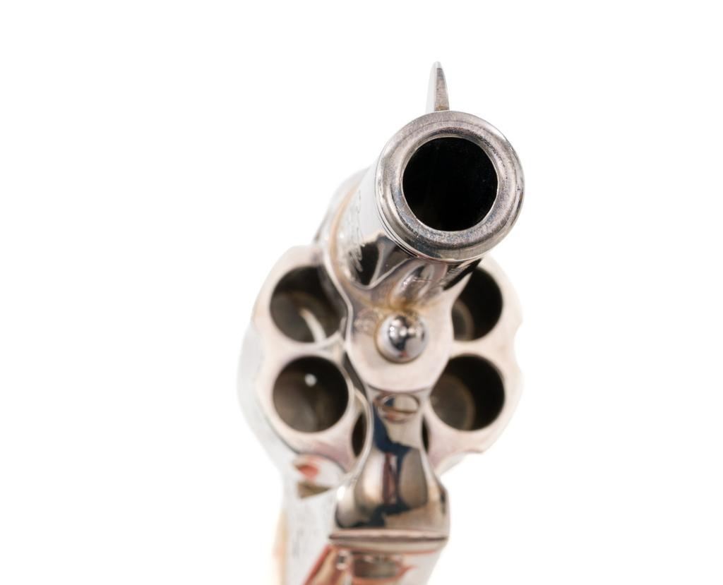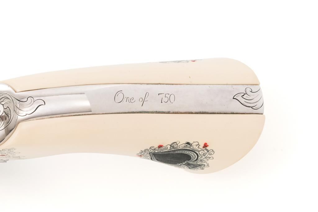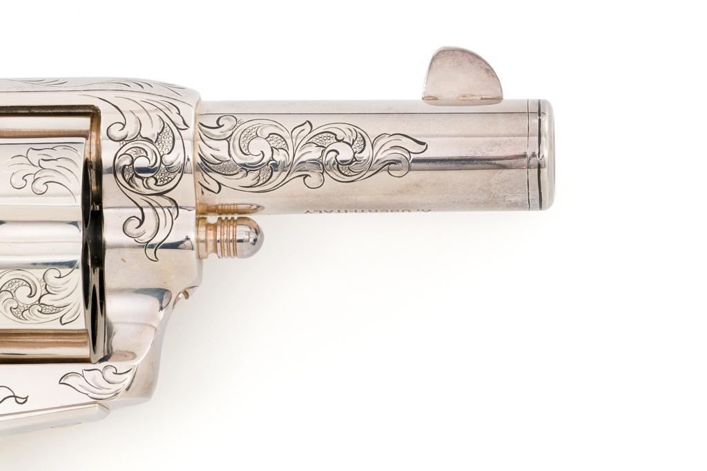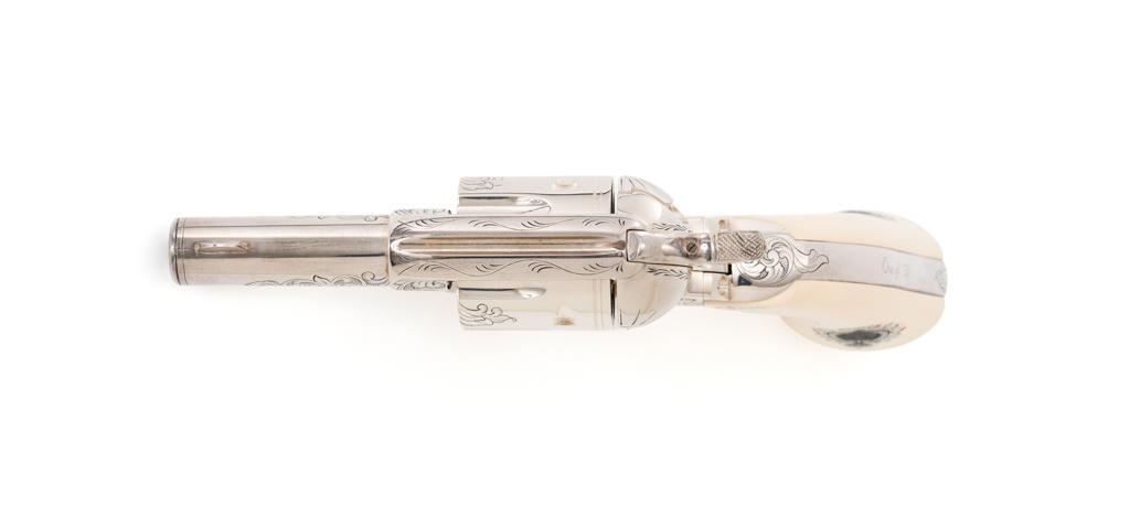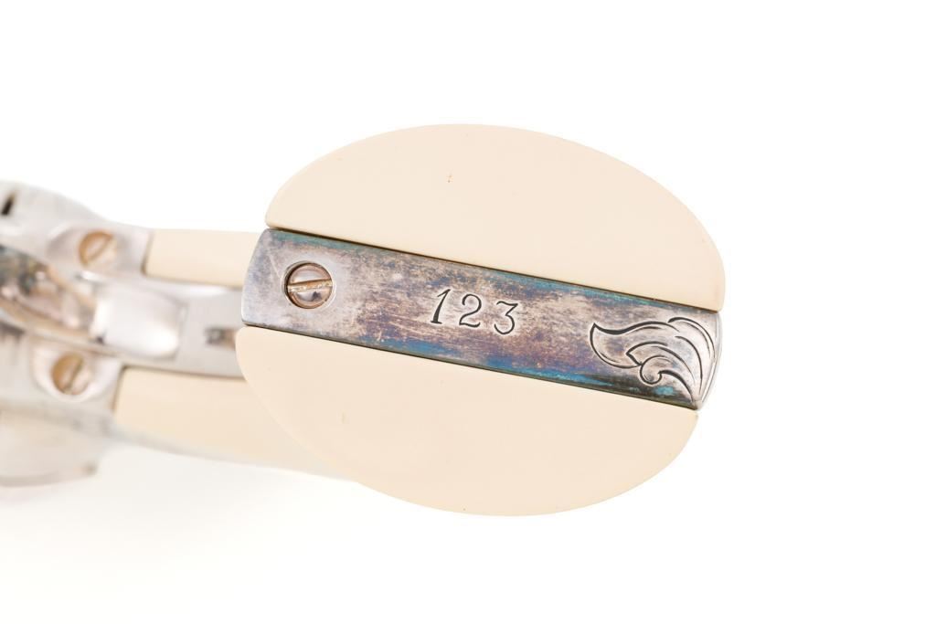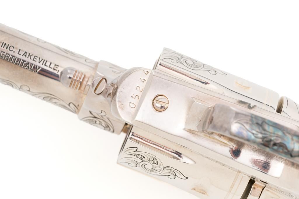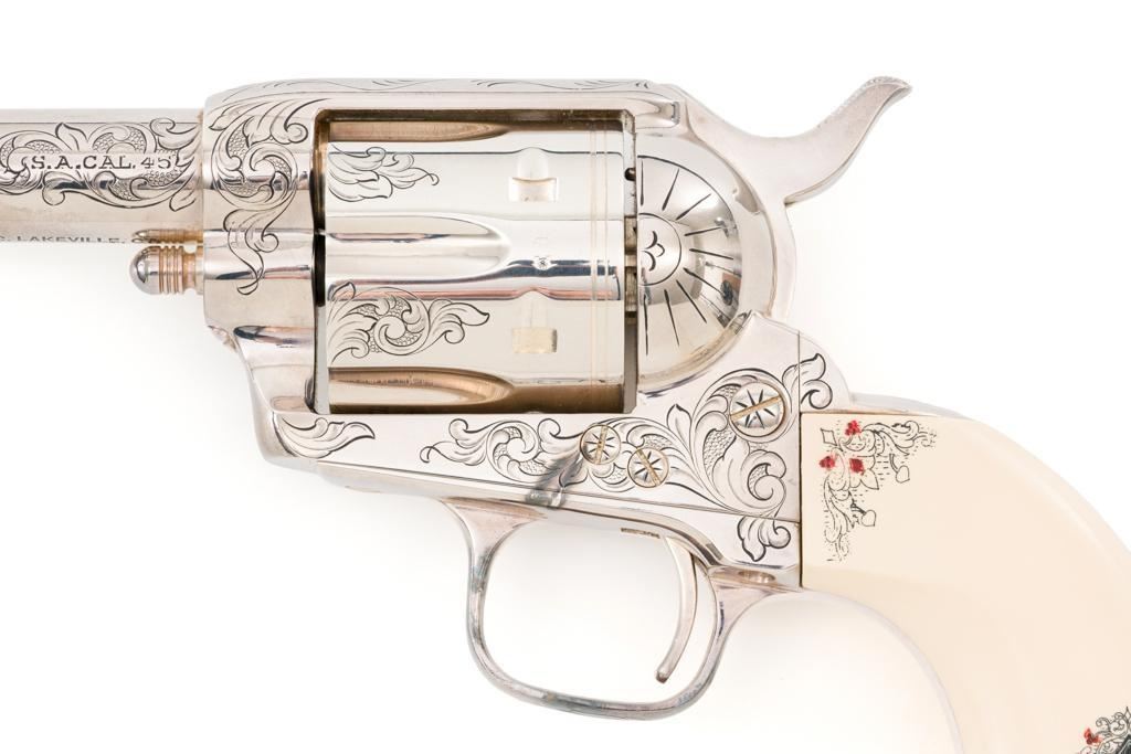 Engraved Uberti Model 1873 Sheriff's Model Gambler SAA Revolver, #05244, .45 Colt cal., 3'' barrel, nickel finish, scrimshawed faux ivory two-piece grips, blade front and fixed ''U''-notch rear sight, ejectorless. Barrel, frame, and cylinder with punch dot and scroll engraving. Marked ''A. UBERTI-ITALY'' on the underside of the barrel. Revolver is in excellent overall condition, with only light storage marks. Engraving and factory markings are crisp. Grips are excellent. Action is crisp. Bore is mirror bright with excellent rifling and appears to be unfired. Est. $600-$800. (Modern/PPT)