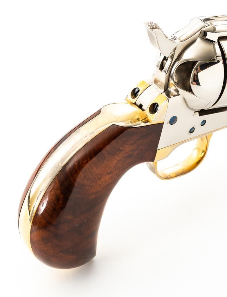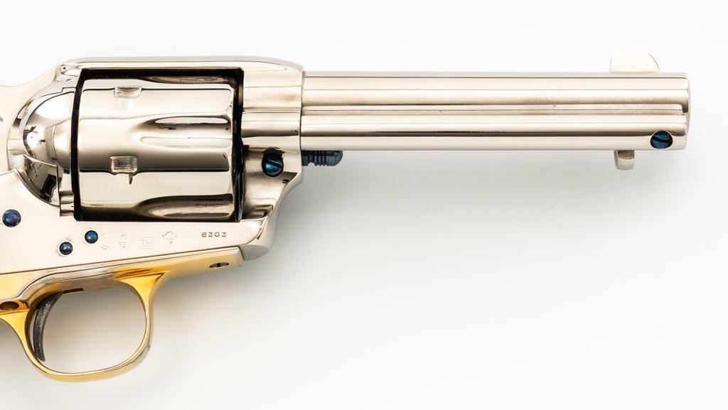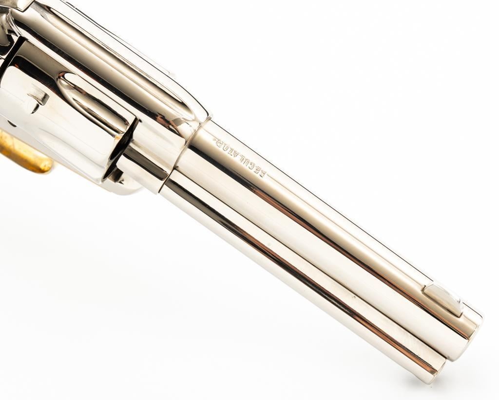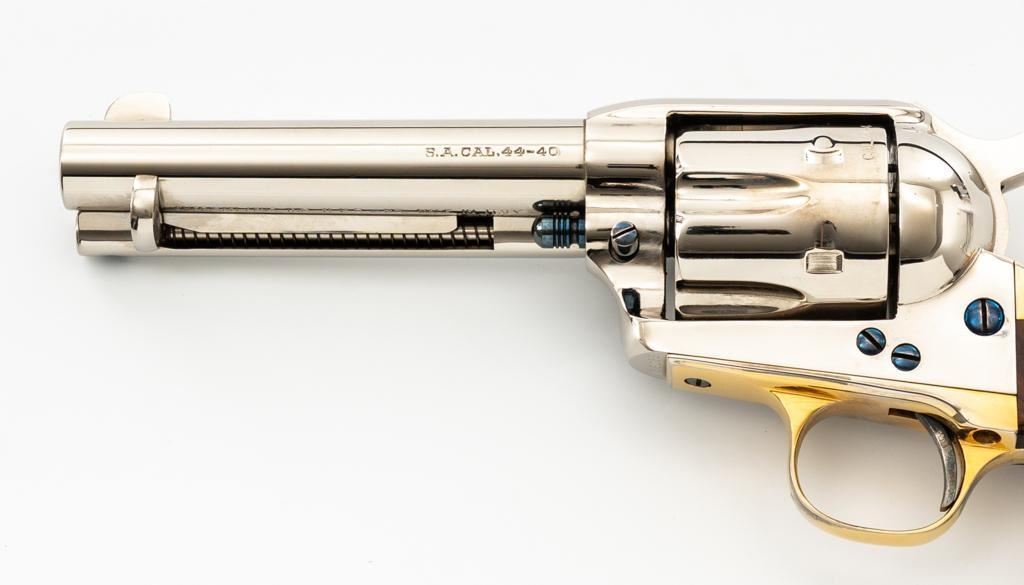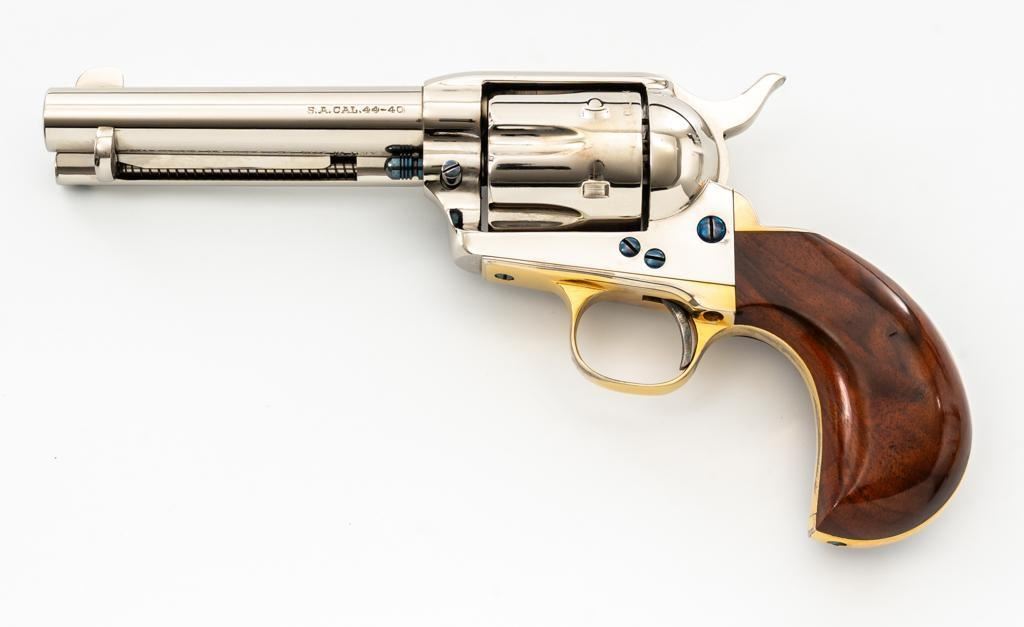 American Arms Inc. Regulator Model Single Action Revolver, #139053, .44-40 cal., 4.75'' barrel, nickel finish with nitre blue screws, gold colored trigger guard and backstrap. Smooth bird's head style hardwood grips, fixed blade front sight, and ''U''-notch rear sight. Mfg'd 1996. Condition of this revolver is near excellent, retaining approx. 99% nickel and nitre blue finish; showing wear to the gold color on the front and backstrap. Grips with intermittent shallow indentations and handing marks. Markings are sharp. Action is crisp. Bore is bright with excellent rifling. Est.: $350-$500. (Modern/PPT)