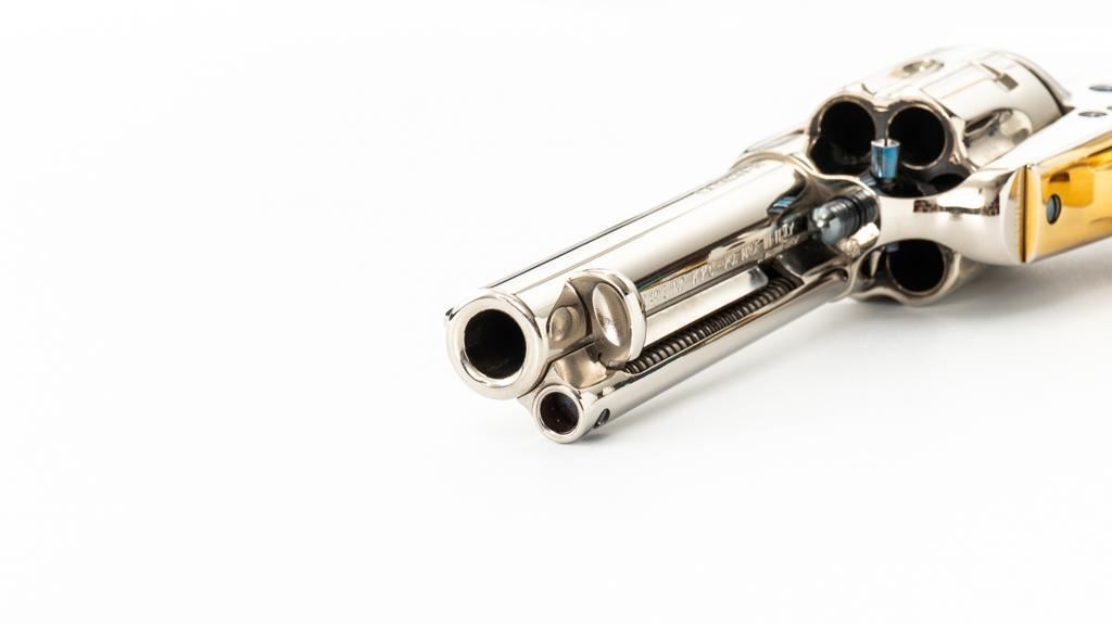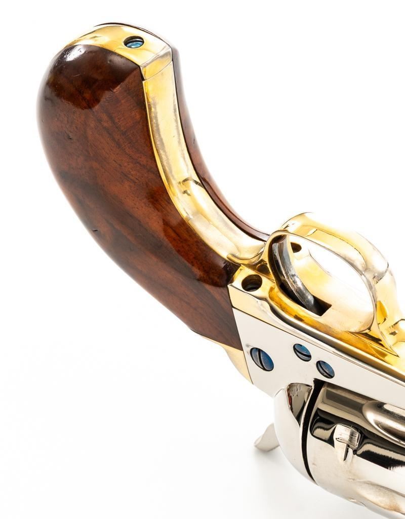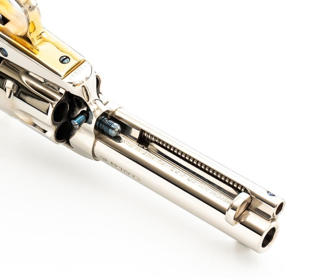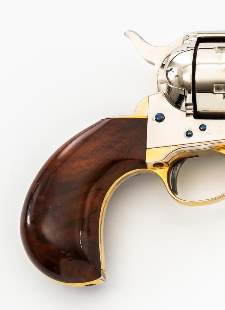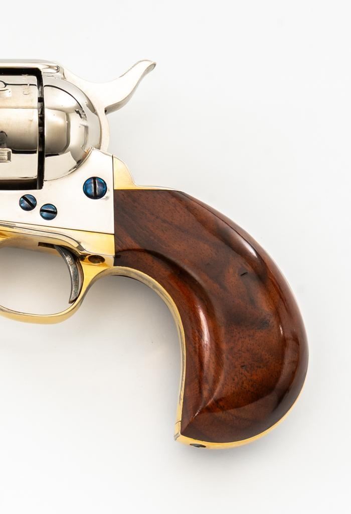 American Arms Inc. Regulator Model Single Action Revolver, #139053, .44-40 cal., 4.75'' barrel, nickel finish with nitre blue screws, gold colored trigger guard and backstrap. Smooth bird's head style hardwood grips, fixed blade front sight, and ''U''-notch rear sight. Mfg'd 1996. Condition of this revolver is near excellent, retaining approx. 99% nickel and nitre blue finish; showing wear to the gold color on the front and backstrap. Grips with intermittent shallow indentations and handing marks. Markings are sharp. Action is crisp. Bore is bright with excellent rifling. Est.: $350-$500. (Modern/PPT)