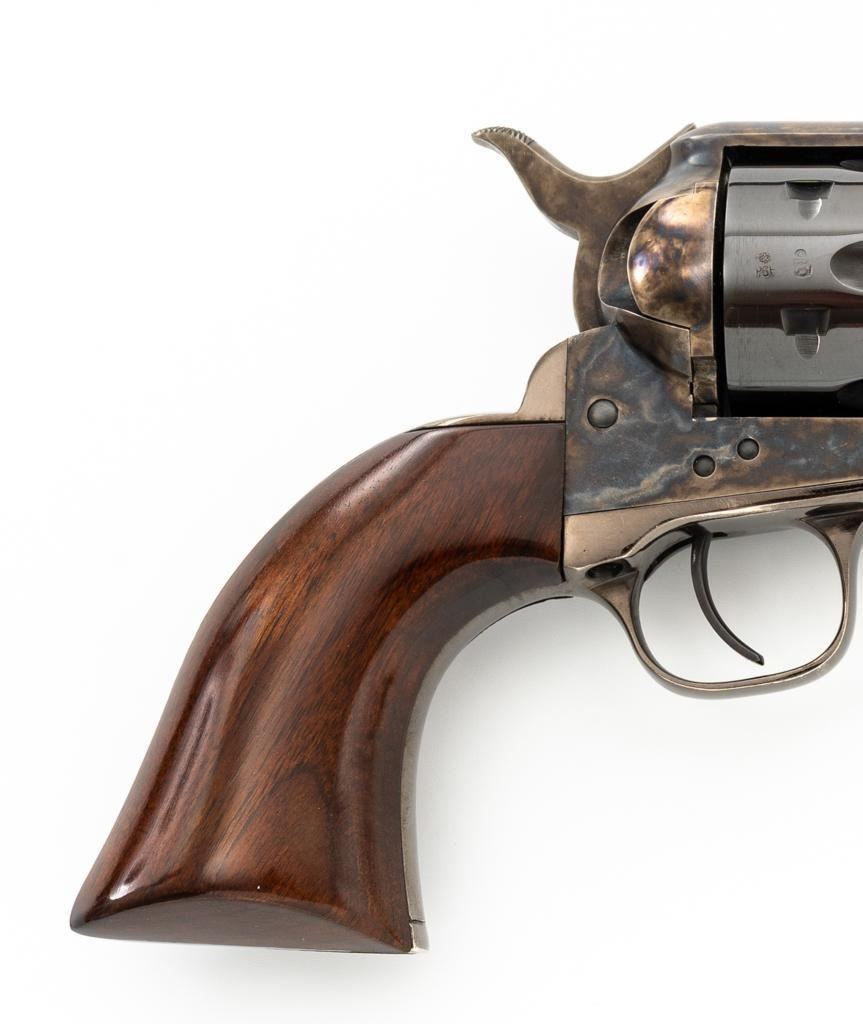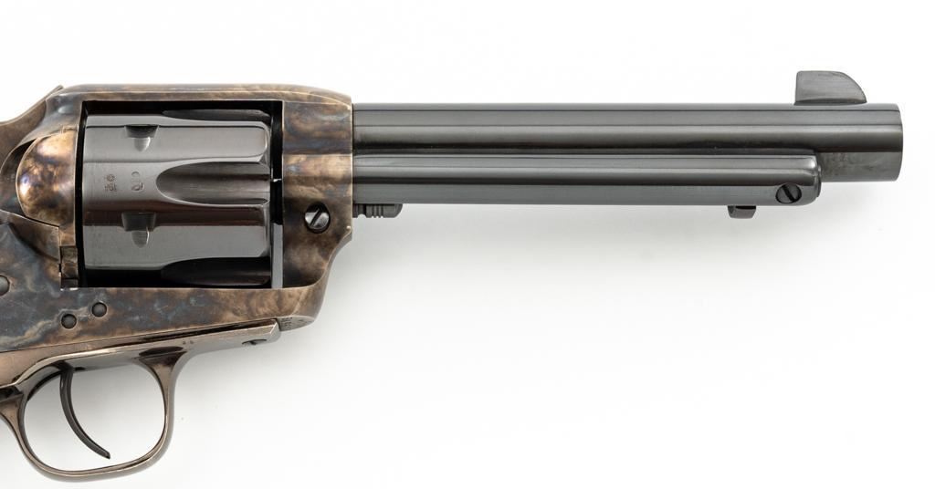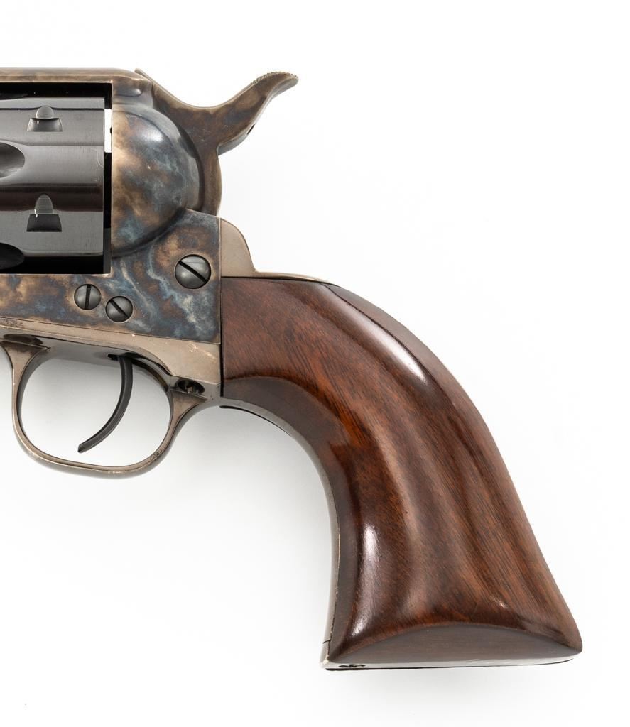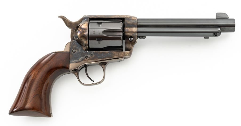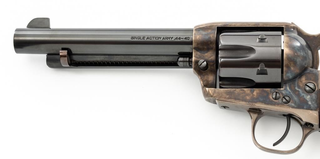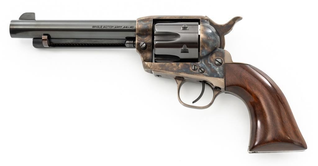 Italian Armi San Marco/EMF Single Action Army New Dakota Model Revolver, #SA9610, .44-40 cal., 5.5'' barrel, blue and case hardened finish, smooth finely grained hardwood grips, fixed blade front sight, and ''V''-notch rear sight. Condition of this revolver is excellent, retaining approx. 95% blue and vivid case colors; showing wear to the trigger guard and backstrap. Grips appear near new. Markings are sharp. Action is crisp. Bore is bright with excellent rifling. Est.: $350-$550. (Modern/PPT)