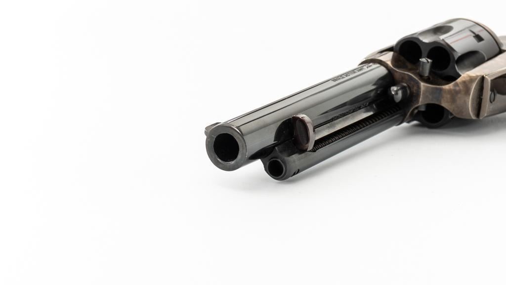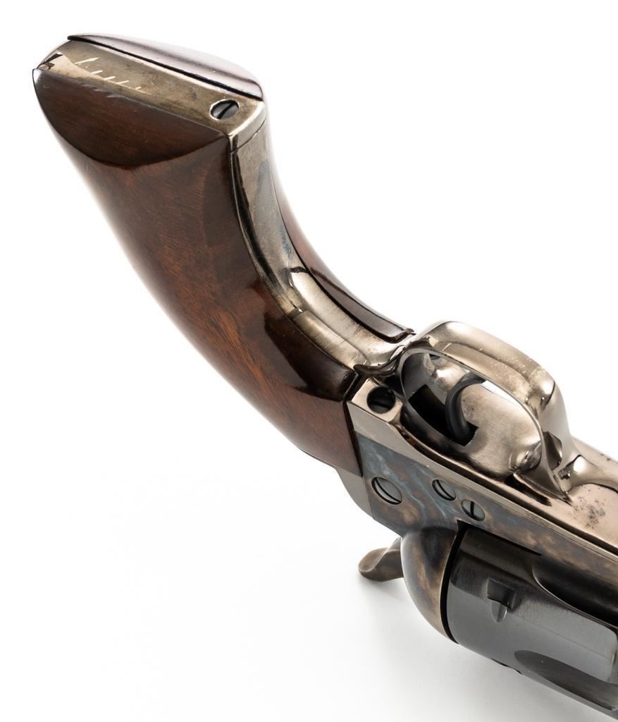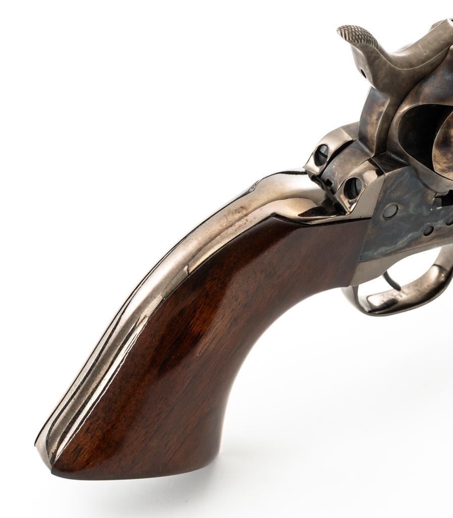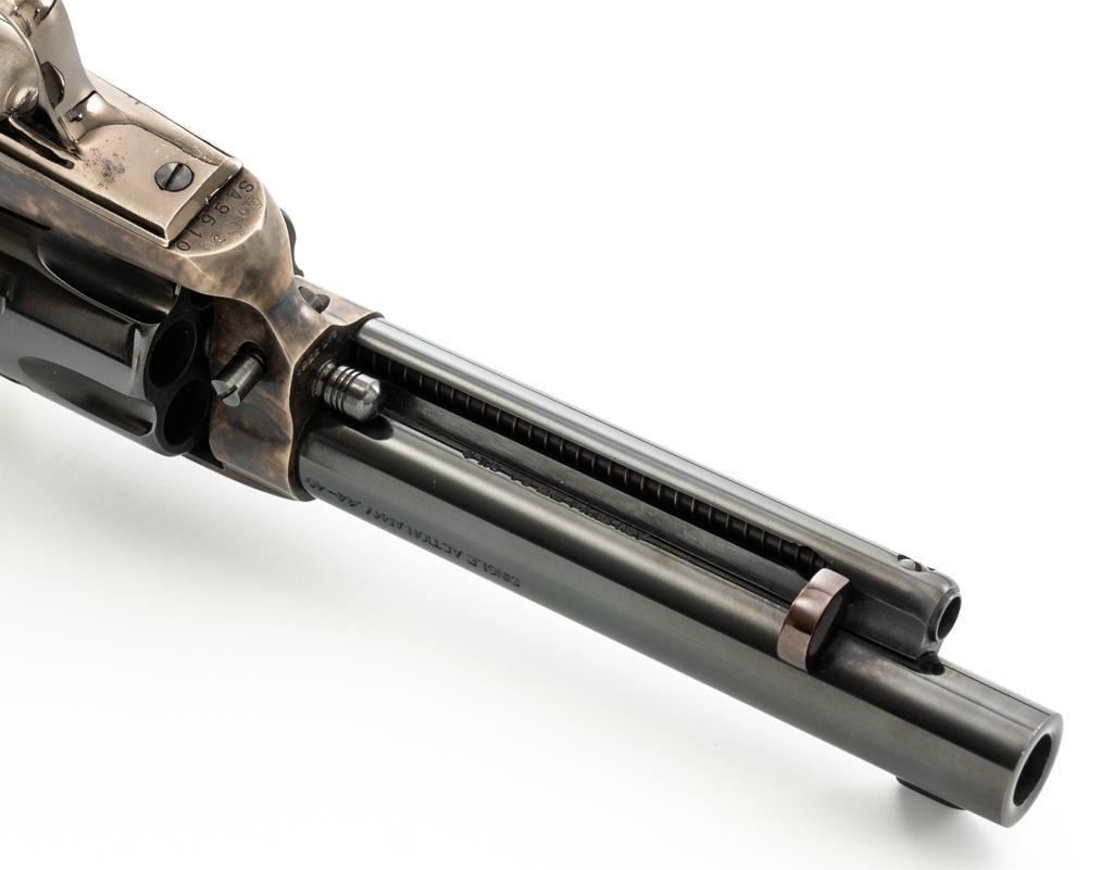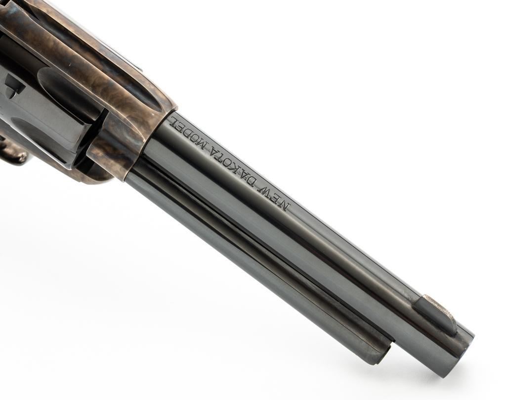 Italian Armi San Marco/EMF Single Action Army New Dakota Model Revolver, #SA9610, .44-40 cal., 5.5'' barrel, blue and case hardened finish, smooth finely grained hardwood grips, fixed blade front sight, and ''V''-notch rear sight. Condition of this revolver is excellent, retaining approx. 95% blue and vivid case colors; showing wear to the trigger guard and backstrap. Grips appear near new. Markings are sharp. Action is crisp. Bore is bright with excellent rifling. Est.: $350-$550. (Modern/PPT)