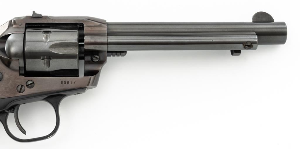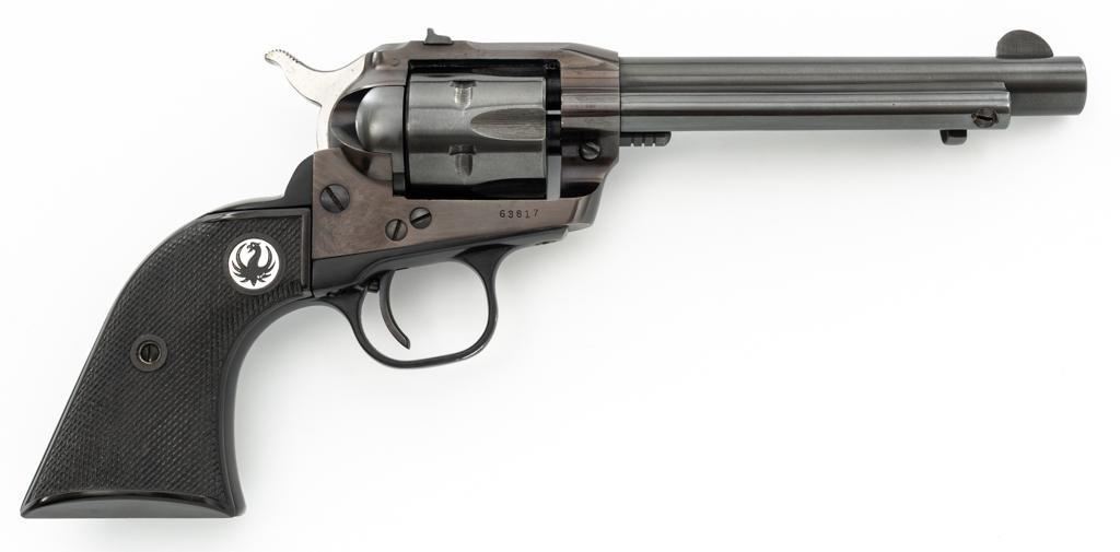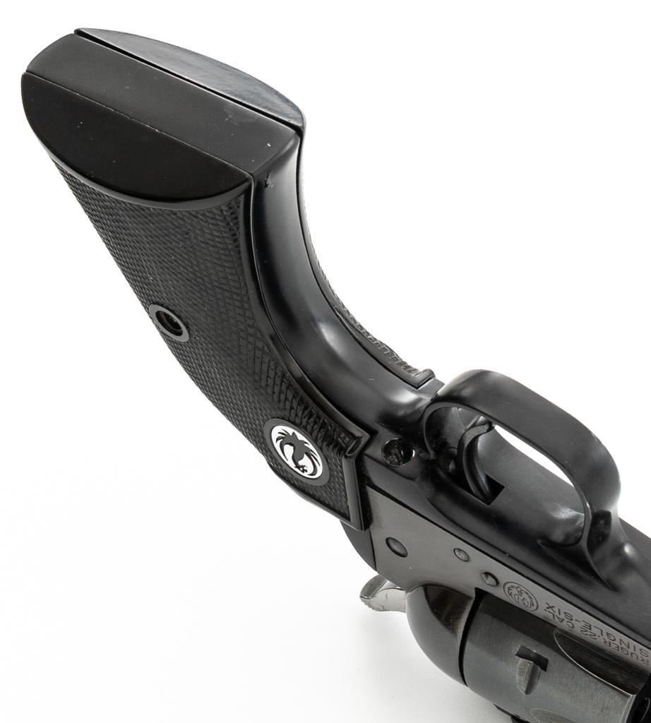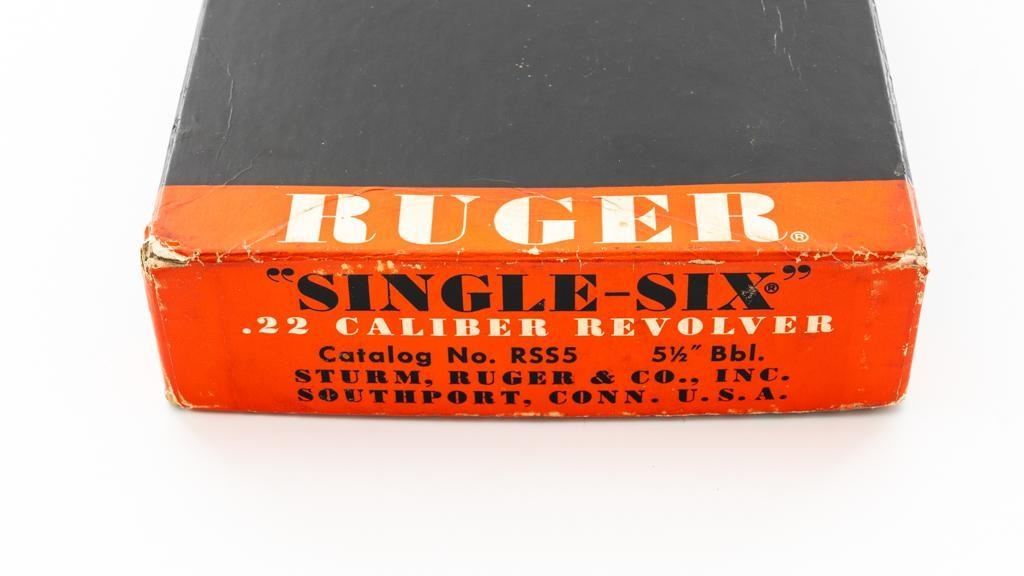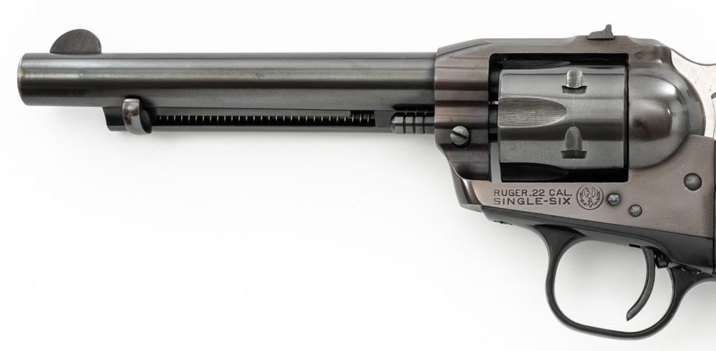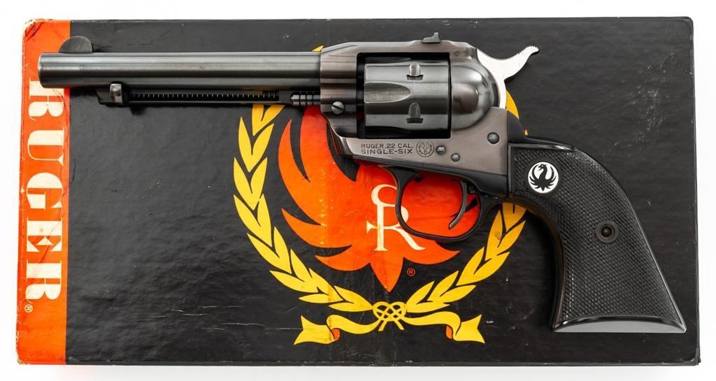 Early Ruger Single-Six Single Action Revolver, #63817, .22 LR cal., 5.5'' barrel, blue finish, checkered hard rubber two-piece grip with Ruger medallions, blade front and drift adjustable square-notch rear sight. Pre-hammer block safety. Includes Ruger factory two-piece cardboard box, in very good condition with corner wear, small pieces of cellophane tape, and scuffs. Mfg'd 1957. Revolver is in near excellent overall condition, retaining approx. 97%-98% factory finish, with holster wear at the muzzle, along the ejector rod housing and at the high points. Cylinder shows light leading edgewear and faint index line. Grips are in excellent condition with sharp checkering detail. Action functions smoothly and locks up securely. Bore is bright with crisp rifling. Est.: $400-$600. (C&R)