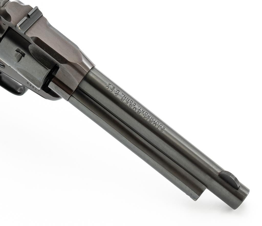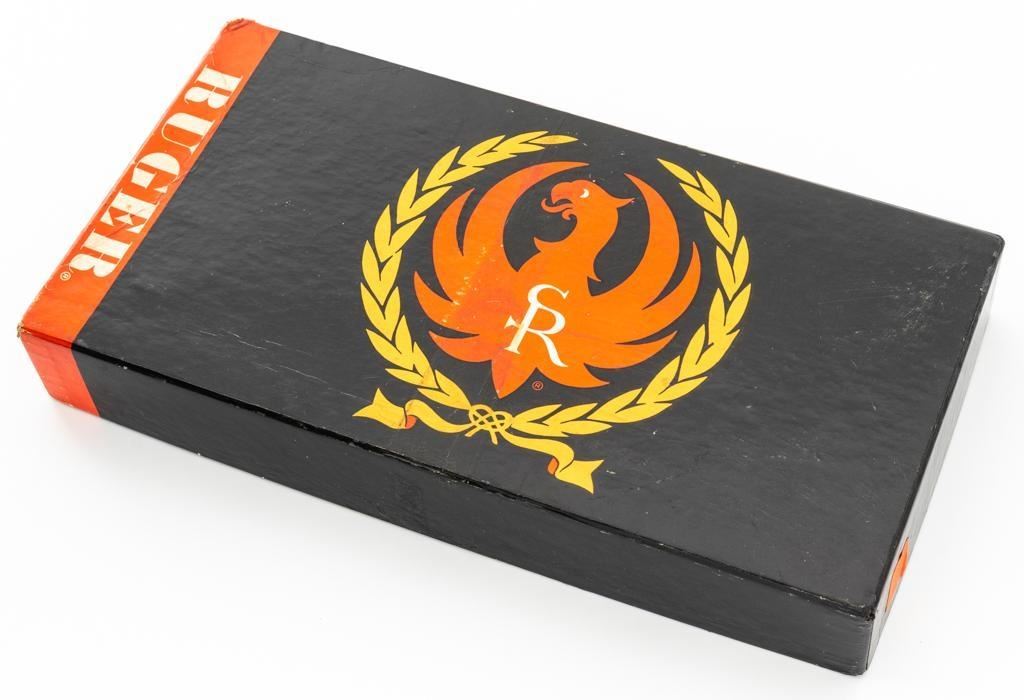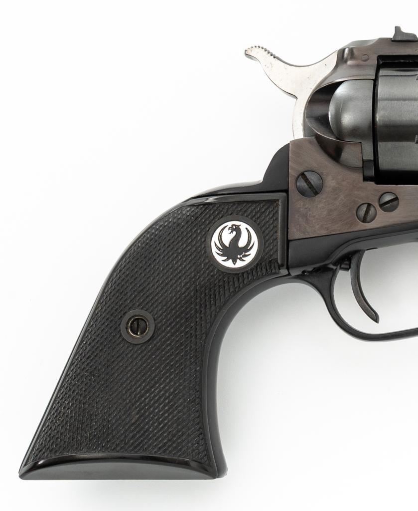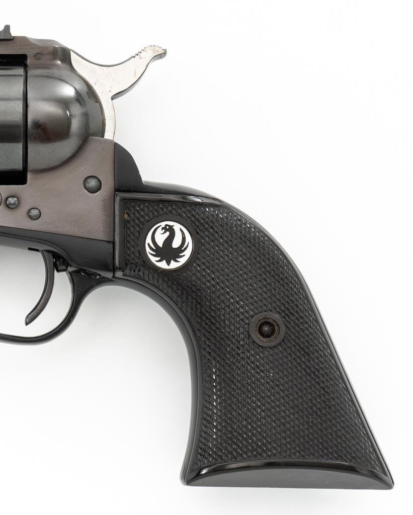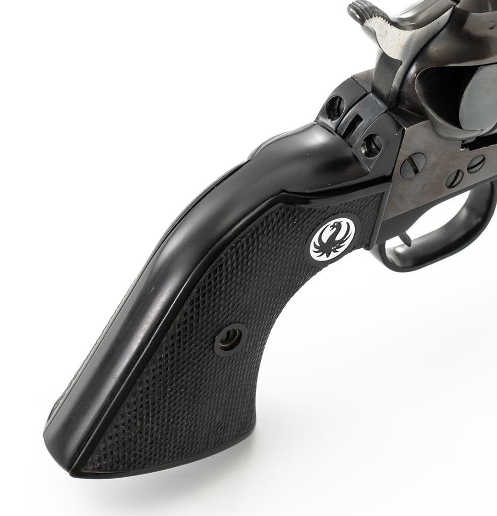 Early Ruger Single-Six Single Action Revolver, #63817, .22 LR cal., 5.5'' barrel, blue finish, checkered hard rubber two-piece grip with Ruger medallions, blade front and drift adjustable square-notch rear sight. Pre-hammer block safety. Includes Ruger factory two-piece cardboard box, in very good condition with corner wear, small pieces of cellophane tape, and scuffs. Mfg'd 1957. Revolver is in near excellent overall condition, retaining approx. 97%-98% factory finish, with holster wear at the muzzle, along the ejector rod housing and at the high points. Cylinder shows light leading edgewear and faint index line. Grips are in excellent condition with sharp checkering detail. Action functions smoothly and locks up securely. Bore is bright with crisp rifling. Est.: $400-$600. (C&R)