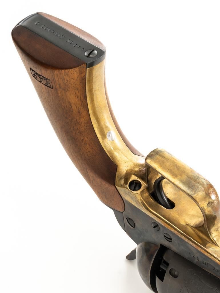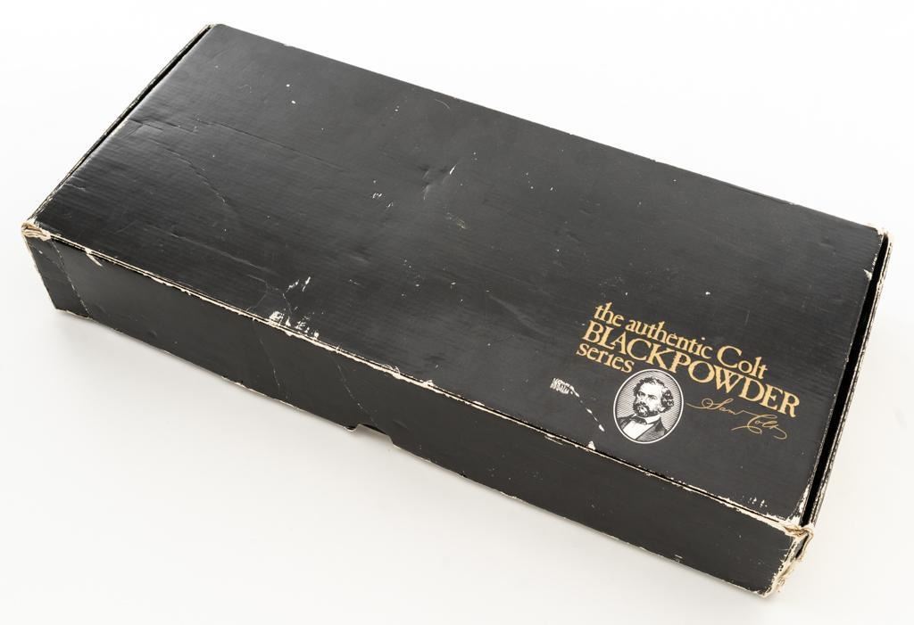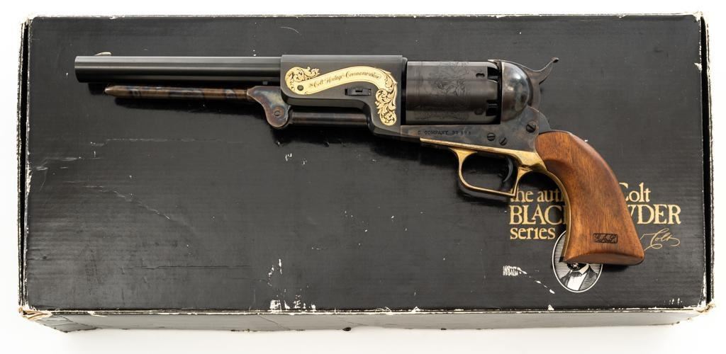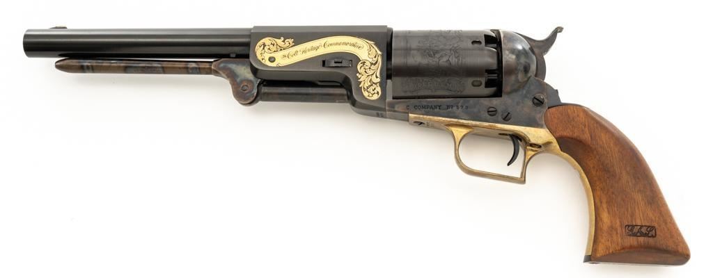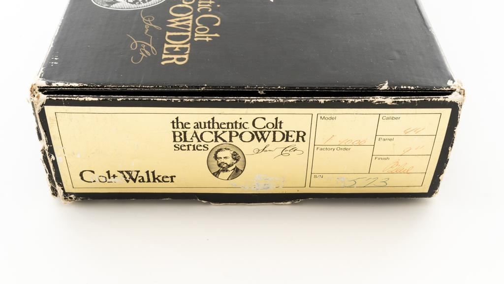 Colt Black Powder Series Walker Colt Heritage Model Black Powder Percussion Revolver, #573, .44 cal., 9'' barrel, blued with color case hardened frame, brass squareback trigger guard, color case hardened loading lever, smooth walnut two-piece grips, German silver blade front sight, and V-notched hammer rear sight. Factory markings are clear with a crisp Texas Ranger & Indian cylinder scene. ''C COMPANY'' is marked on the frame, straps, and trigger guard. Left barrel lug embossed with ''Colt Heritage Commemorative'' in a gold banner. Includes factory box with matching end label, showing tatters and wear at the corners and flaps. Mfg circa 1980-81. Revolver is as new in the factory box, appearing unfired, with only a few minor handling marks. Frame and loading lever display vivid color case hardened finish. Grips are in excellent condition with crisp cartouches. Action is crisp with a mirror bright bore. Limited to a production of 1,853 revolvers. Est.: $600-$800. (No FFL Required)