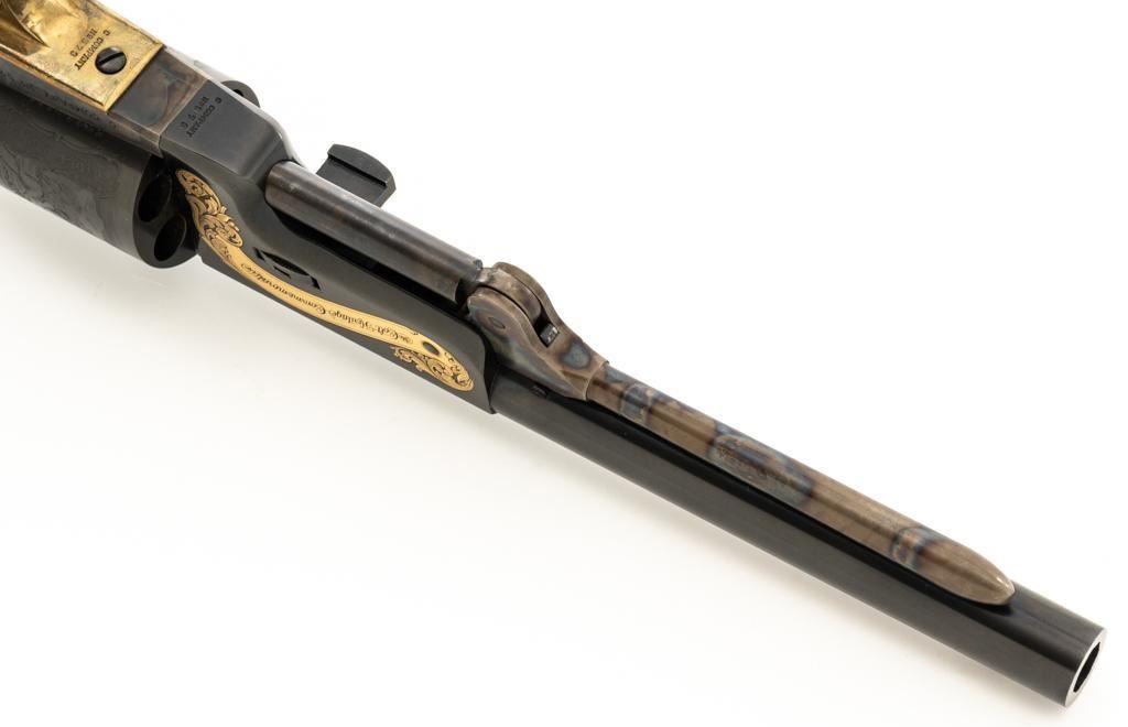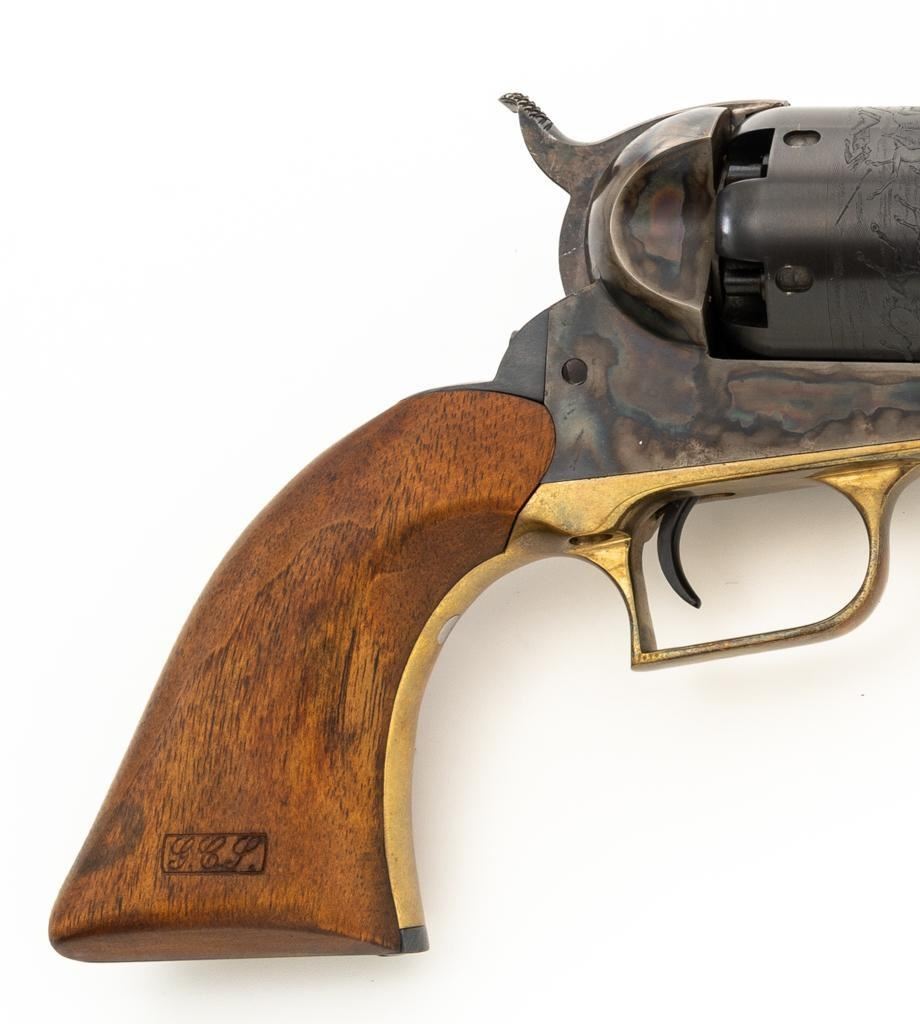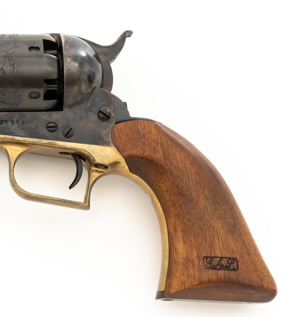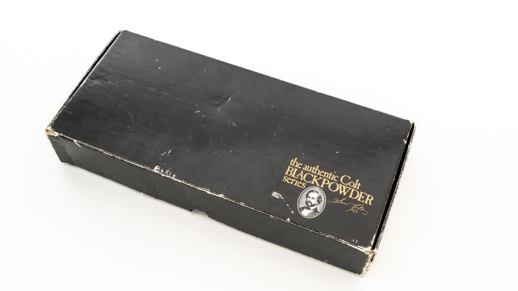 Colt Black Powder Series Walker Colt Heritage Model Black Powder Percussion Revolver, #573, .44 cal., 9'' barrel, blued with color case hardened frame, brass squareback trigger guard, color case hardened loading lever, smooth walnut two-piece grips, German silver blade front sight, and V-notched hammer rear sight. Factory markings are clear with a crisp Texas Ranger & Indian cylinder scene. ''C COMPANY'' is marked on the frame, straps, and trigger guard. Left barrel lug embossed with ''Colt Heritage Commemorative'' in a gold banner. Includes factory box with matching end label, showing tatters and wear at the corners and flaps. Mfg circa 1980-81. Revolver is as new in the factory box, appearing unfired, with only a few minor handling marks. Frame and loading lever display vivid color case hardened finish. Grips are in excellent condition with crisp cartouches. Action is crisp with a mirror bright bore. Limited to a production of 1,853 revolvers. Est.: $600-$800. (No FFL Required)