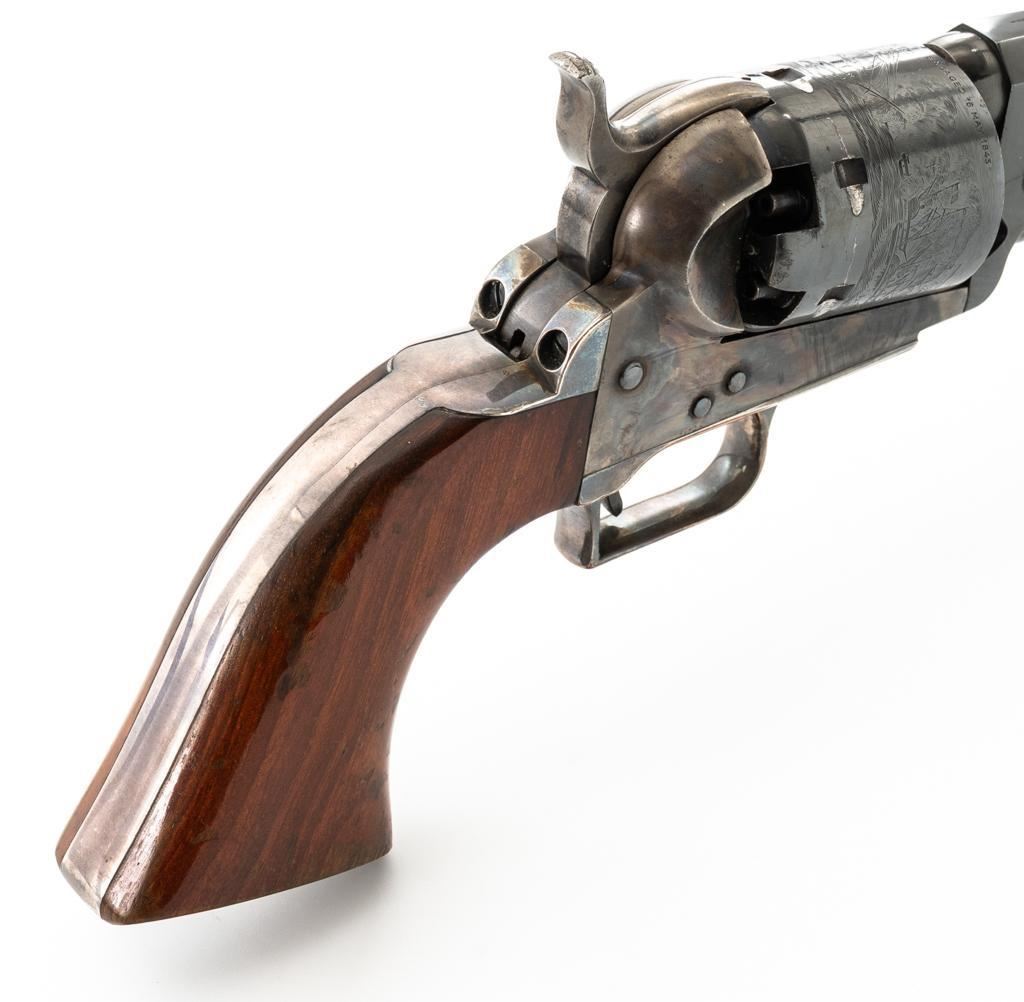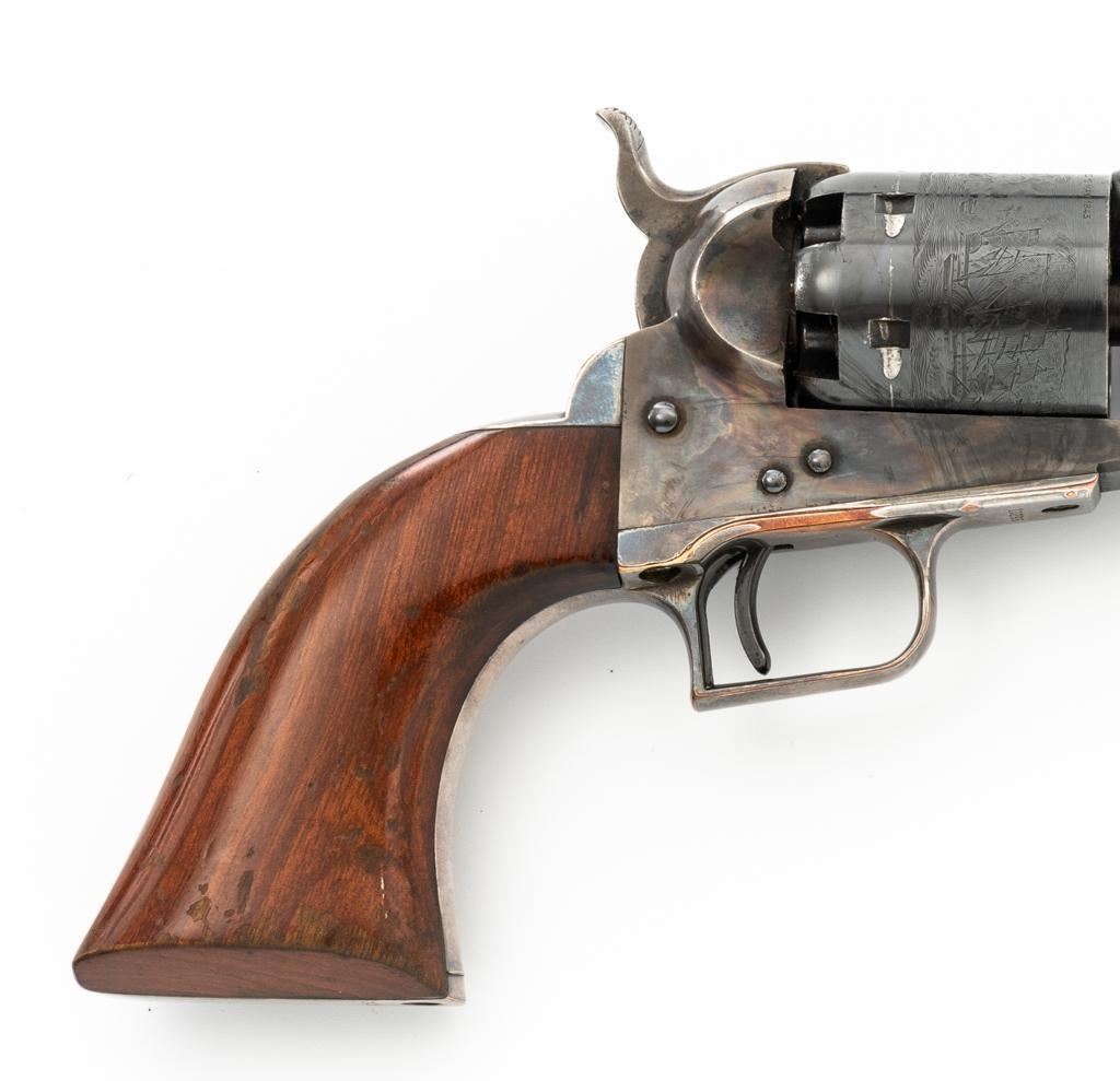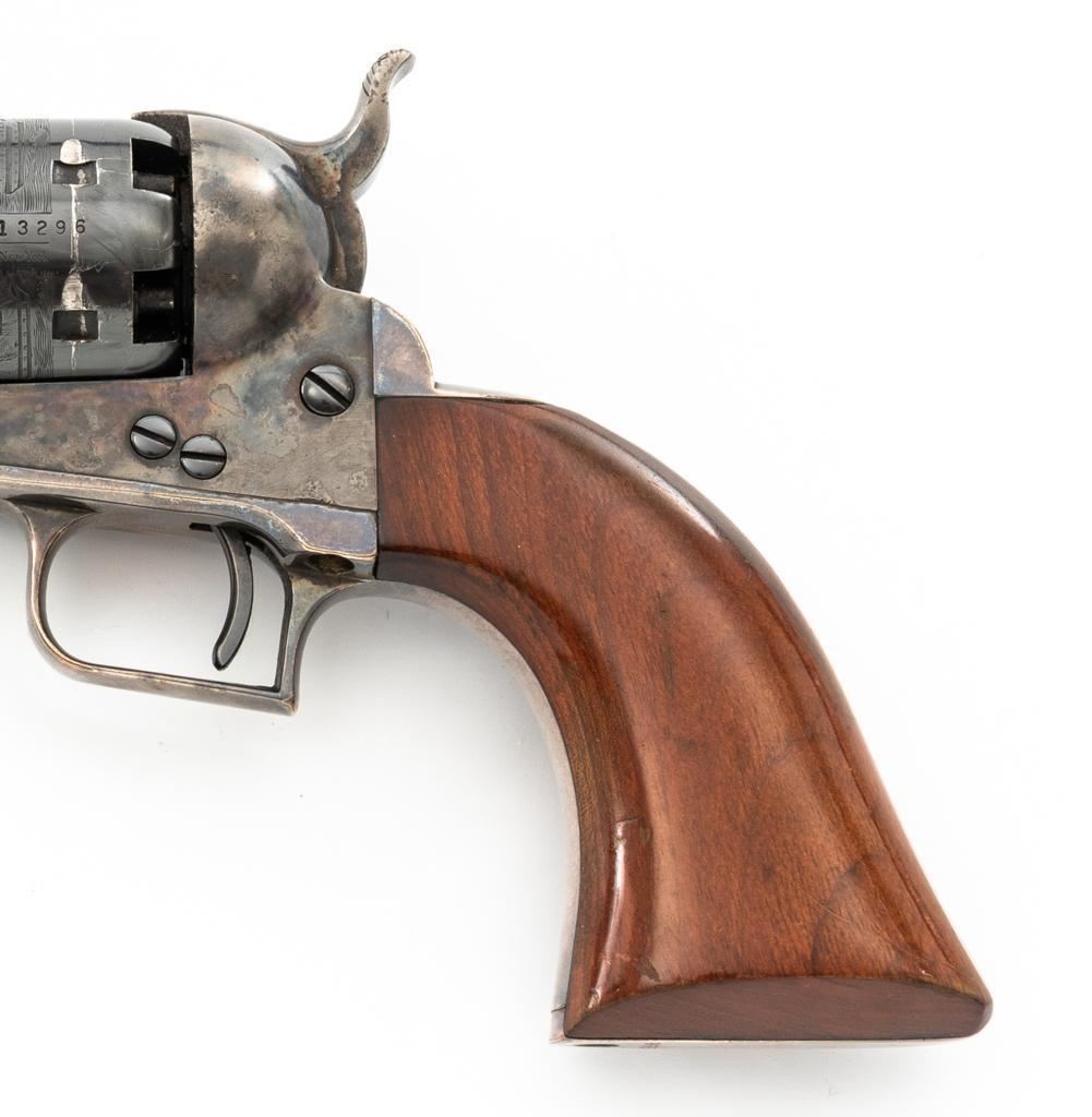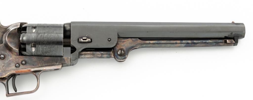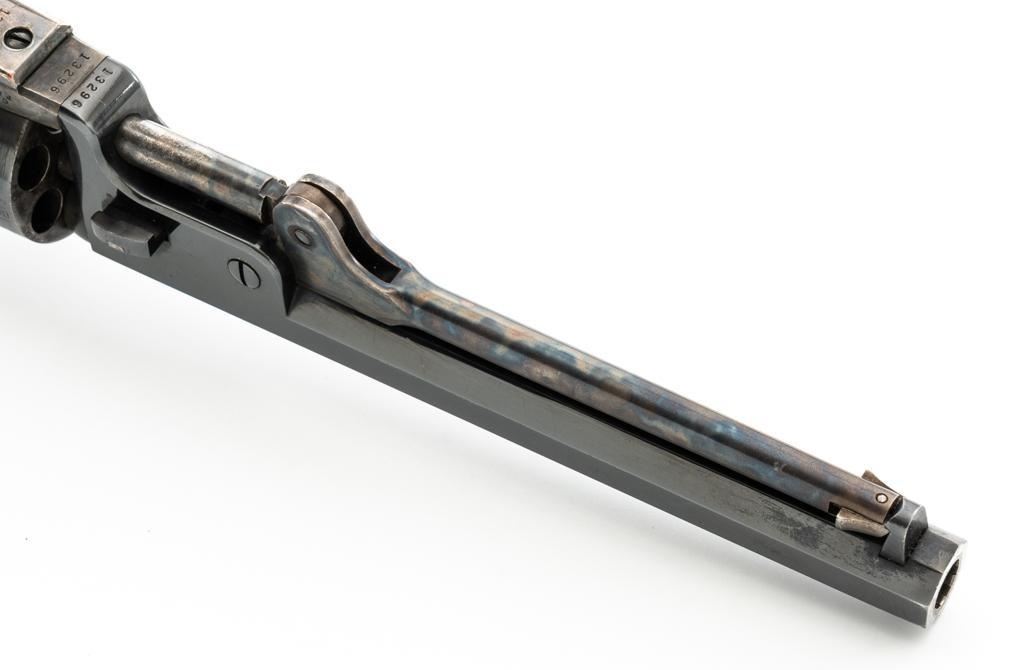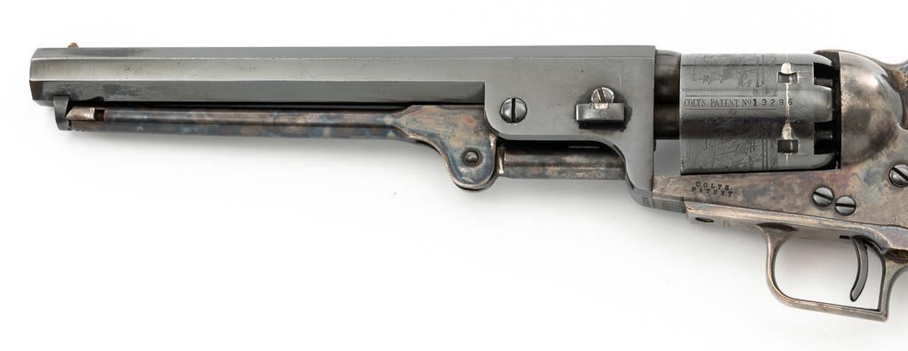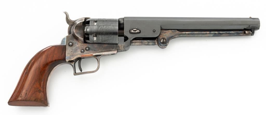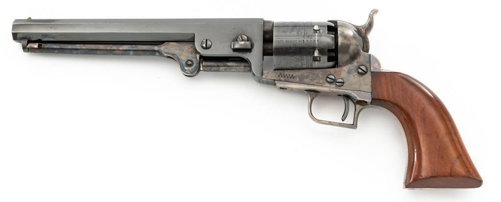Colt Model 1851 Navy ''C'' Series Black Powder Percussion Revolver, #13296, .36 cal, 7.5'' octagon barrel, blue with silver plated brass grip frame; color case hardened loading lever, hammer, and receiver; smooth walnut two-piece grips, square back trigger guard, brass cone front, and fixed ''V''-notch rear sight located on the hammer face. Cylinder with naval battle scene; matching numbers. Mfg'd from 1971-1978. Revolver is in very good+ overall condition, retaining approx. 96% factory blue with scattered light scratches, leading edgewear, and light index line on the cylinder. Frame, lever, and hammer all display smoky gray color case hardened finish. Grip frame retains majority of the silver plate, with some brass peeking through by the trigger guard. Grips are in near excellent condition with some light flaking to the finish. Action functions smoothly. Bore is excellent, showing little evidence of use. Est.: $400-$600. (No FFL required)