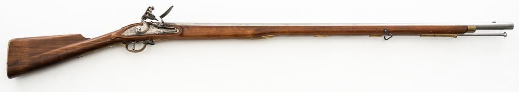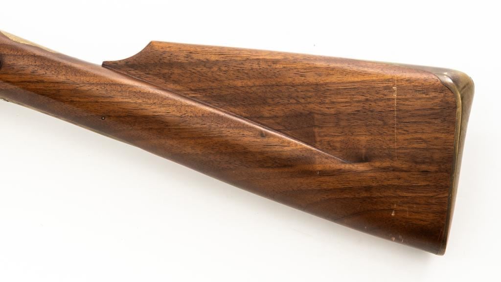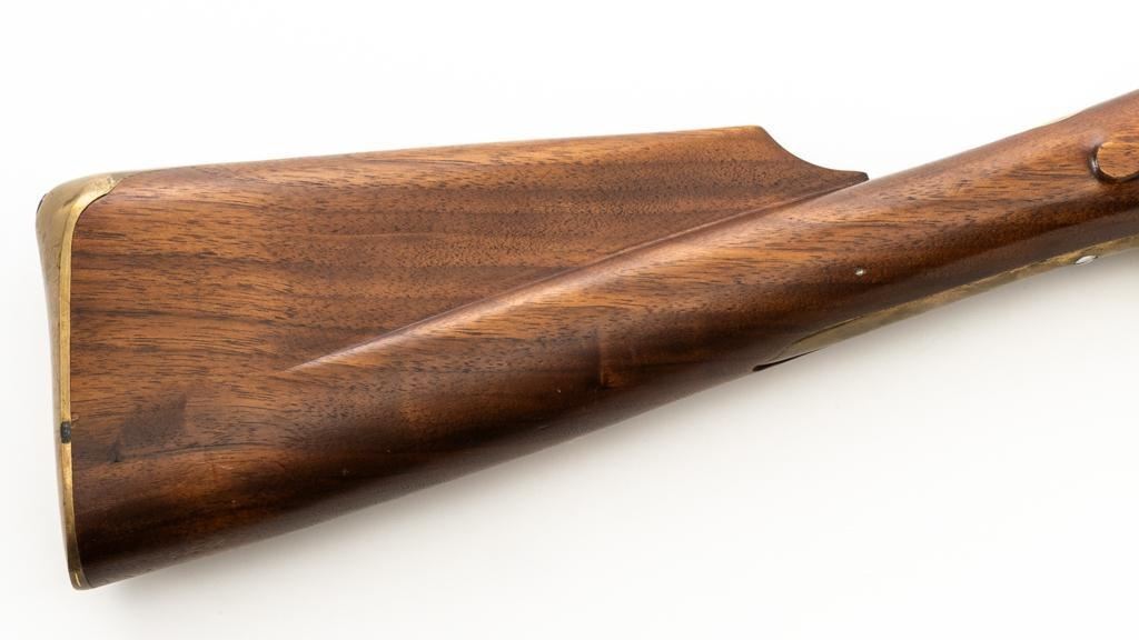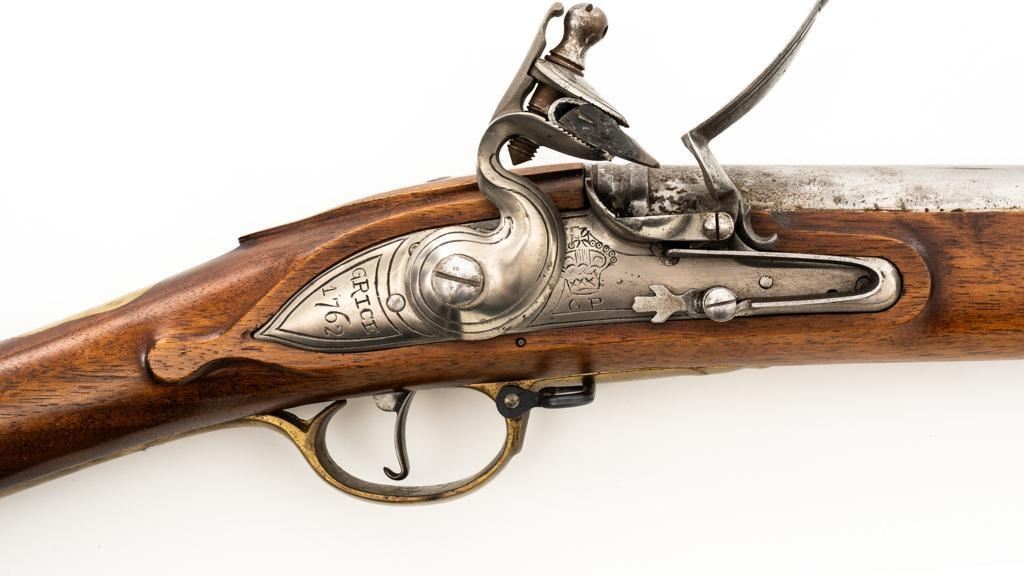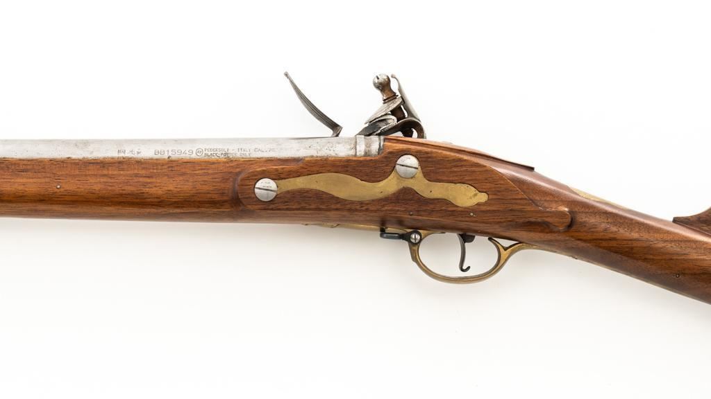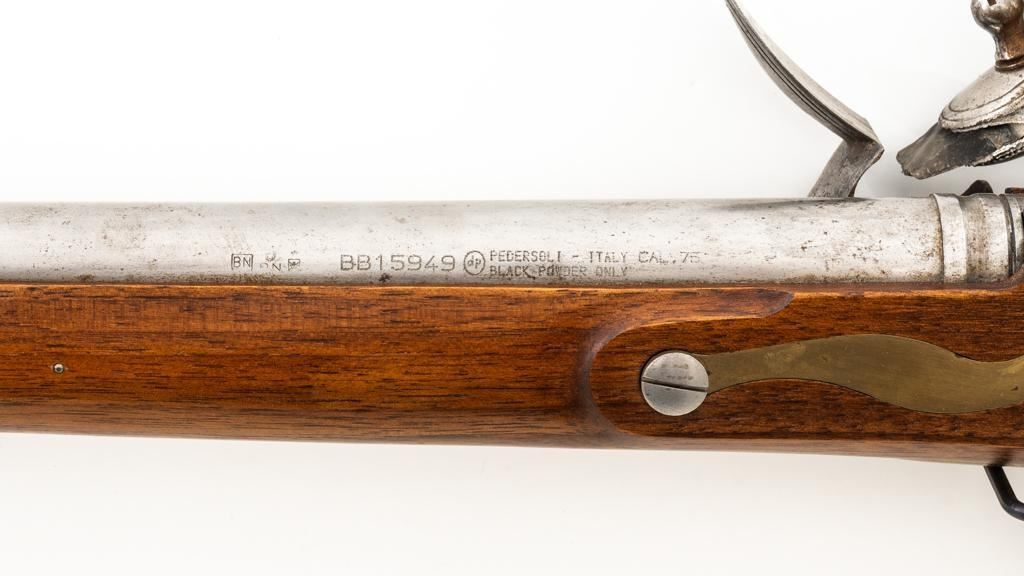 Pedersoli Grice 1762 Brown Bess Flintlock Musket, #BB15949, .75 cal., 42'' smoothbore barrel, bright finish. The hardwood stock has raised aprons behind barrel tang and on the sideplate, and there is a brass escutcheon mounted to top of the stock wrist. No sights. Barrel with a square bayonet lug behind the muzzle. Steel rammer is mounted in four pipes located under the barrel. Left side of the barrel is marked ''PEDERSOLI-ITALY CAL.75/BLACK POWDER ONLY'', with proof and inspection stamps. Lock is engraved ''GRICE 1762'' and ''(Crown)G.R.''. Condition is near excellent overall, barrel is in the white and shows scattered spots of fine pitting and moderate patina at the breech. Hammer assembly has darker toning and patina, with scratches to the steel striker. Stock with scattered moderate scratches and handling marks, located primarily on the buttstock. Action operates smoothly; hammer holds on half and full cock. Bore is bright with very good, defined rifling. Est: $800-$1,200. (No FFL Required)