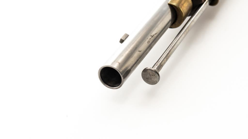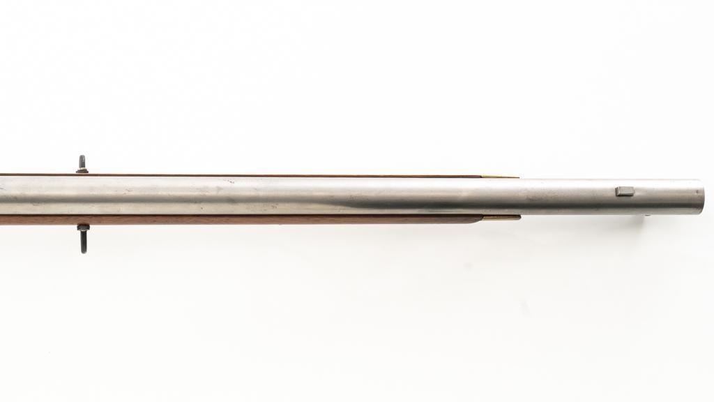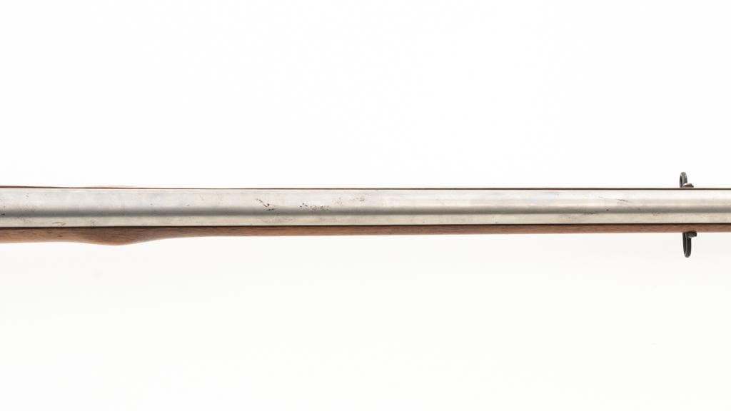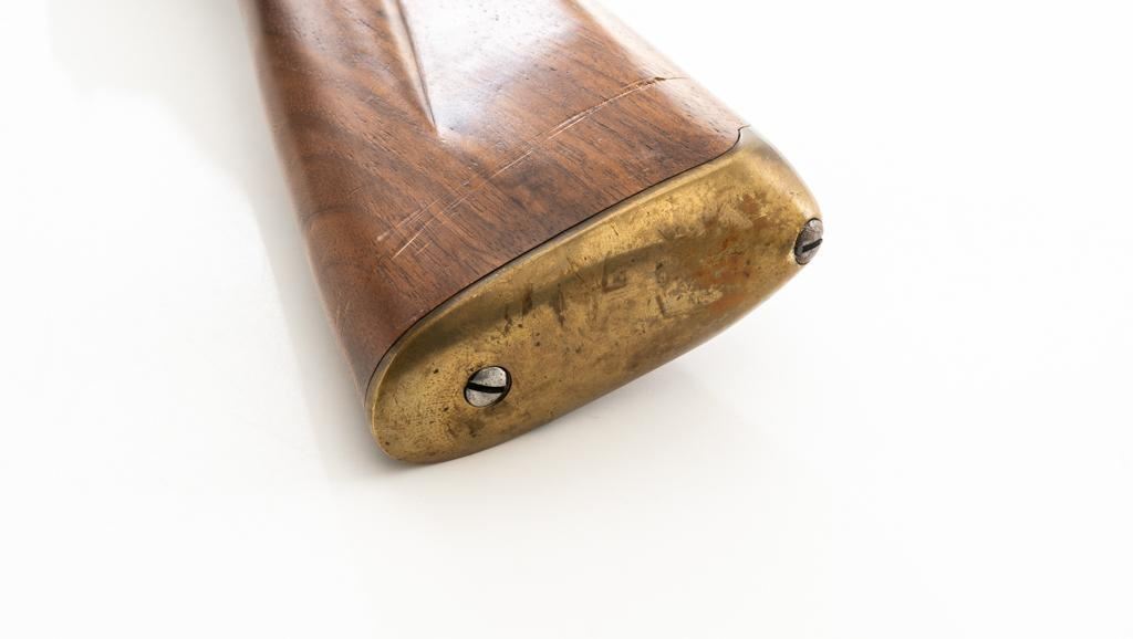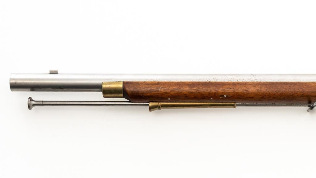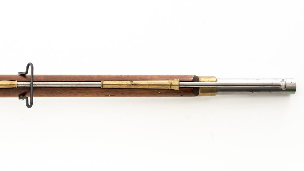 Pedersoli Grice 1762 Brown Bess Flintlock Musket, #BB15949, .75 cal., 42'' smoothbore barrel, bright finish. The hardwood stock has raised aprons behind barrel tang and on the sideplate, and there is a brass escutcheon mounted to top of the stock wrist. No sights. Barrel with a square bayonet lug behind the muzzle. Steel rammer is mounted in four pipes located under the barrel. Left side of the barrel is marked ''PEDERSOLI-ITALY CAL.75/BLACK POWDER ONLY'', with proof and inspection stamps. Lock is engraved ''GRICE 1762'' and ''(Crown)G.R.''. Condition is near excellent overall, barrel is in the white and shows scattered spots of fine pitting and moderate patina at the breech. Hammer assembly has darker toning and patina, with scratches to the steel striker. Stock with scattered moderate scratches and handling marks, located primarily on the buttstock. Action operates smoothly; hammer holds on half and full cock. Bore is bright with very good, defined rifling. Est: $800-$1,200. (No FFL Required)