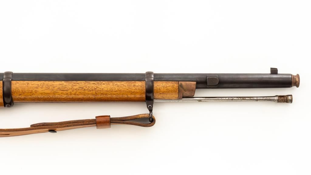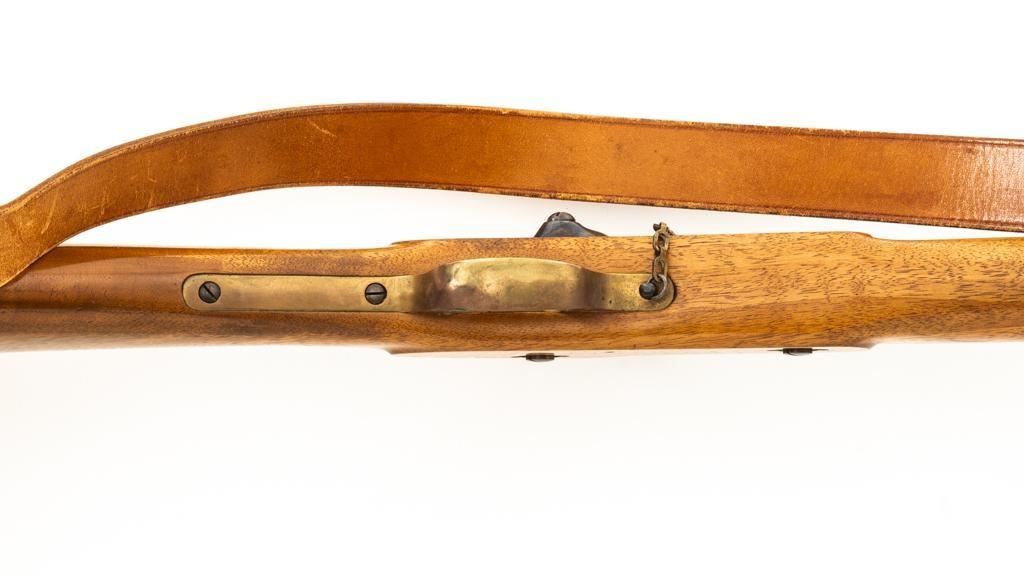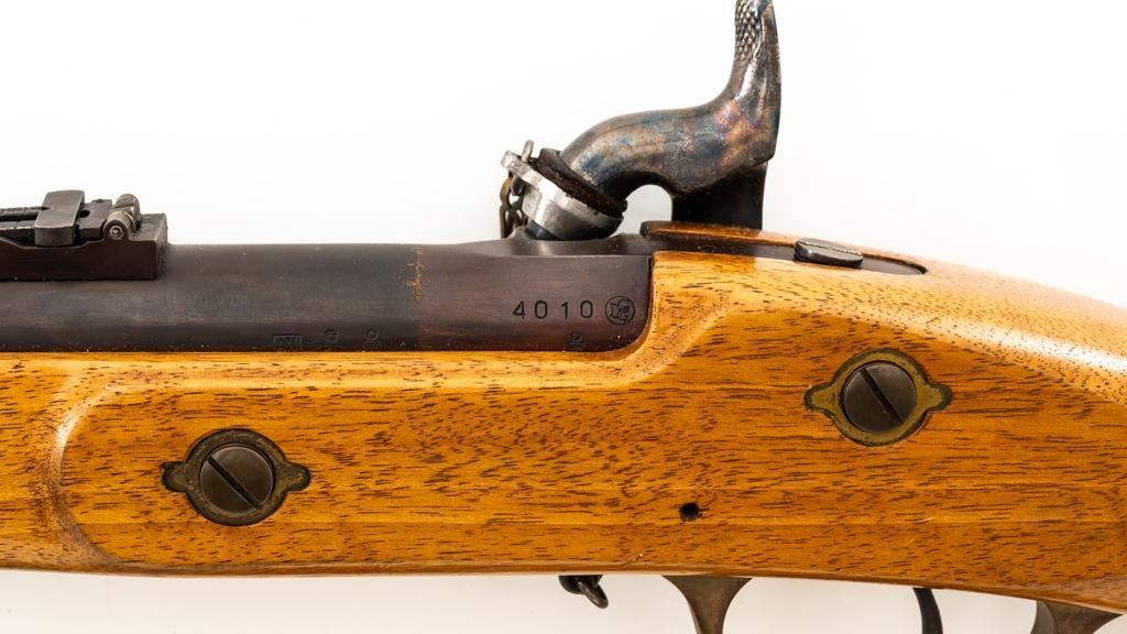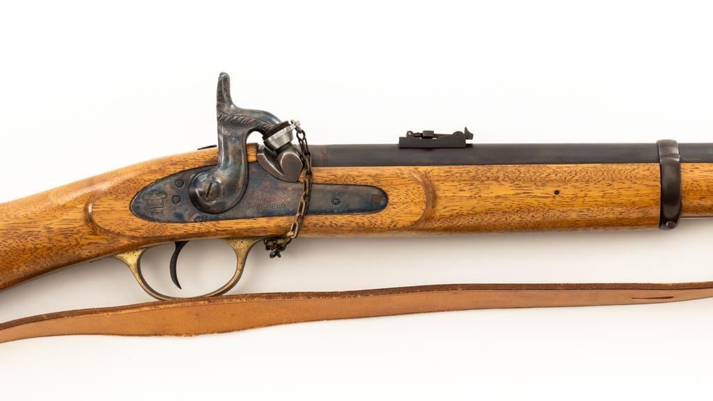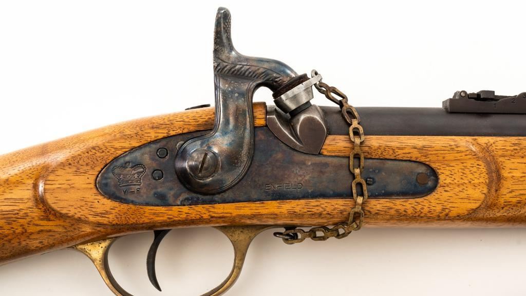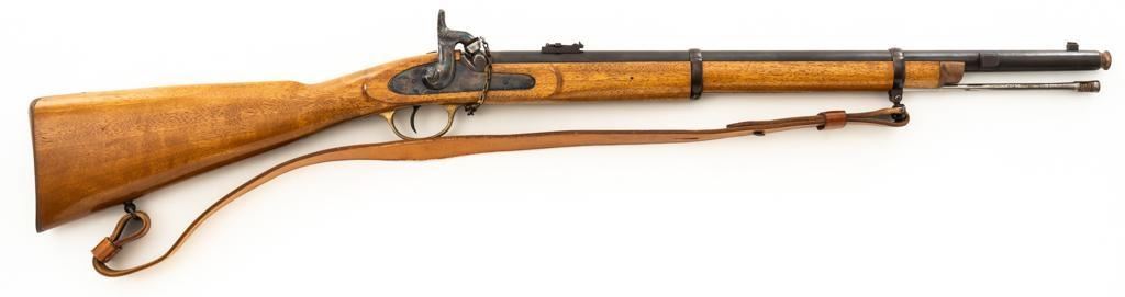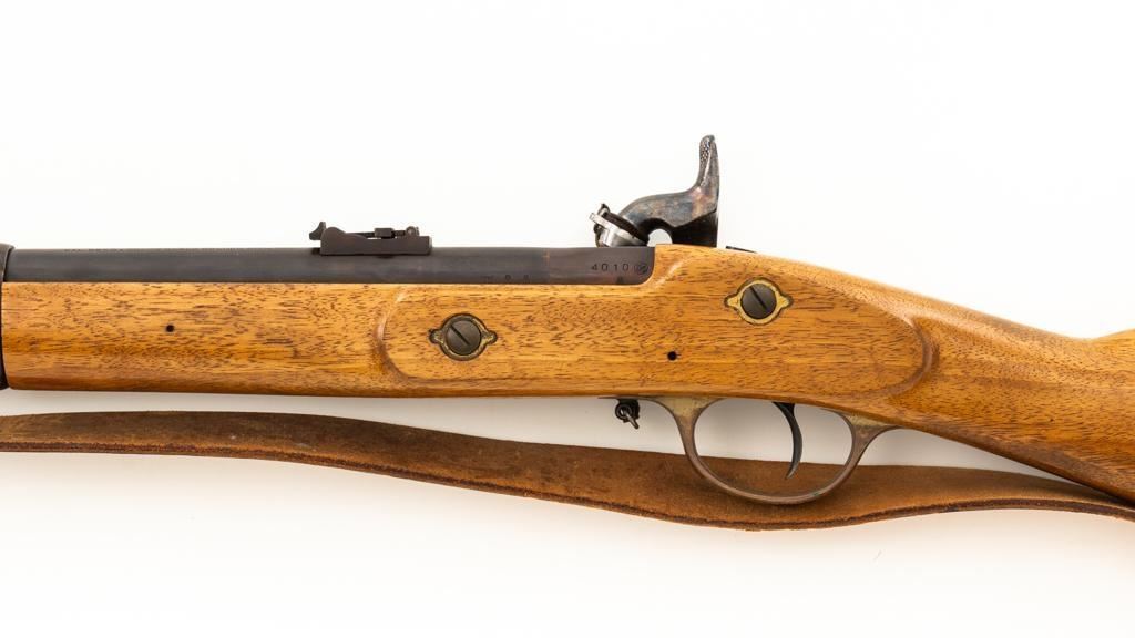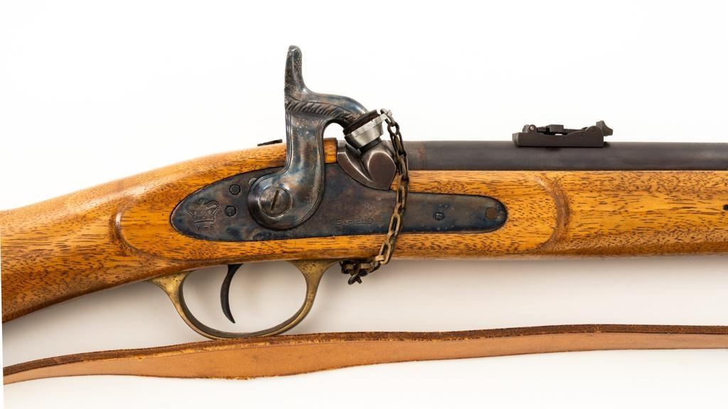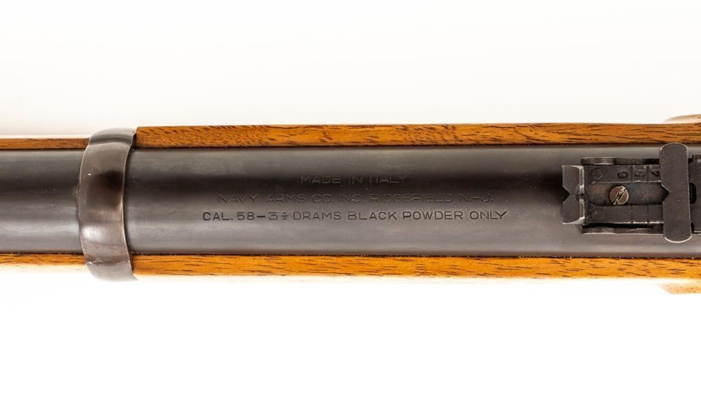 Navy Arms P58 2-Band Percussion Muzzle Loading Rifle, #4010, .58 cal., 24'' rifled barrel, blued finish, hardwood stock, blade front sight, and adjustable folding leaf rear sight with wide ''V''-notched groove, graduated to 600 yards. Includes a tan leather sling, bright steel rammer, attached nipple protector and tompion. Top of the barrel is marked ''MADE IN ITALY/NAVY ARMS CO. INC. RIDGEFIELD N.-J./CAL.58 - 3 1/8 DRAMS BLACK POWDER ONLY'', with proof and inspection stamps on the left side. Lock is marked ''(Crown)V-F'' and ''ENFIELD''. Condition is very good+ overall, with the barrel and bands retaining approx. 95% blue, showing darker toning and light rust to the rear band and to the joined area of the barrel. There is also a few spots of light rust on the rammer. Case hardened lock and hammer retain most of their color with spots of toning. Brass end cap, trigger guard, and buttplate all show a light red colored tarnish. Wood is very good with scattered light handling marks and impressions to the varnished finish. Action operates smoothly; hammer holds on half and full cock. Bore rates very good and is bright with defined rifling. Est.: $600-$800. (No FFL Required)