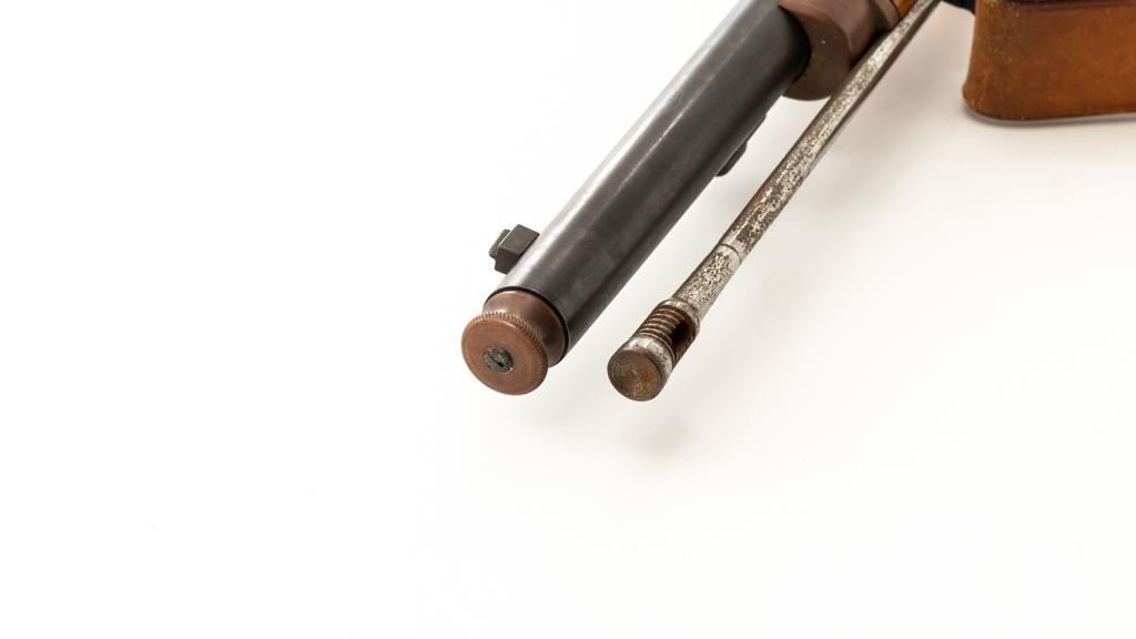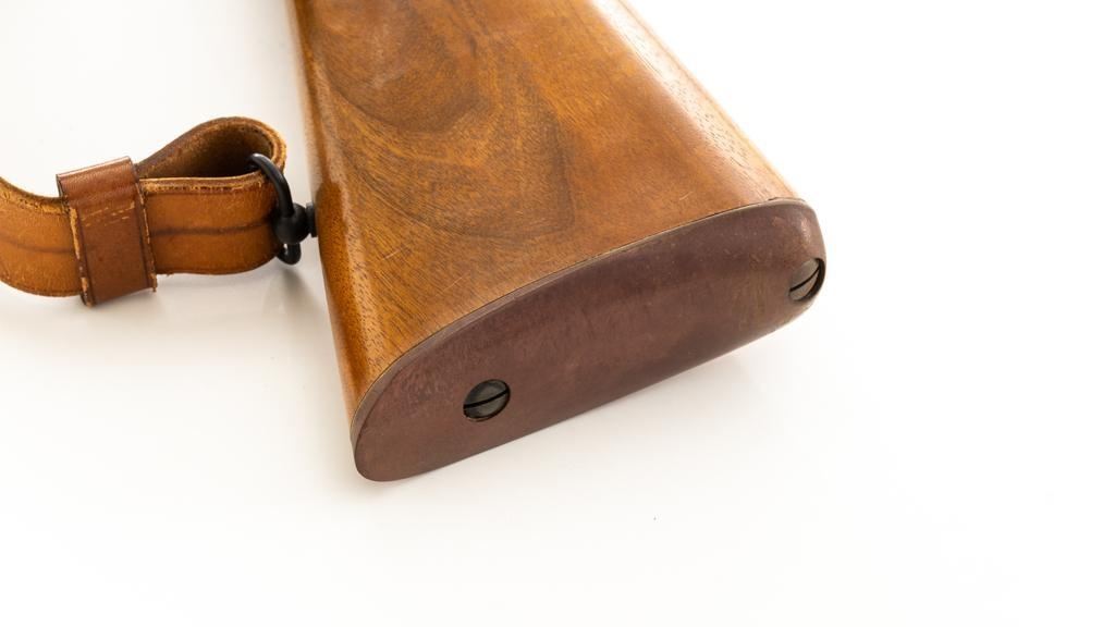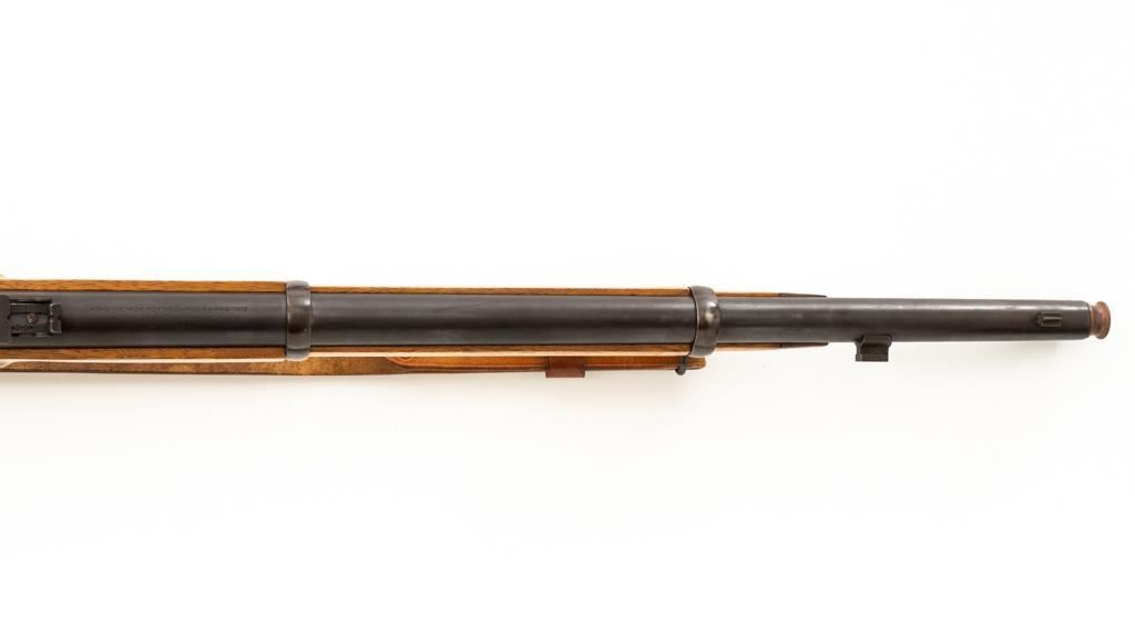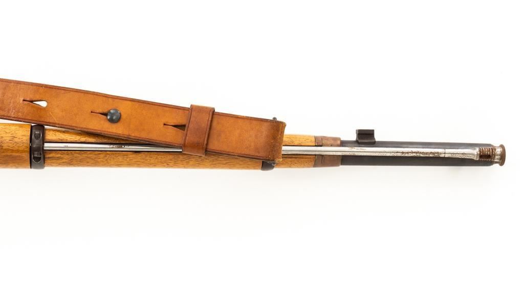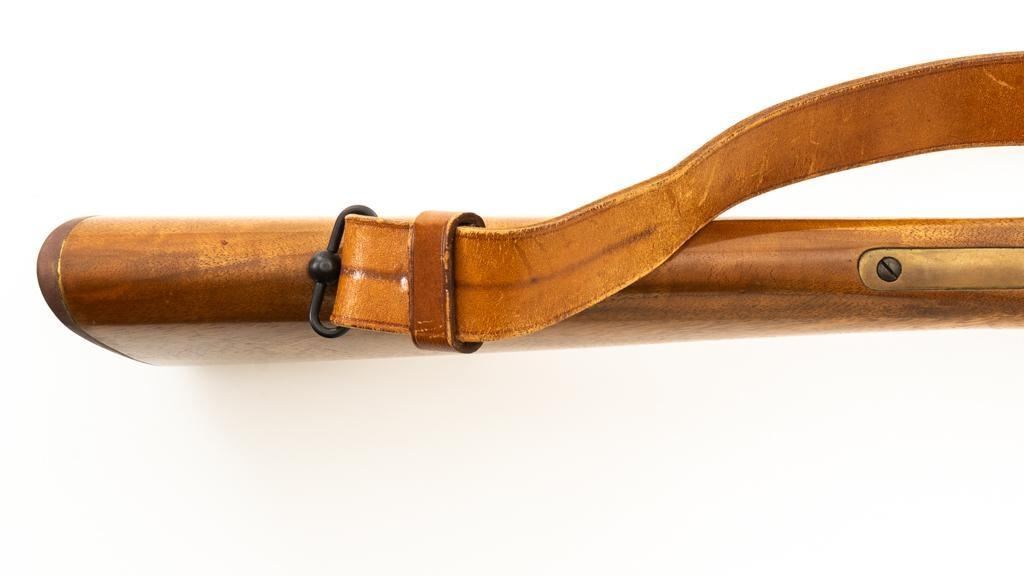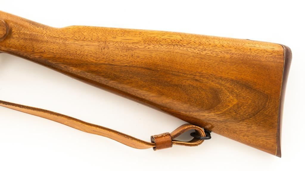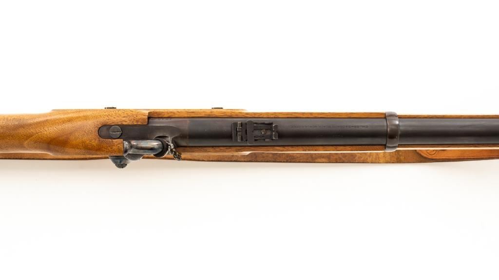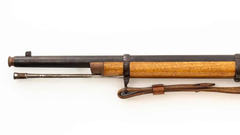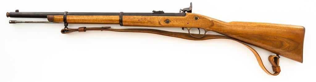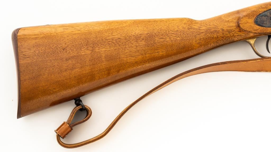 Navy Arms P58 2-Band Percussion Muzzle Loading Rifle, #4010, .58 cal., 24'' rifled barrel, blued finish, hardwood stock, blade front sight, and adjustable folding leaf rear sight with wide ''V''-notched groove, graduated to 600 yards. Includes a tan leather sling, bright steel rammer, attached nipple protector and tompion. Top of the barrel is marked ''MADE IN ITALY/NAVY ARMS CO. INC. RIDGEFIELD N.-J./CAL.58 - 3 1/8 DRAMS BLACK POWDER ONLY'', with proof and inspection stamps on the left side. Lock is marked ''(Crown)V-F'' and ''ENFIELD''. Condition is very good+ overall, with the barrel and bands retaining approx. 95% blue, showing darker toning and light rust to the rear band and to the joined area of the barrel. There is also a few spots of light rust on the rammer. Case hardened lock and hammer retain most of their color with spots of toning. Brass end cap, trigger guard, and buttplate all show a light red colored tarnish. Wood is very good with scattered light handling marks and impressions to the varnished finish. Action operates smoothly; hammer holds on half and full cock. Bore rates very good and is bright with defined rifling. Est.: $600-$800. (No FFL Required)