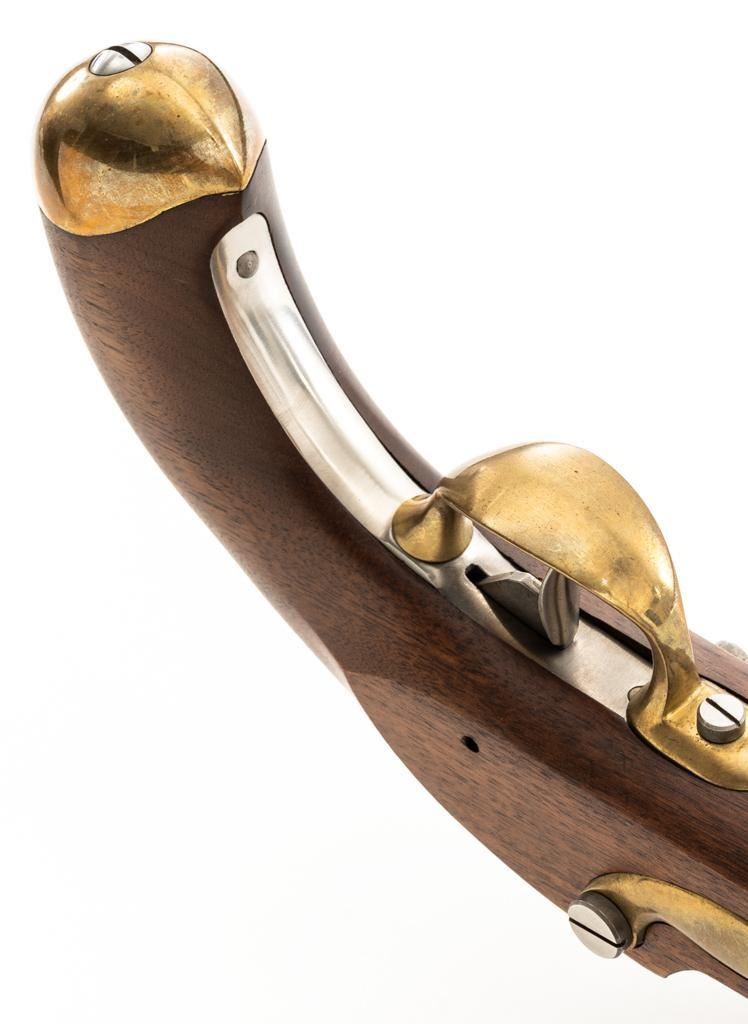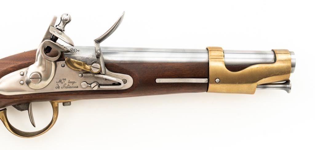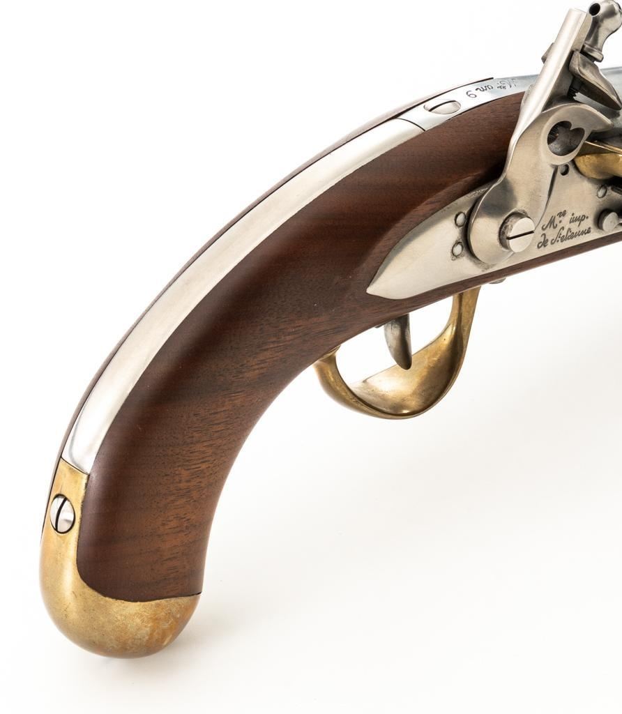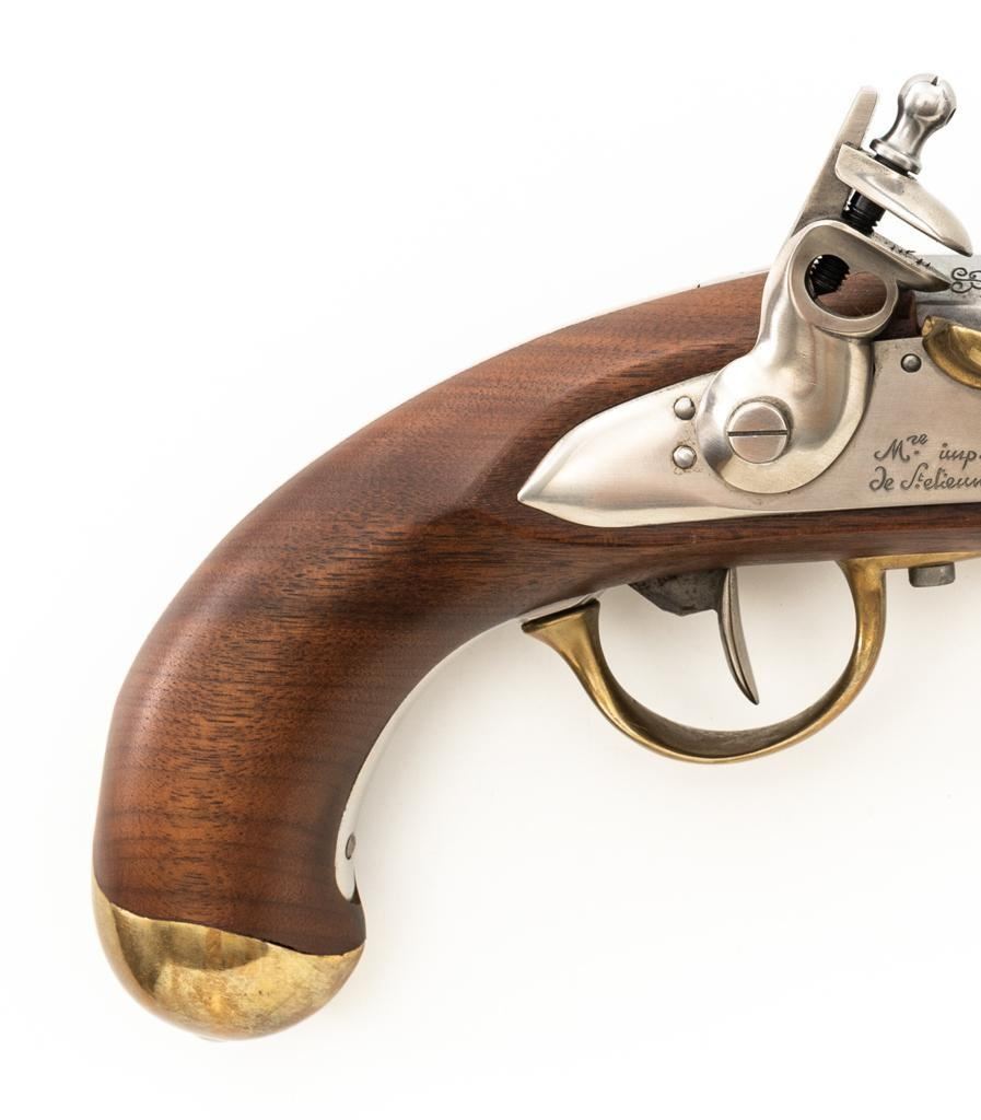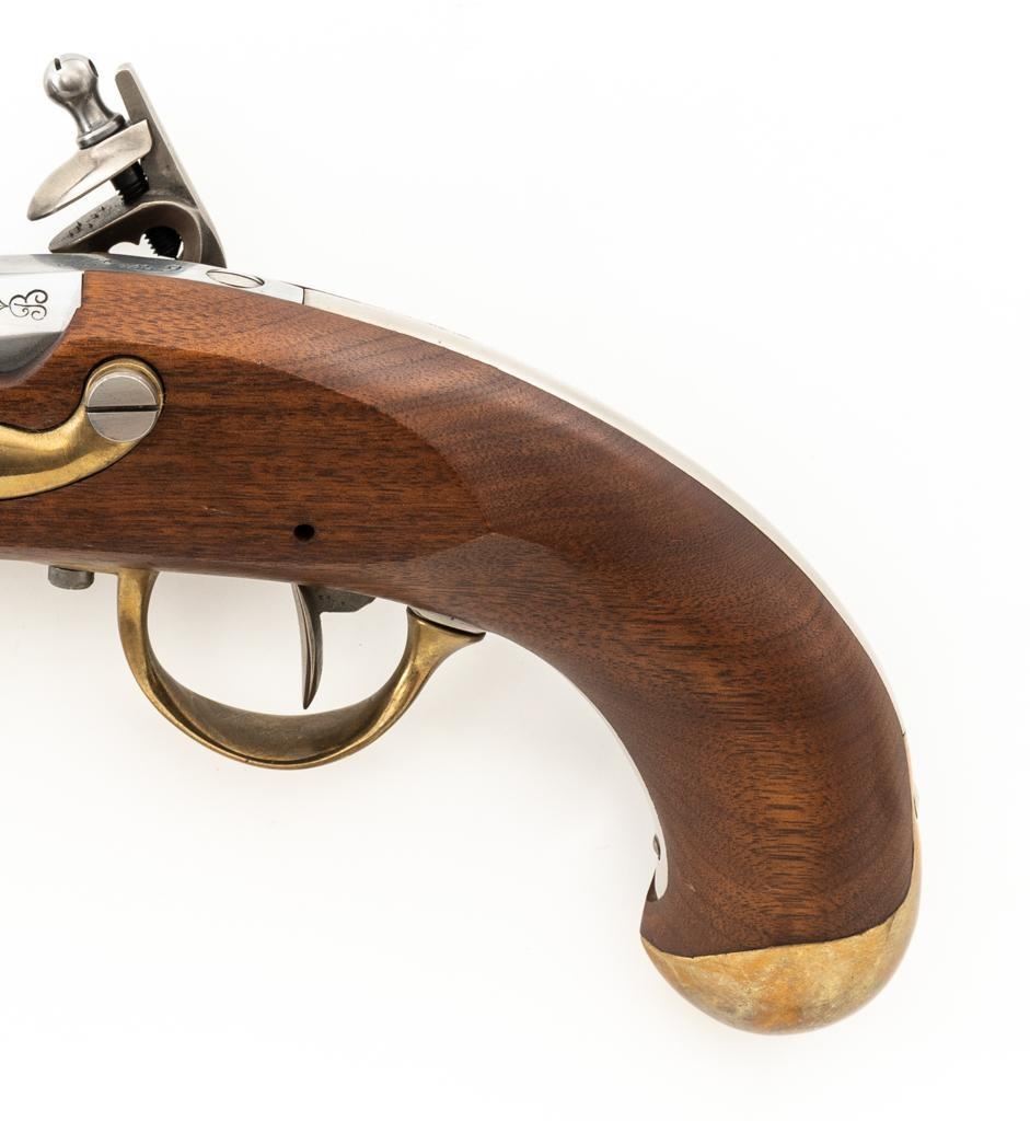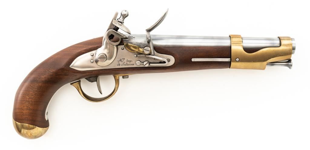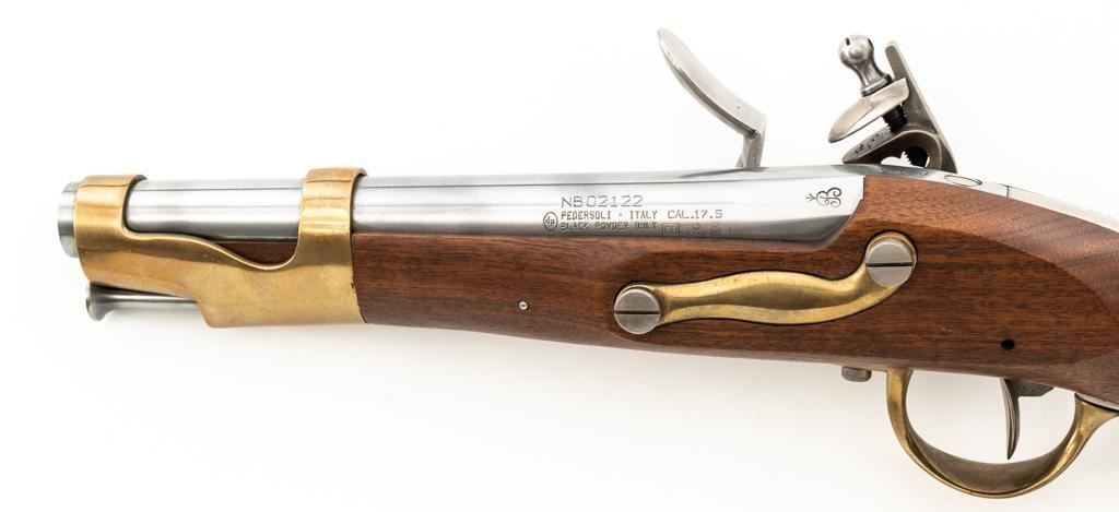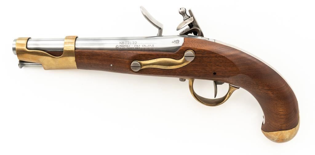 Pedersoli Model IX Reproduction St. Etienne Flintlock Pistol, #NB02122, .69 cal. black powder, 8.25'' round barrel, metal is in the white, one-piece wood stock with brass hardware, no sights. A high quality reproduction of a Napoleonic period pistol. Manufactured 2007 in Italy. Condition is excellent, metal surfaces are bright. Brass barrel band and buttcap show some light scratching and handling marks. Stock with a few shallow dents and scratches. Action is strong and functions smoothly. Smoothbore is bright. Est.: $500-$600. (No FFL Required)