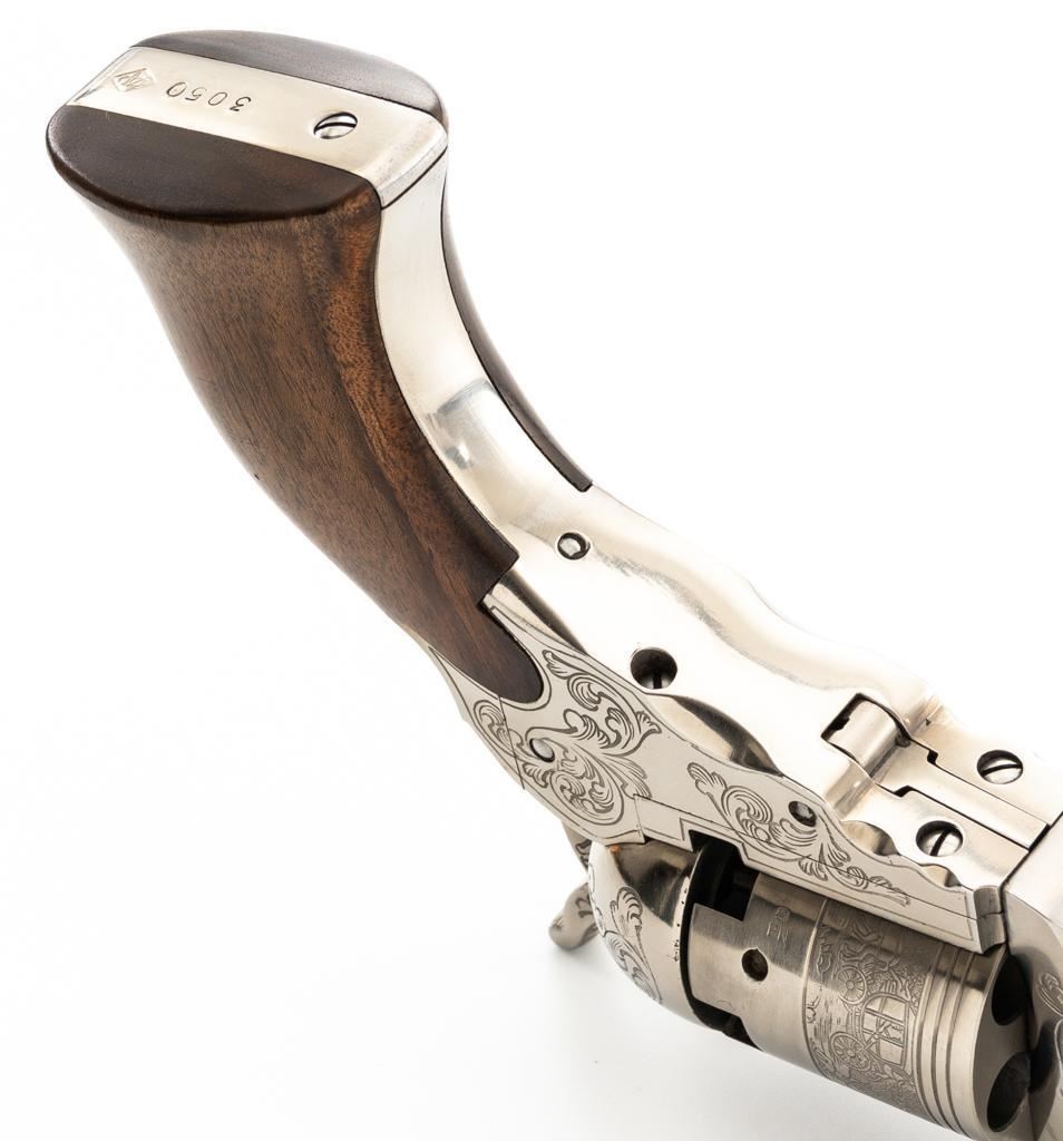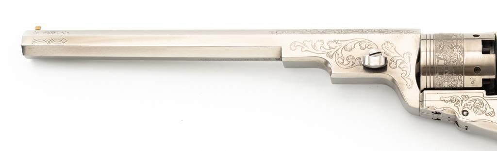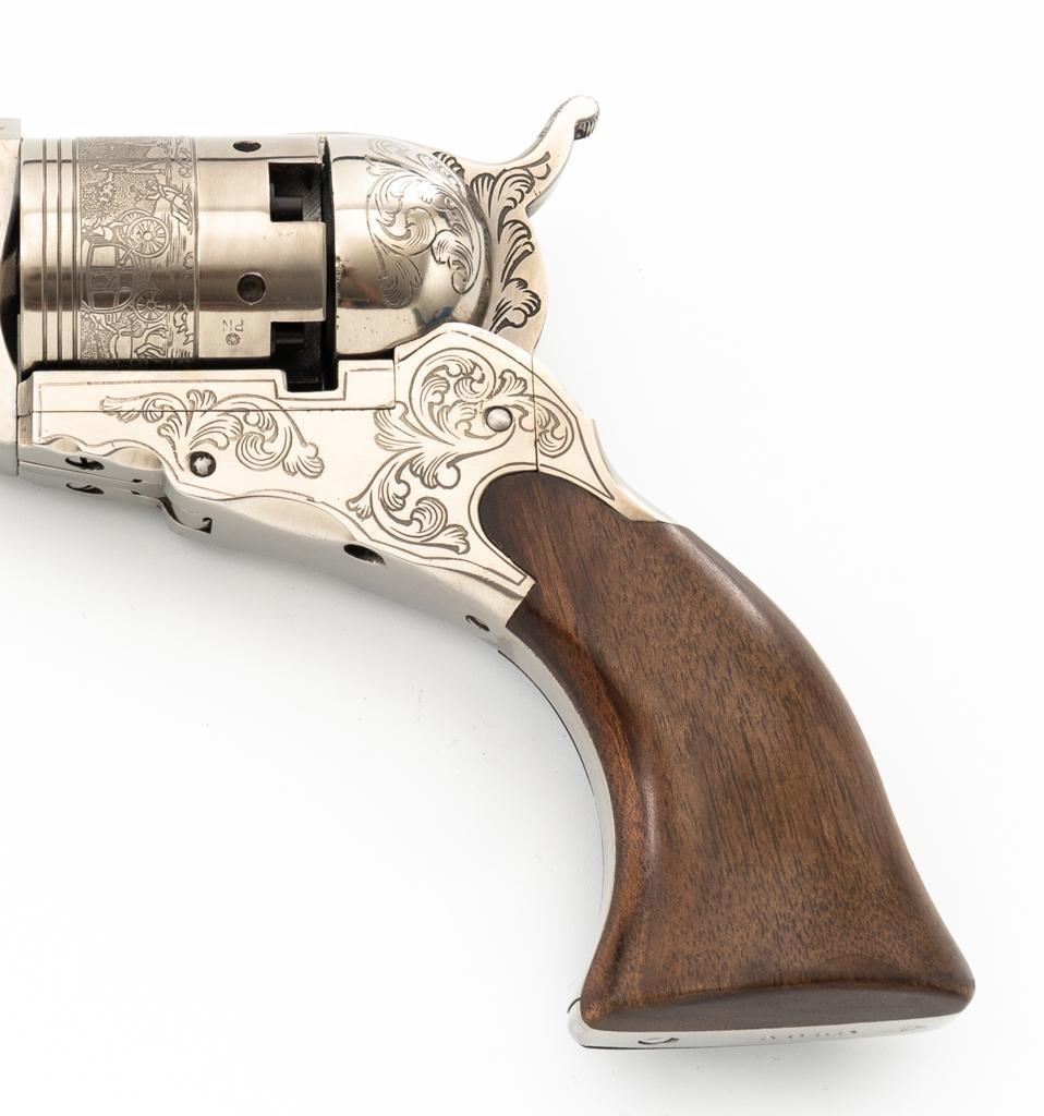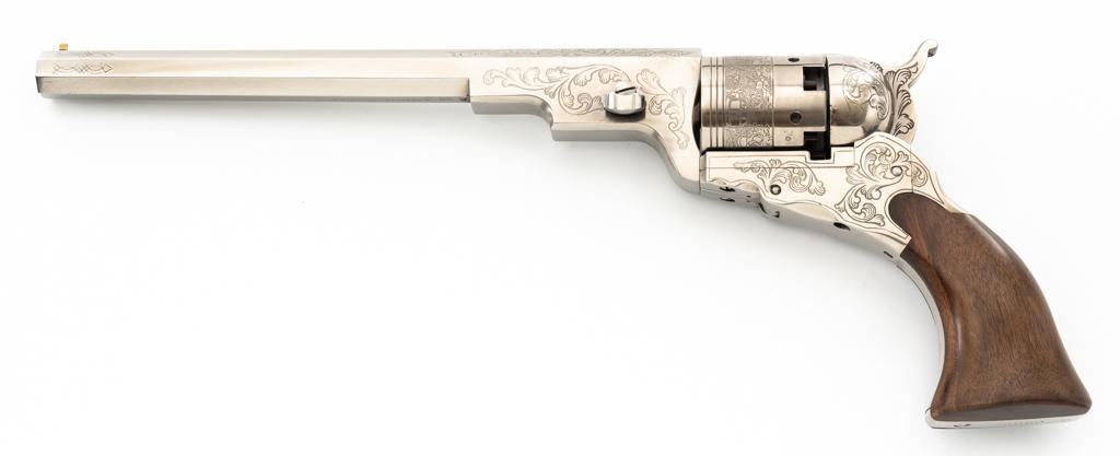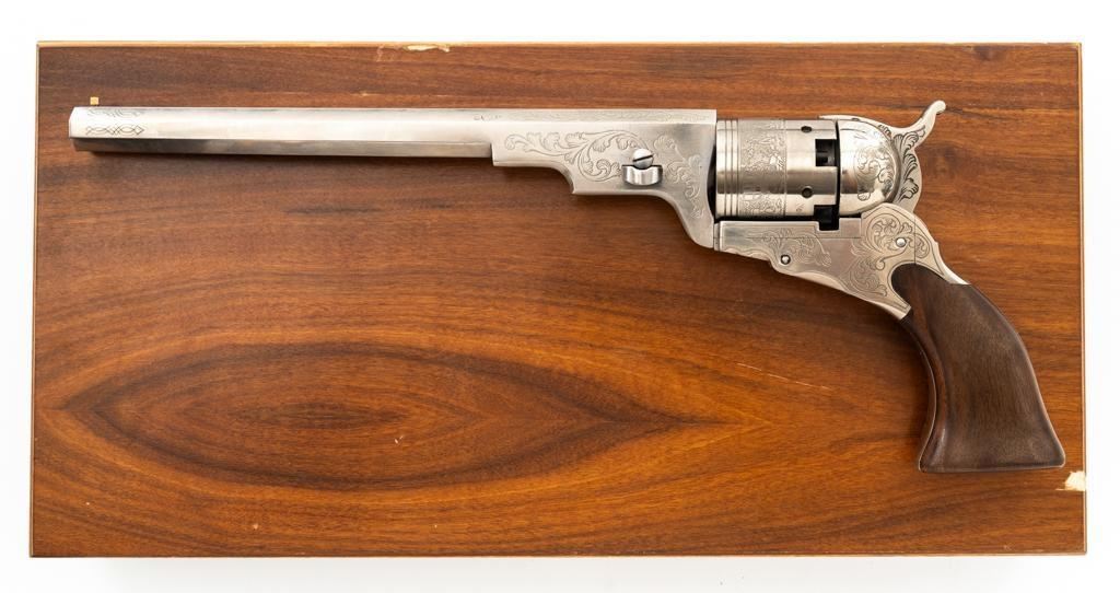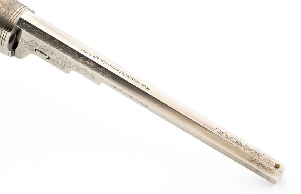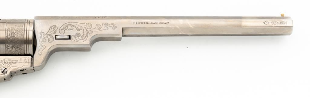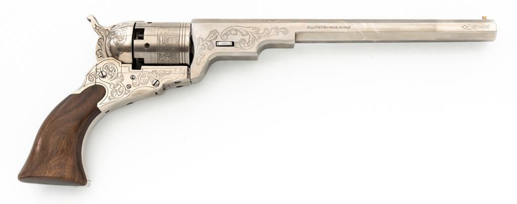 Italian Pietta Paterson Texas Model Black Powder Percussion Revolver with Case, #3050, .36 cal., 9'' octagon barrel, stainless steel finish, smooth walnut two-piece grips, brass pin front sight, notched rear sight located on the hammer, and folding trigger. Barrel lugs, frame, and hammer are lightly machine engraved. Factory markings are clear, with Italian proofs on the underside of the barrel, right side of frame, and cylinder. Includes a hardwood veneer presentation case. In very good condition with scattered chips on the exterior. Partition interior is finished in maroon velveteen and comes with a brass charger, bullet mold, blue steel capping tool, key, and factory instruction manual. Interior is in near excellent condition. Revolver is excellent overall, appearing unfired. Action functions smoothly and locks up securely. Bore is mirror bright. Est.: $700-$1,000. (No FFL Required)