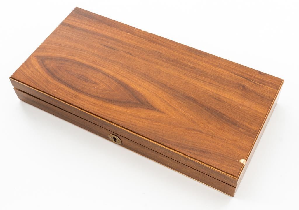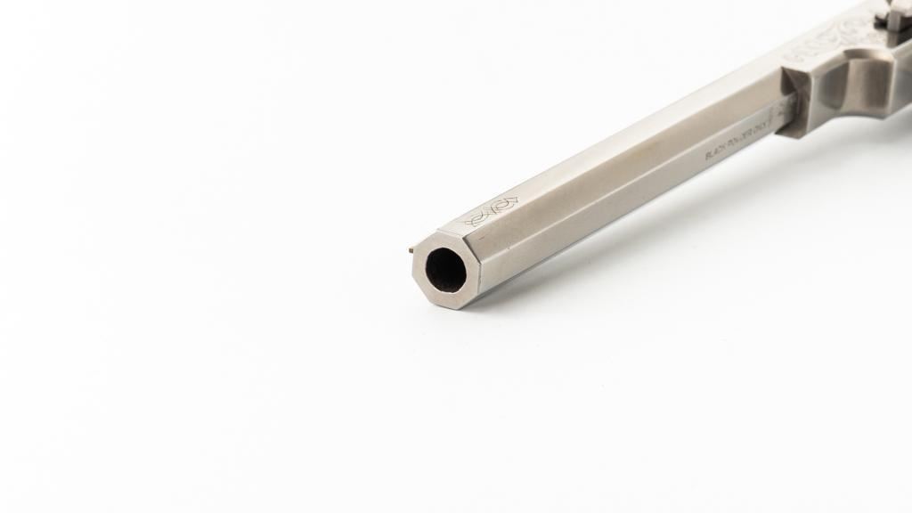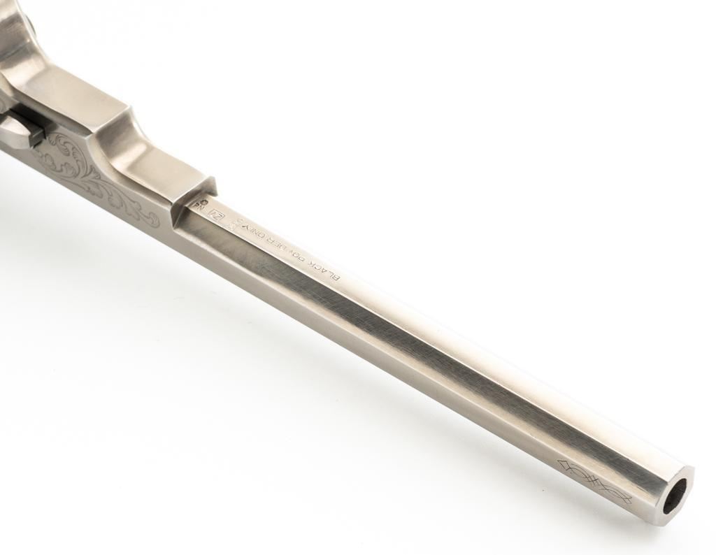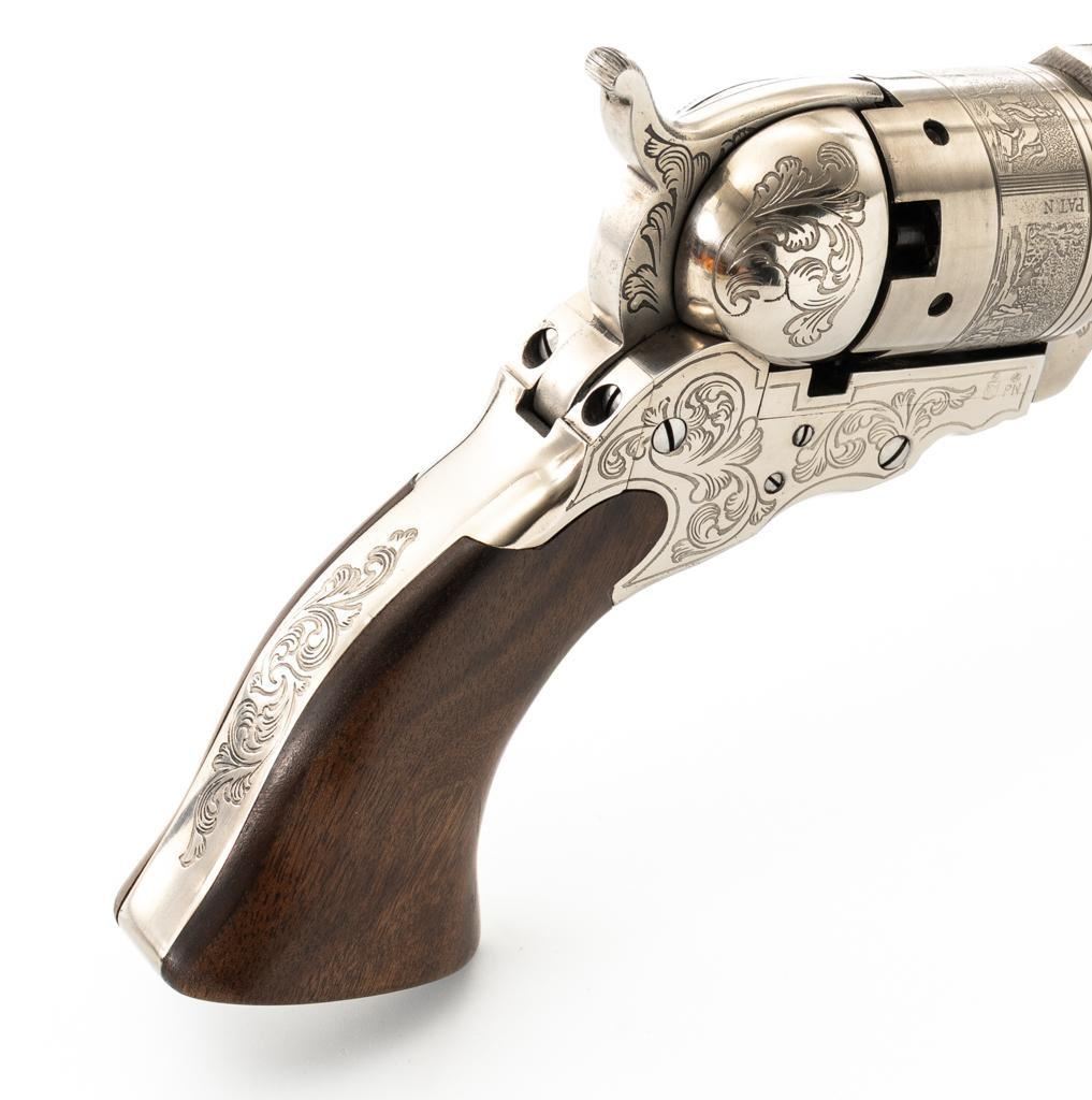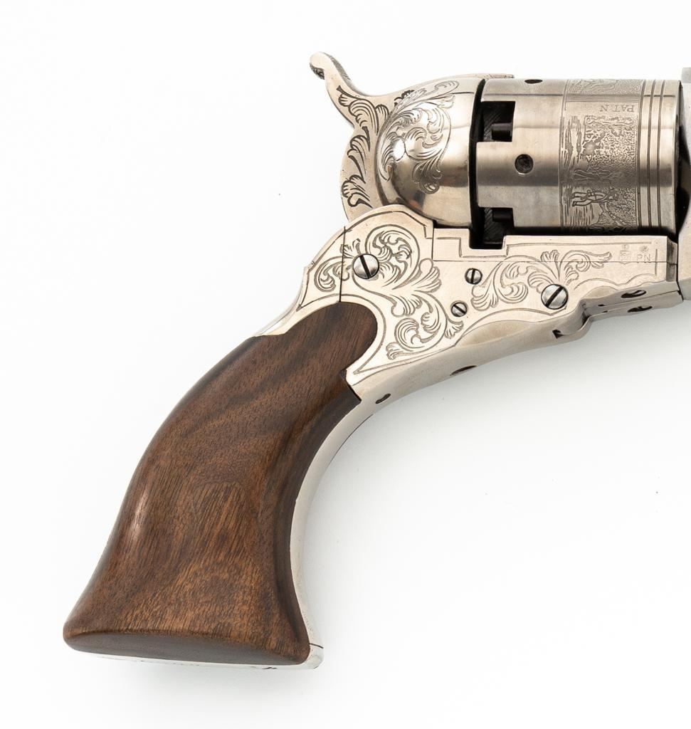 Italian Pietta Paterson Texas Model Black Powder Percussion Revolver with Case, #3050, .36 cal., 9'' octagon barrel, stainless steel finish, smooth walnut two-piece grips, brass pin front sight, notched rear sight located on the hammer, and folding trigger. Barrel lugs, frame, and hammer are lightly machine engraved. Factory markings are clear, with Italian proofs on the underside of the barrel, right side of frame, and cylinder. Includes a hardwood veneer presentation case. In very good condition with scattered chips on the exterior. Partition interior is finished in maroon velveteen and comes with a brass charger, bullet mold, blue steel capping tool, key, and factory instruction manual. Interior is in near excellent condition. Revolver is excellent overall, appearing unfired. Action functions smoothly and locks up securely. Bore is mirror bright. Est.: $700-$1,000. (No FFL Required)