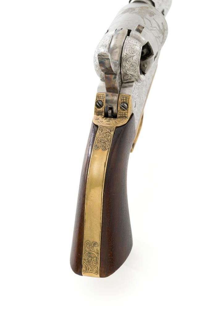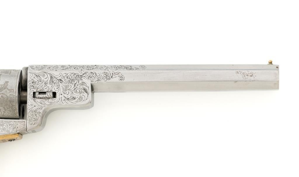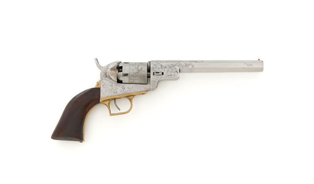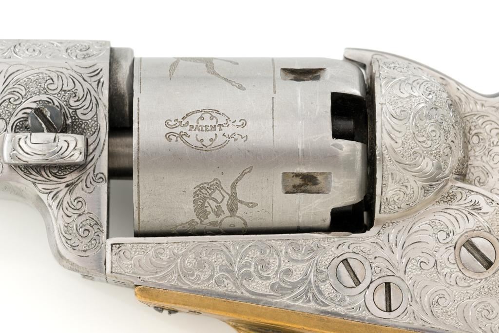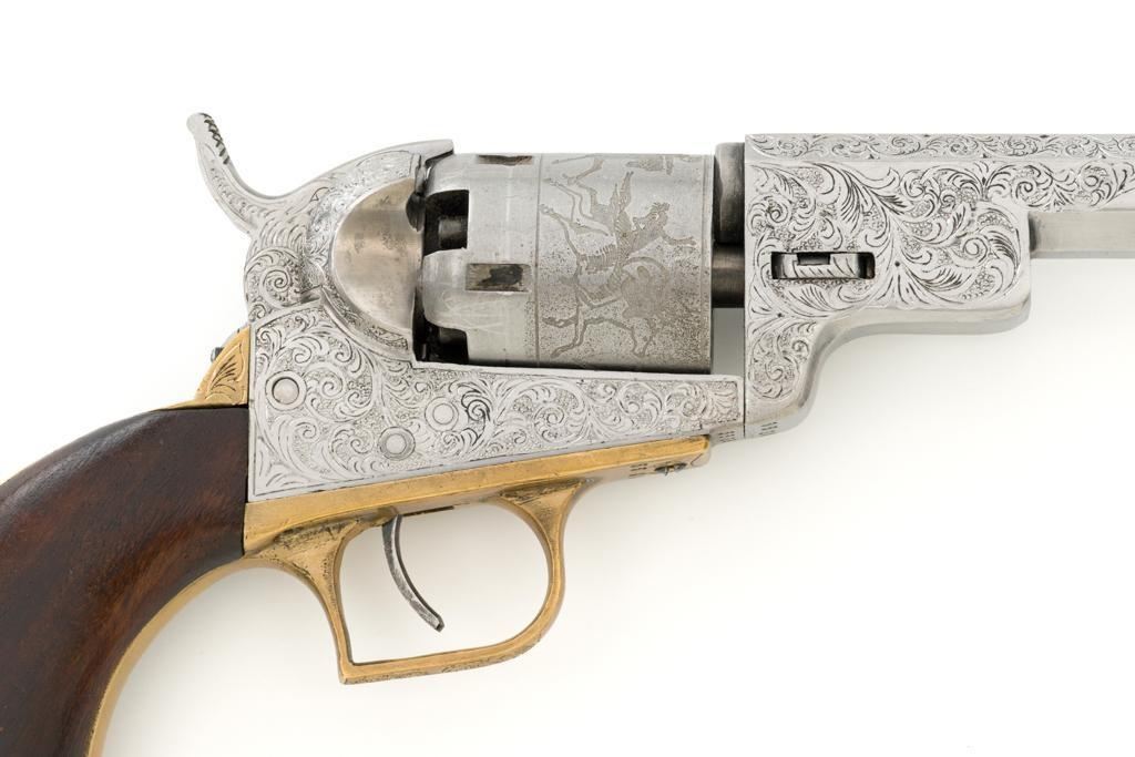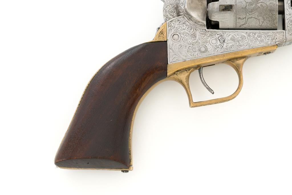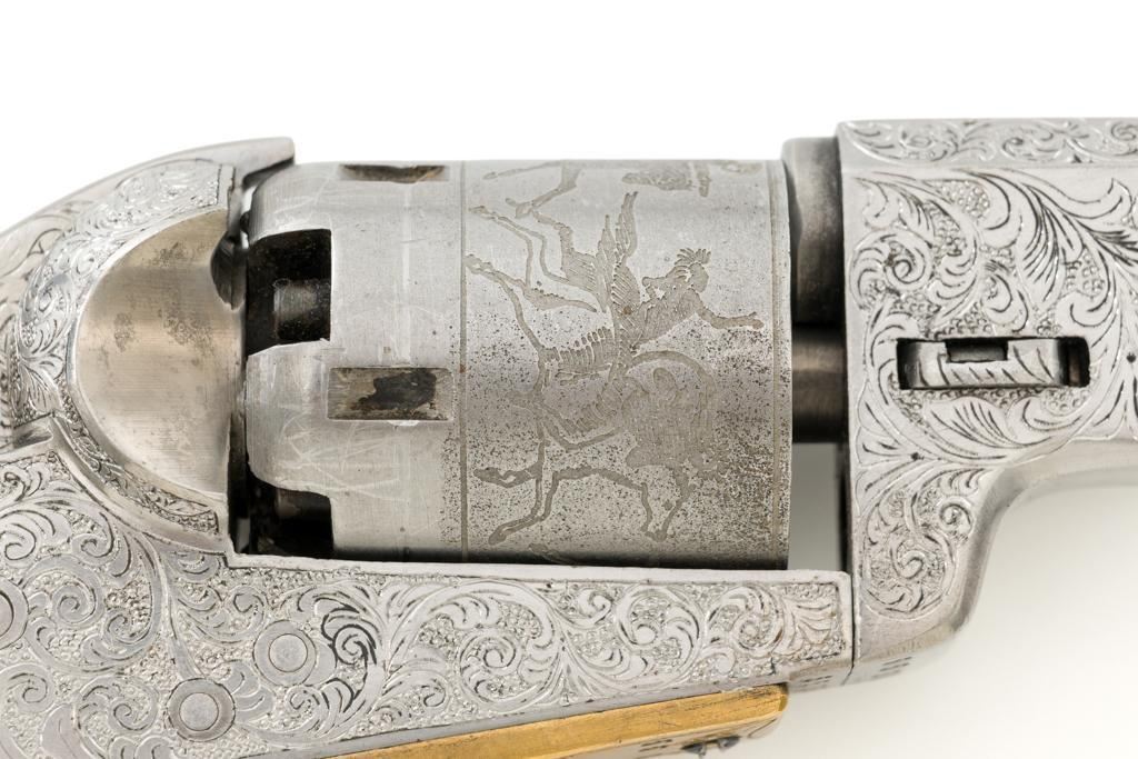 Engraved Reproduction/Composite Colt Baby Dragoon Black Powder Percussion Revolver, #5539, .31 cal., 5.75'' octagon barrel, nickel finish, punch dot and scroll engraving, brass straps and square back trigger guard, smooth walnut two-piece grips, brass bead front and ''V''-notch rear sight located on the hammer. Cylinder with Texas Ranger and Indian roll engraved scene. Manufacturer is unknown. Revolver is in fine overall condition, with light scratches and handling marks. Machine engraving is well done and in the style of Gustave Young. There is a small area of light surface rust on the right side of the barrel. Grips are very good. Action functions intermittently and will require repair. Bore is very good with well-defined rifling. Est.: $500-$750. (No FFL Required)