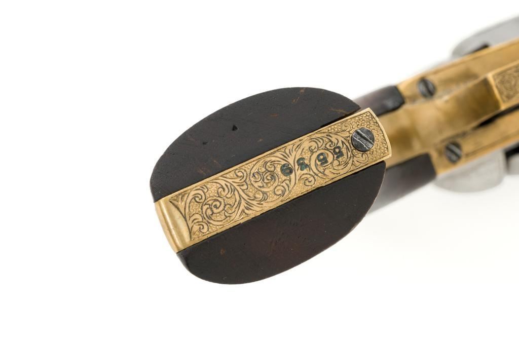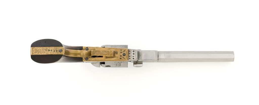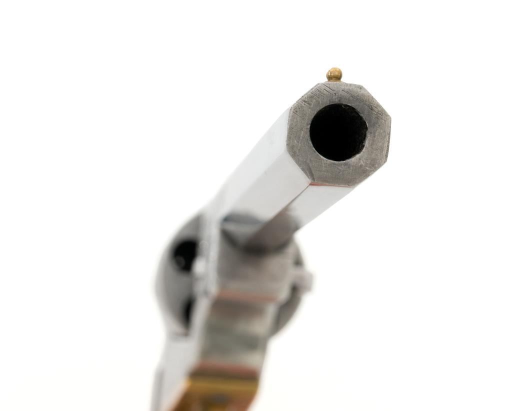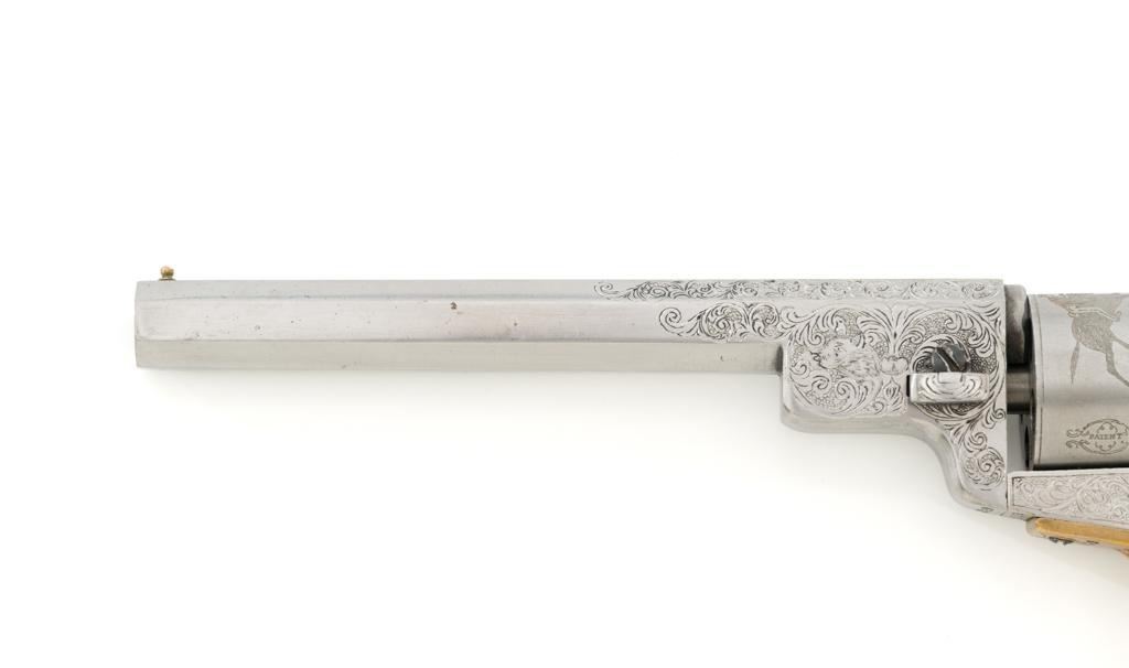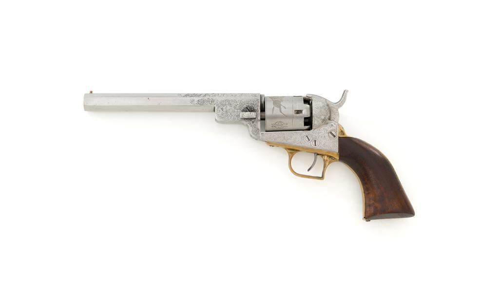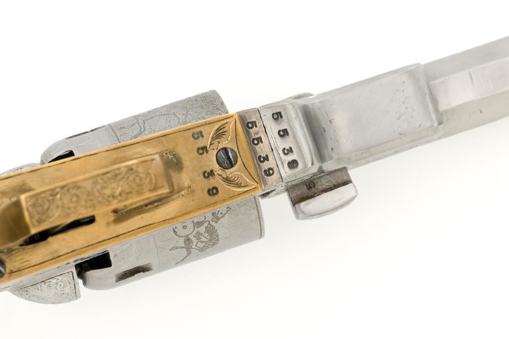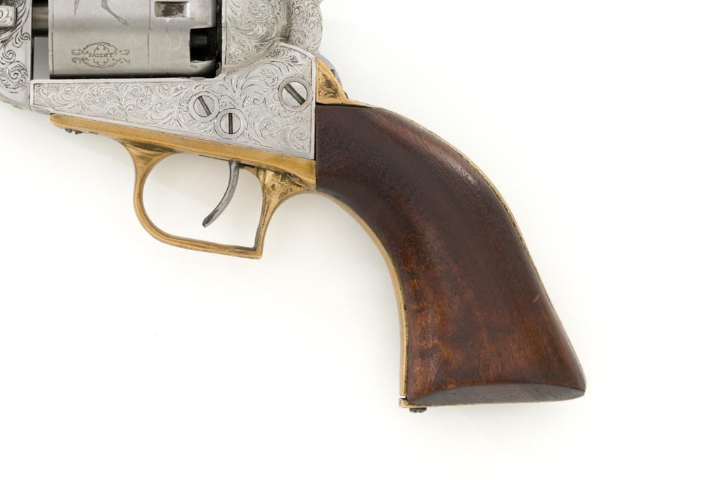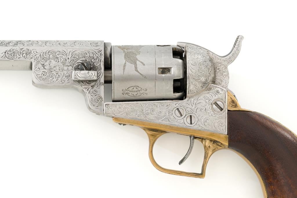 Engraved Reproduction/Composite Colt Baby Dragoon Black Powder Percussion Revolver, #5539, .31 cal., 5.75'' octagon barrel, nickel finish, punch dot and scroll engraving, brass straps and square back trigger guard, smooth walnut two-piece grips, brass bead front and ''V''-notch rear sight located on the hammer. Cylinder with Texas Ranger and Indian roll engraved scene. Manufacturer is unknown. Revolver is in fine overall condition, with light scratches and handling marks. Machine engraving is well done and in the style of Gustave Young. There is a small area of light surface rust on the right side of the barrel. Grips are very good. Action functions intermittently and will require repair. Bore is very good with well-defined rifling. Est.: $500-$750. (No FFL Required)