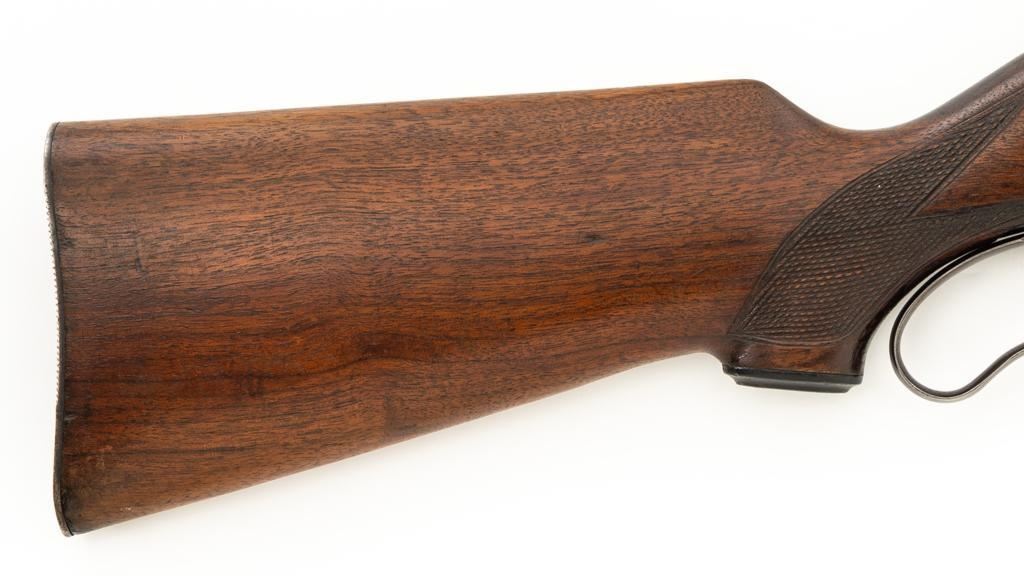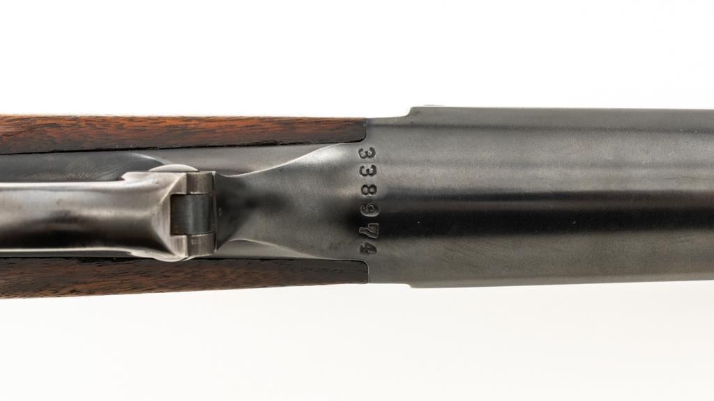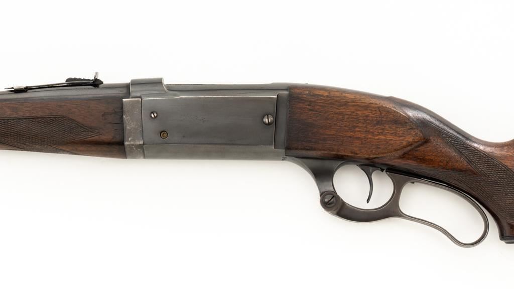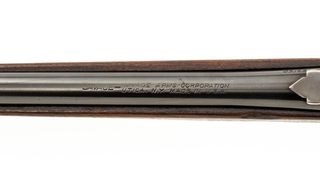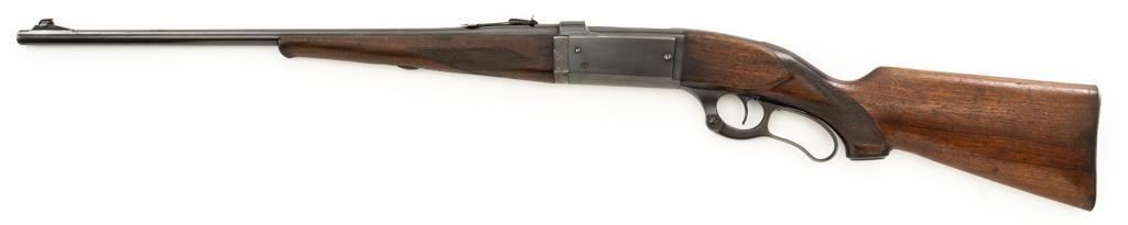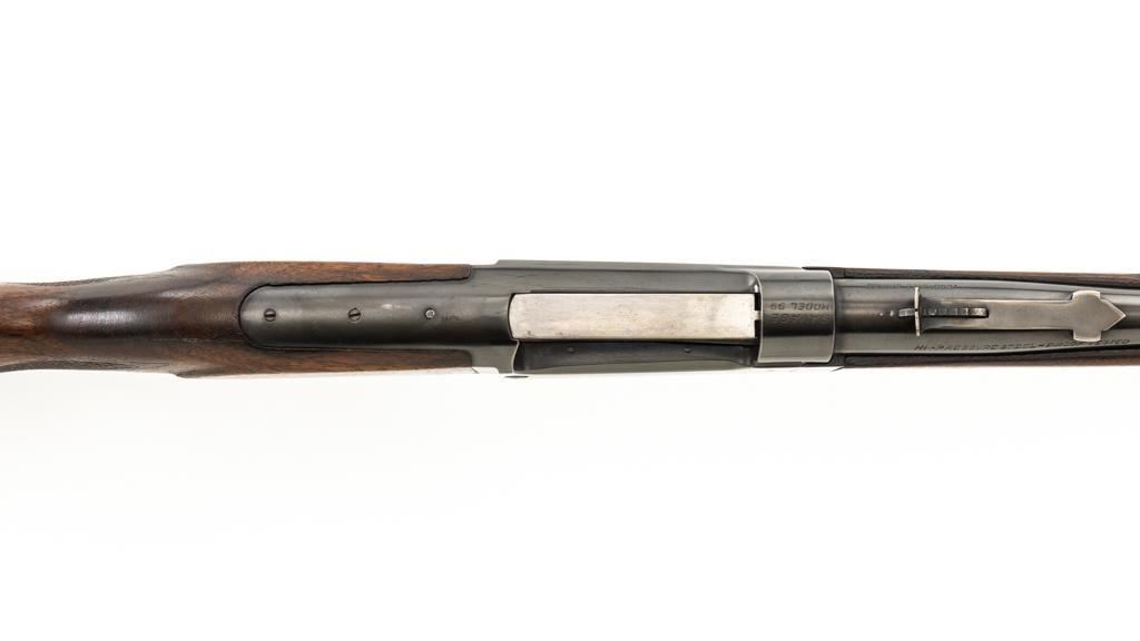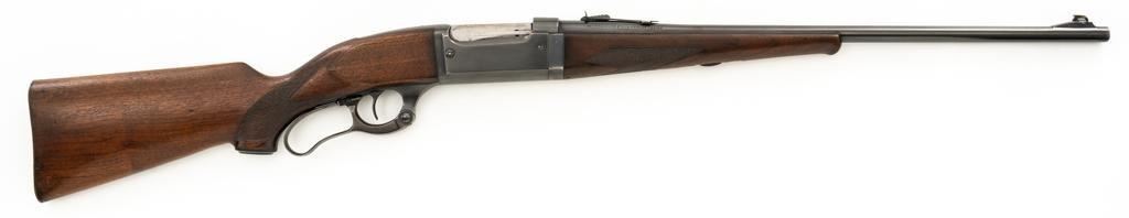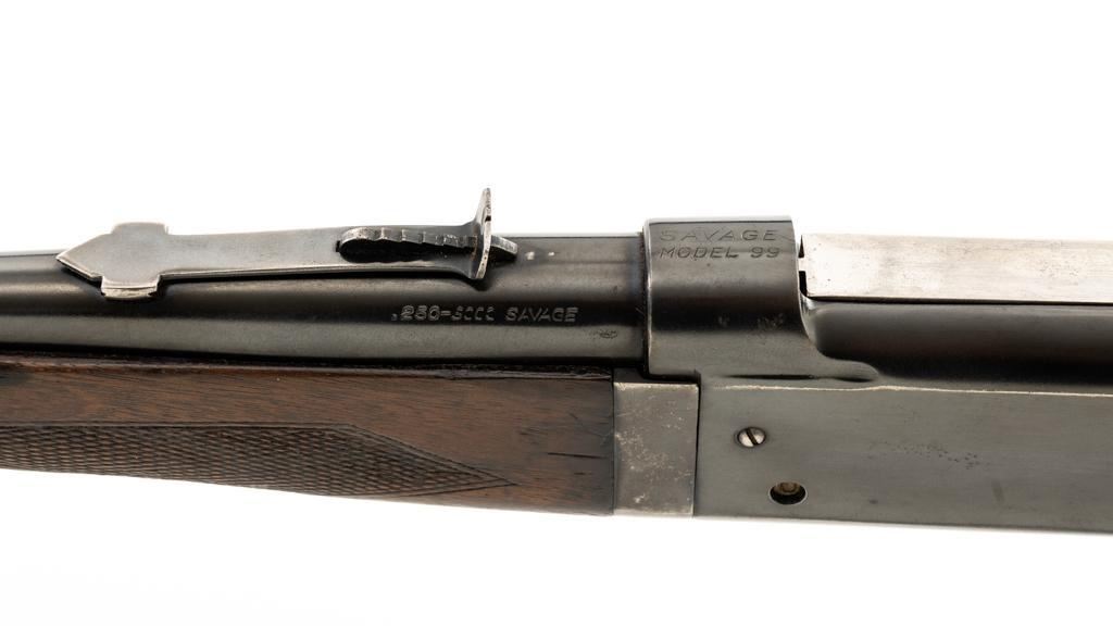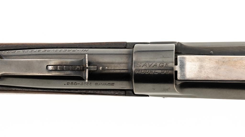 Savage Model 99G Lever Action Takedown Rifle, #338974, .250-3000 Savage cal., 22'' barrel, with blue finish. Checkered walnut pistol grip stock with Schnabel forend, checkered hard rubber grip cap, and ribbed blue steel ''SVG'' marked buttplate, providing a 13'' LOP. Rifle also features a ramped German silver blade front sight, standard elevator ''U''-notched rear sight, brass cartridge counter with internal rotary magazine, and the upper tang is factory drilled and tapped. Mfg'd 1931. Rifle is in fine overall condition, retaining approx. 95% reblued finish with wear and oxidation at the muzzle. Receiver shows mild edgewear, light surface erosion on the takedown collar. Lever and assembly show traces of darkened color case hardened finish. Factory lettering is clear. Stock is very good overall, with scattered indentations and scrapes consistent with field use. Buttstock with an added coat of varnish and there is a very fine 1'' crack at the top of the wrist, adjacent the upper tang. Checkering detail is good with some flattening on the forend. Action functions smoothly. Bore rates near excellent overall and is bright with defined rifling. Est.: $500-$800. (C&R/PPT)