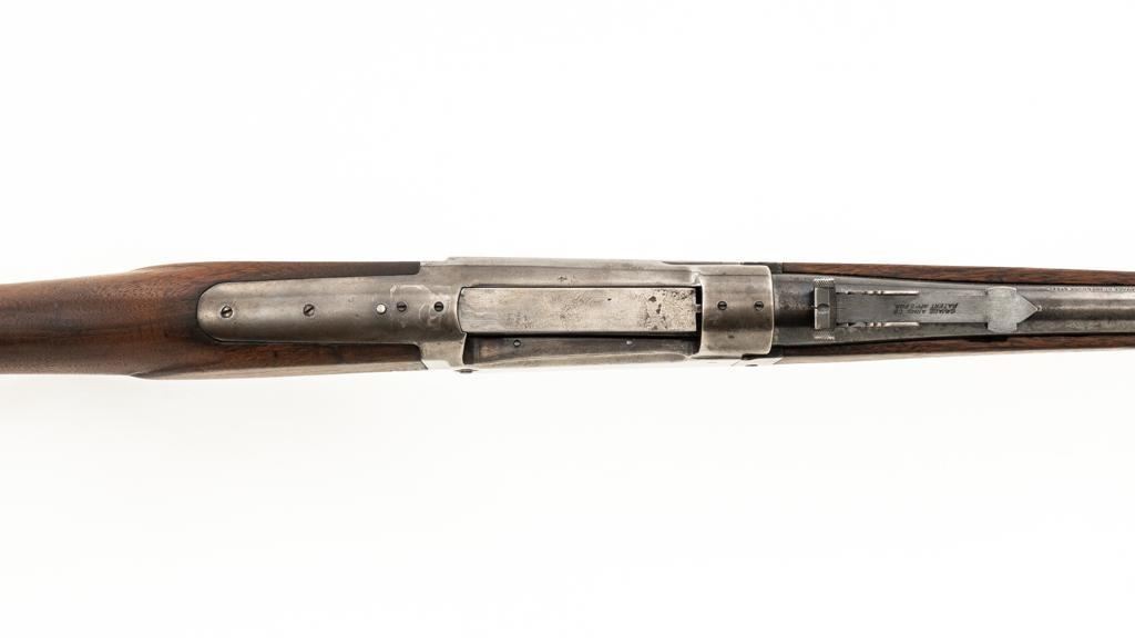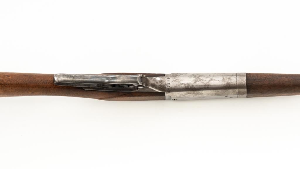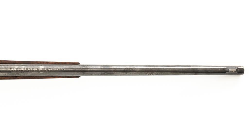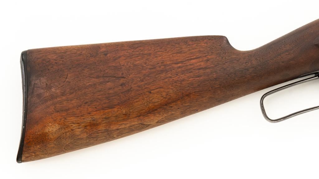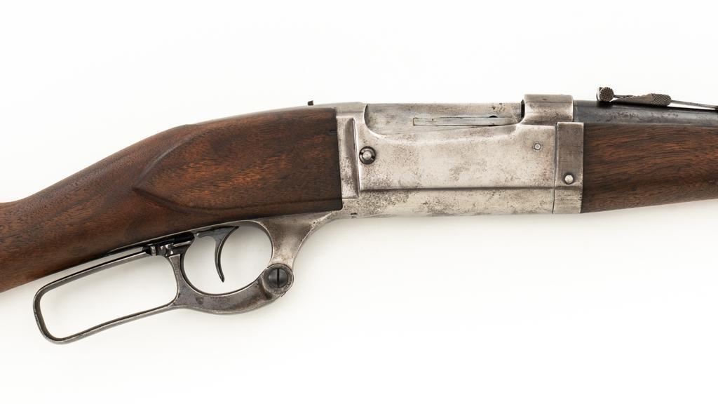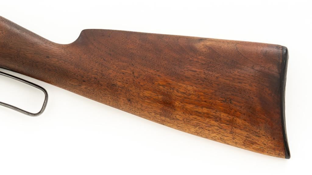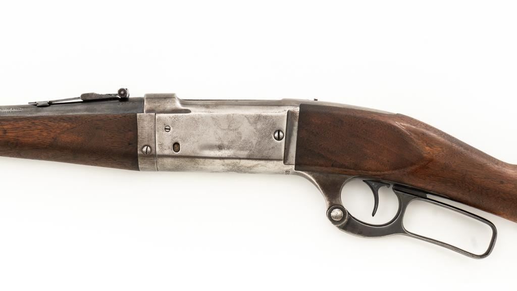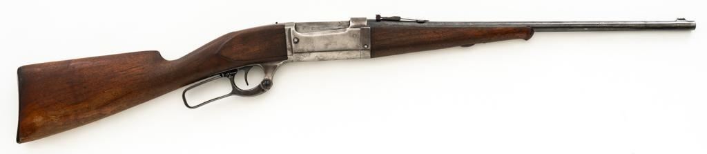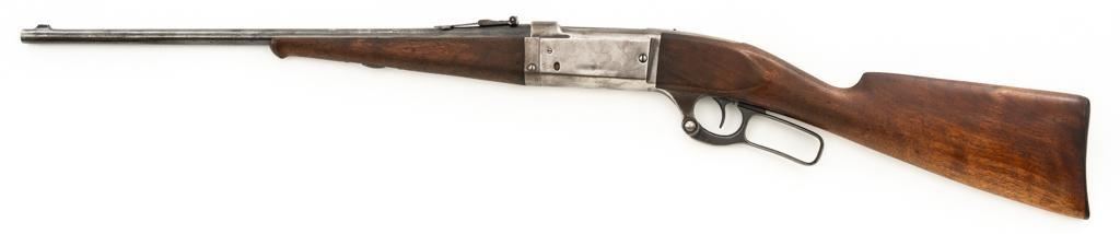 Savage Model 1899H Lever Action Takedown Rifle, #142593, .22 Hi-Power cal., 20'' round barrel, with blue finish. Smooth walnut forend and straight grip stock with Schnabel forend, ending with a checkered hard rubber Savage buttplate, providing a 13.25'' LOP. Front sight blade is missing, adjustable ''U''-notch rear sight is marked ''Savage''. Rifle also features an internal rotary magazine with brass cartridge counter; receiver is drilled and tapped. Mfg'd 1913. Rifle is in very good condition, with the barrel retaining approx. 50%-60% thinning finish, with wear at the muzzle, scattered spots of light erosion. Receiver has worn to silver, with areas of light corrosion, and an indentation on the left side. Stock is in very good condition, with impressions and thinning finish, particularly on the underside of the buttstock. Forend is correctly marked with the matching serial number on the interior. Action functions smoothly and locks up securely. Bore is very good with some areas of light erosion and defined rifling. Est.: $600-$900. (C&R/PPT)