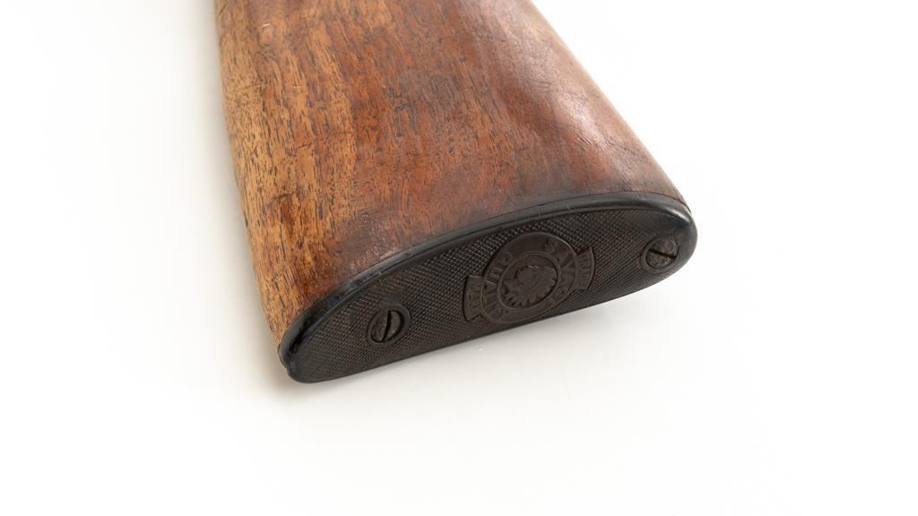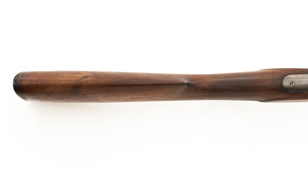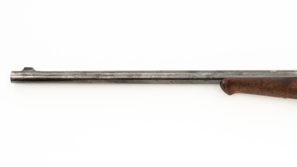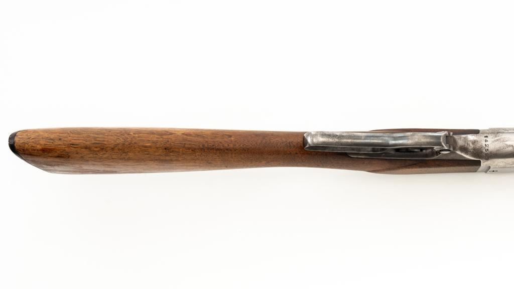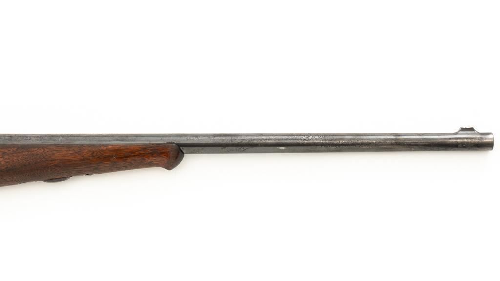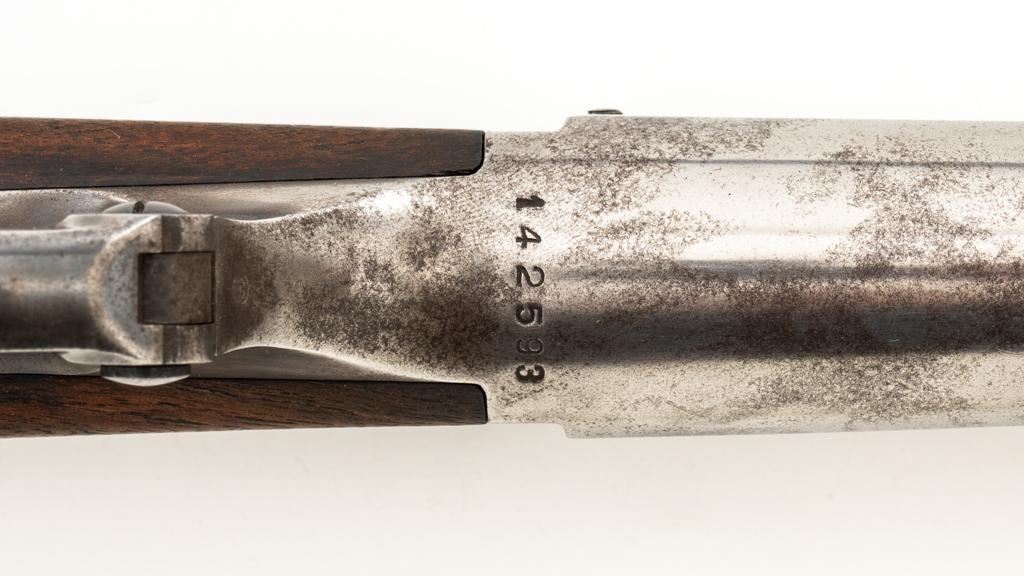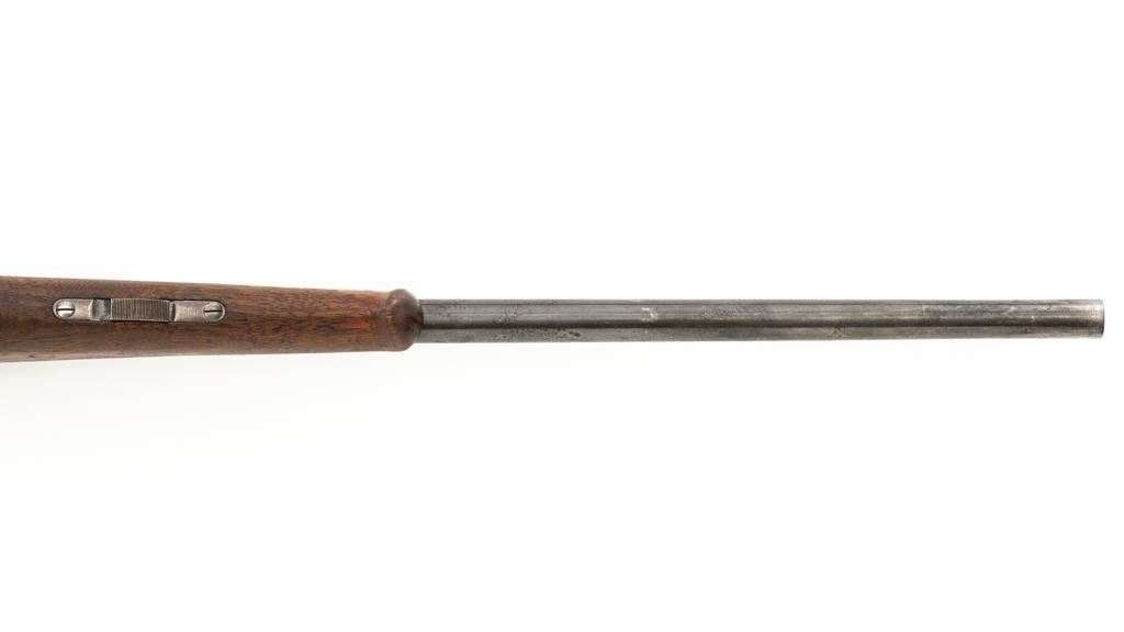 Savage Model 1899H Lever Action Takedown Rifle, #142593, .22 Hi-Power cal., 20'' round barrel, with blue finish. Smooth walnut forend and straight grip stock with Schnabel forend, ending with a checkered hard rubber Savage buttplate, providing a 13.25'' LOP. Front sight blade is missing, adjustable ''U''-notch rear sight is marked ''Savage''. Rifle also features an internal rotary magazine with brass cartridge counter; receiver is drilled and tapped. Mfg'd 1913. Rifle is in very good condition, with the barrel retaining approx. 50%-60% thinning finish, with wear at the muzzle, scattered spots of light erosion. Receiver has worn to silver, with areas of light corrosion, and an indentation on the left side. Stock is in very good condition, with impressions and thinning finish, particularly on the underside of the buttstock. Forend is correctly marked with the matching serial number on the interior. Action functions smoothly and locks up securely. Bore is very good with some areas of light erosion and defined rifling. Est.: $600-$900. (C&R/PPT)