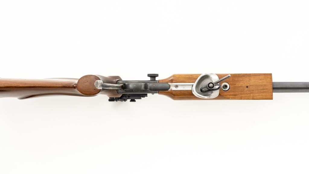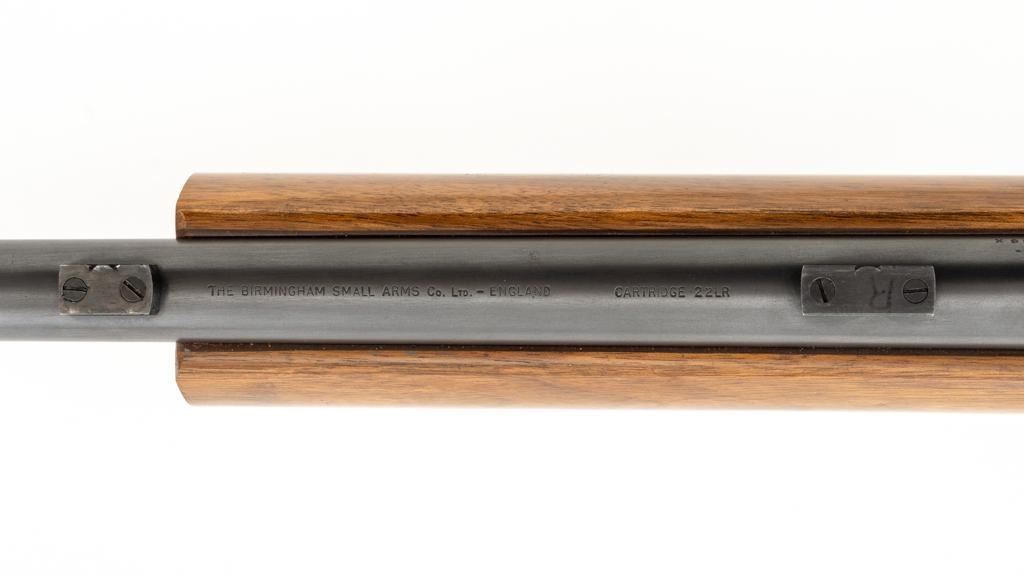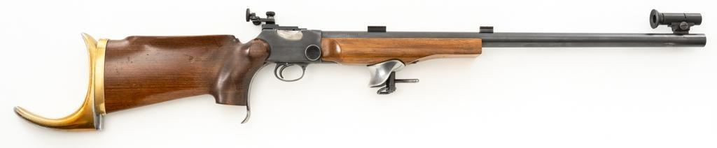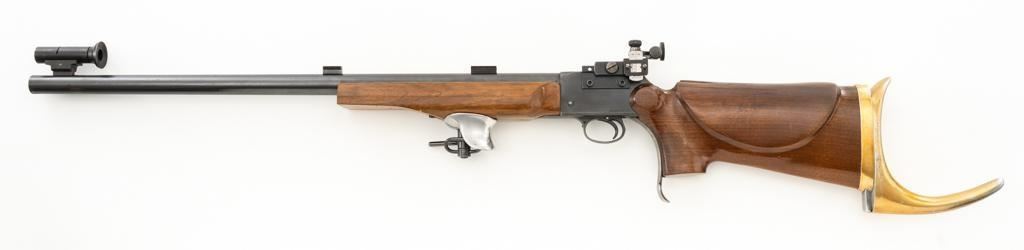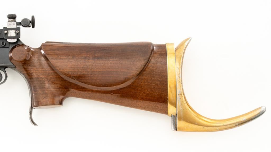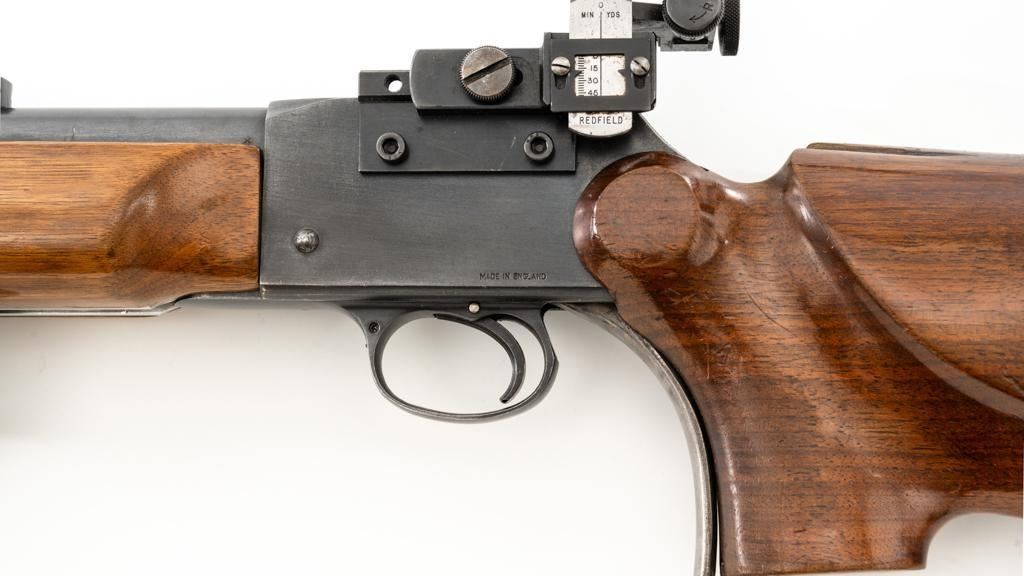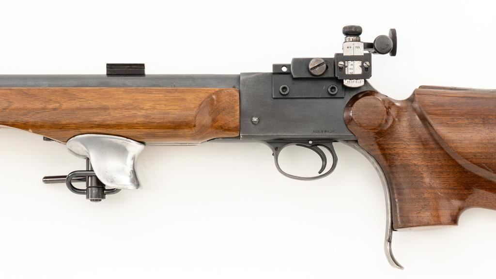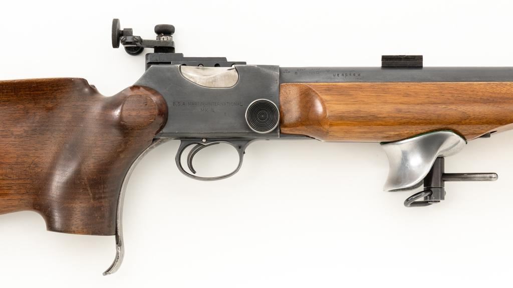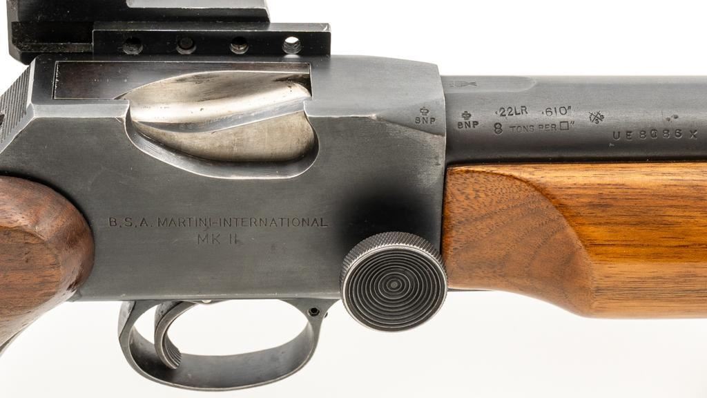 Birmingham Small Arms (BSA) Martini International MK II Match Single Shot Rifle, #UE8086X, .22 LR cal., 26'' heavy barrel with two (2) sight blocks, Redfield Olympic Model globe style front sight with insert and Redfield match aperture rear sights. Metal with a blued finish. The smooth walnut two-piece heavy target pistol grip stock has a 2.5'' wide forend, exaggerated rollover cheekpiece, accessories rail, rest, and adjustable Schuetzen style metal buttplate, providing a 12.5'' LOP. Trigger is adjustable. Factory markings are clear, with numerous English proofs and acceptance marks on right side of the barrel. Barrel address reads ''THE BIRMINGHAM SMALL ARMS Co. LTD. ENGLAND''. Marked ''MADE IN ENGLAND'' on left side of the receiver. Mfg'd circa 1953-1959. Rifle is in fine overall condition, retaining approx 93%-94%, with wear at the muzzle, and some thinning finish along the barrel. Receiver shows moderate edgewear and light surface erosion. Lever displays traces of original color case hardened finish drifting to silver. Stock is in very good condition, with the forend ground flat, and worn groove on top of the comb. Action functions smoothly, locks up securely, with a crisp trigger. Bore is very good with well-defined rifling. Est.: $600-$800. (C&R/PPT)