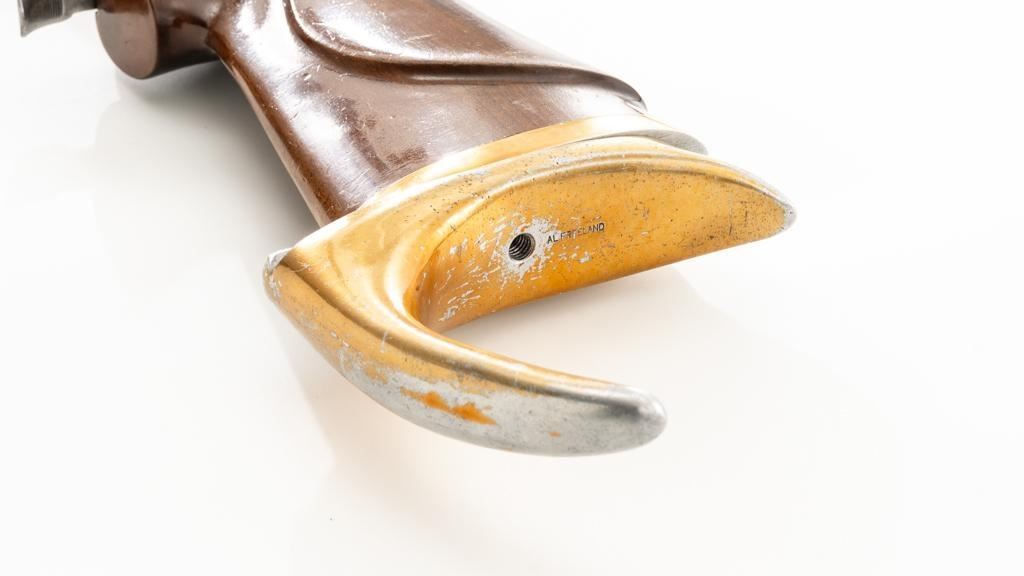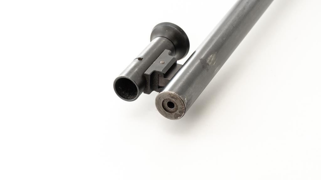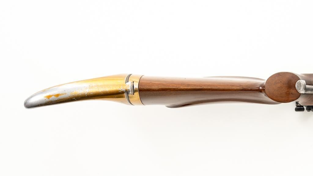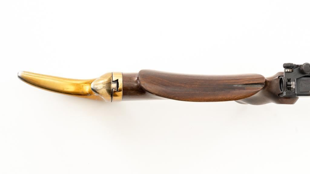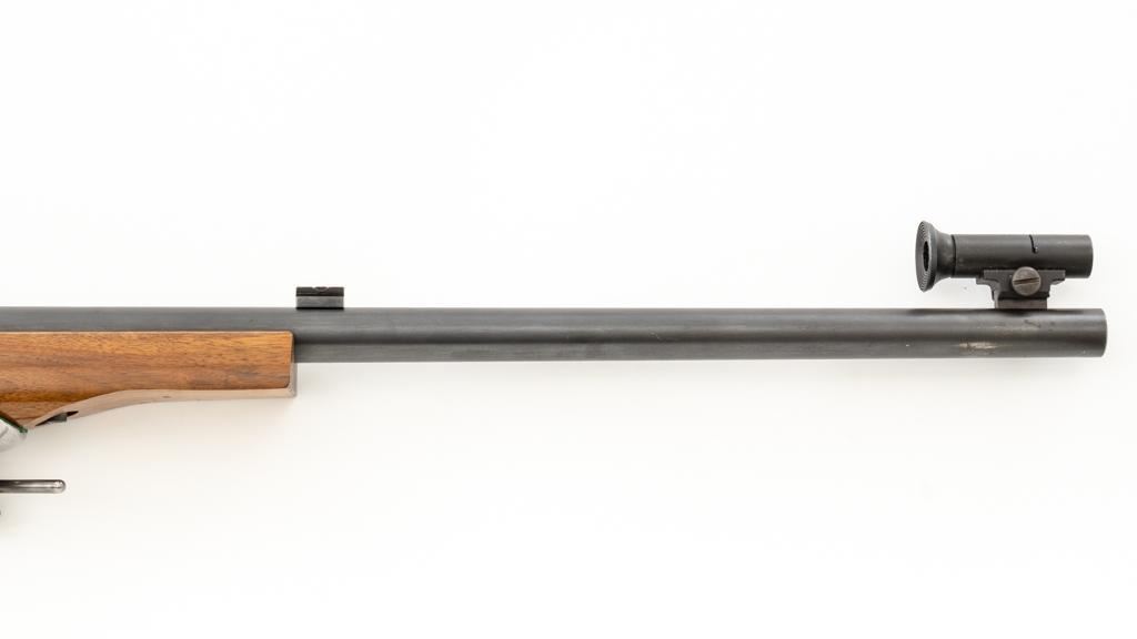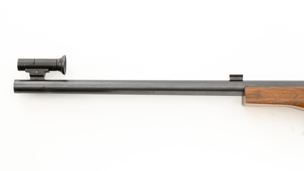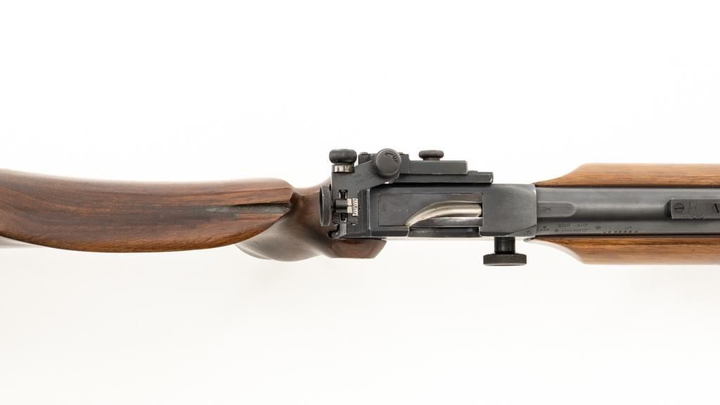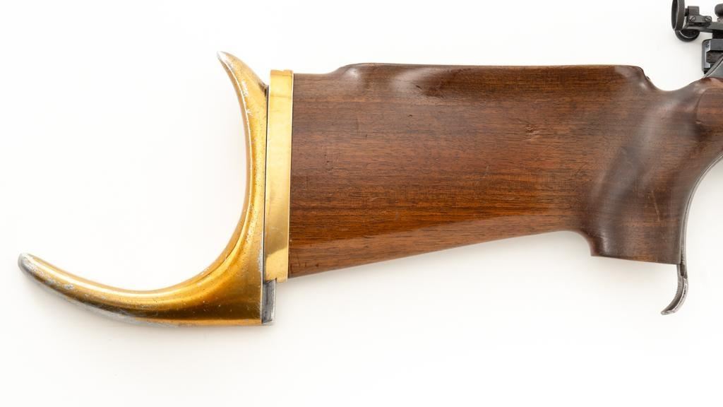 Birmingham Small Arms (BSA) Martini International MK II Match Single Shot Rifle, #UE8086X, .22 LR cal., 26'' heavy barrel with two (2) sight blocks, Redfield Olympic Model globe style front sight with insert and Redfield match aperture rear sights. Metal with a blued finish. The smooth walnut two-piece heavy target pistol grip stock has a 2.5'' wide forend, exaggerated rollover cheekpiece, accessories rail, rest, and adjustable Schuetzen style metal buttplate, providing a 12.5'' LOP. Trigger is adjustable. Factory markings are clear, with numerous English proofs and acceptance marks on right side of the barrel. Barrel address reads ''THE BIRMINGHAM SMALL ARMS Co. LTD. ENGLAND''. Marked ''MADE IN ENGLAND'' on left side of the receiver. Mfg'd circa 1953-1959. Rifle is in fine overall condition, retaining approx 93%-94%, with wear at the muzzle, and some thinning finish along the barrel. Receiver shows moderate edgewear and light surface erosion. Lever displays traces of original color case hardened finish drifting to silver. Stock is in very good condition, with the forend ground flat, and worn groove on top of the comb. Action functions smoothly, locks up securely, with a crisp trigger. Bore is very good with well-defined rifling. Est.: $600-$800. (C&R/PPT)