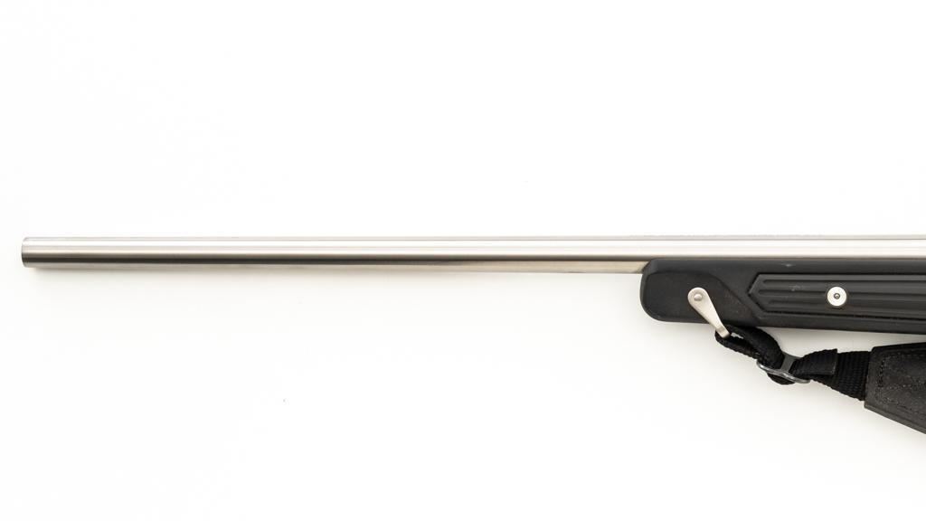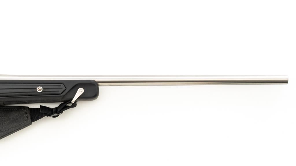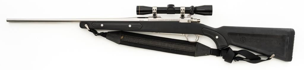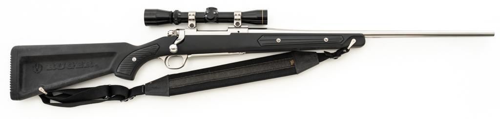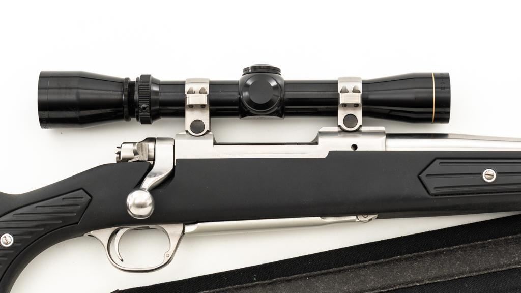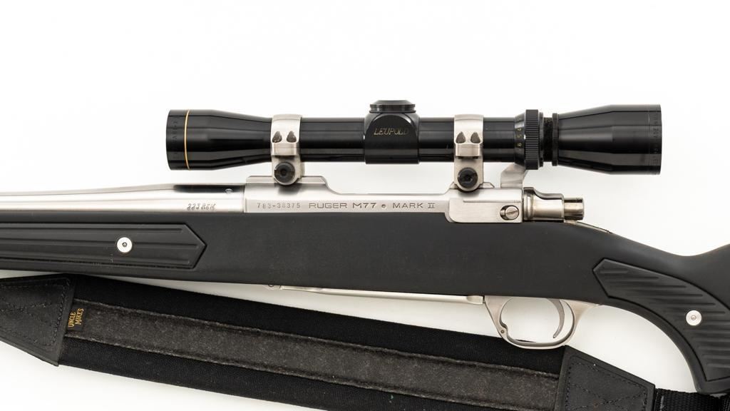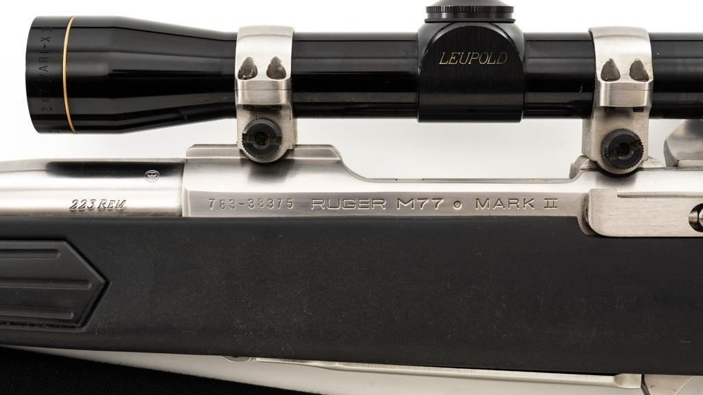 Ruger M77 MKII All Weather Bolt Action Rifle, #783-38375, .223 Rem. cal., 22'' barrel, stainless steel finish. Matte black DuPont Zytel synthetic ''Boat Paddle'' stock with sling swivels, padded Uncle Mike's rifle sling, ending with a ribbed solid rubber recoil pad, providing a 13.75'' LOP. There is no provision for sights. Rifle features a factory grooved receiver, hinged box magazine, and the bolt is etched with matching serial number. Mfg'd 1995. Topped with stainless steel rings and a Leupold VARI-X II 2-7x scope, finished in gloss black, with a duplex reticle. Scope is in excellent condition, with clear, crisp optics. Rifle is in excellent overall condition, showing little use. Stock with only light storage marks. Action functions smoothly with a crisp trigger. Bore is mirror bright with excellent rifling. Est.: $700-$1,000. (Modern/PPT)