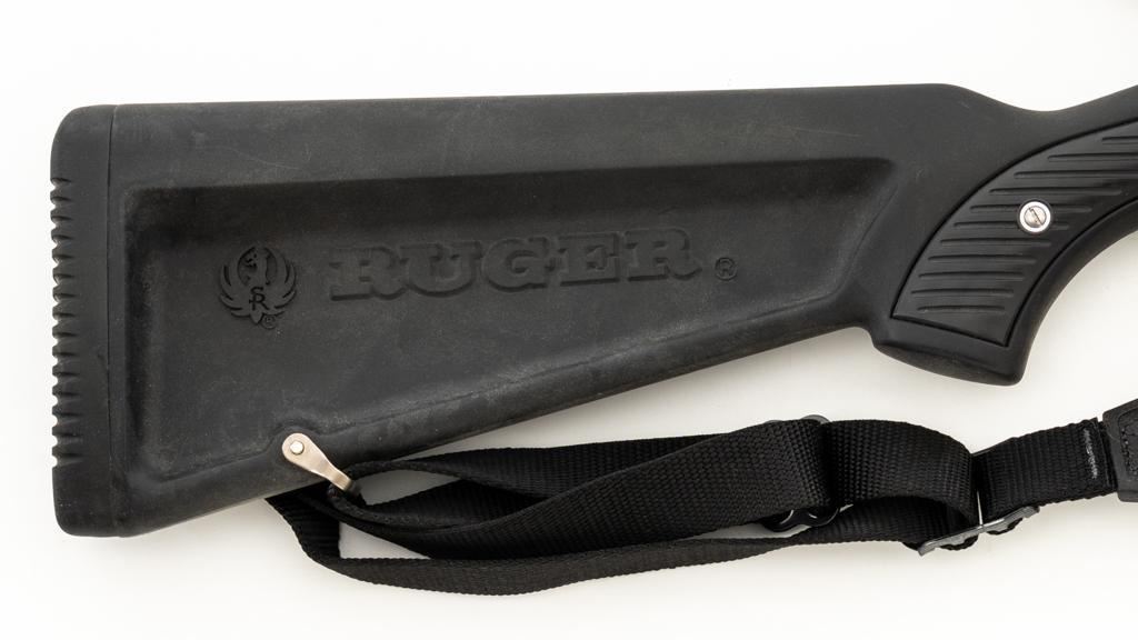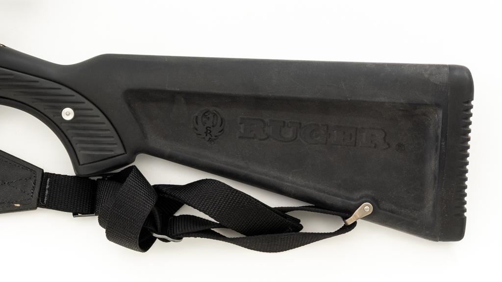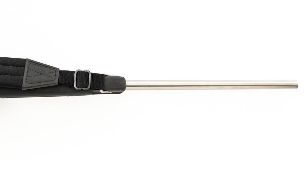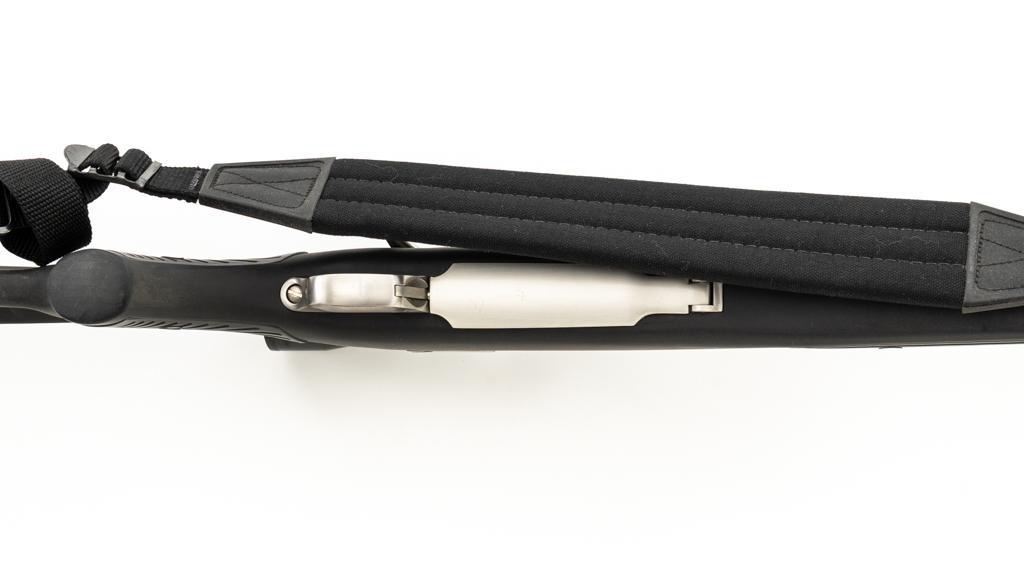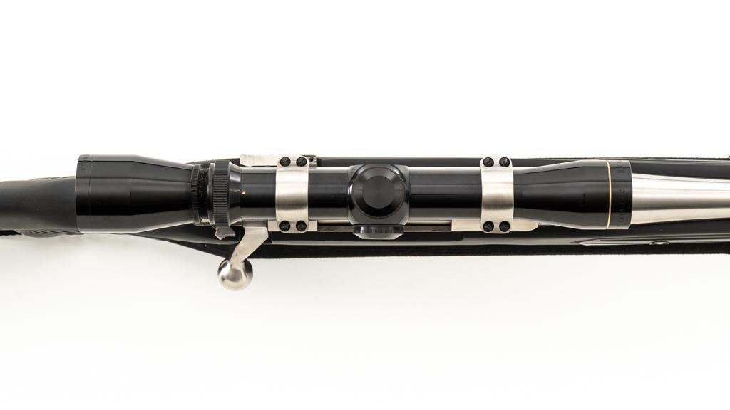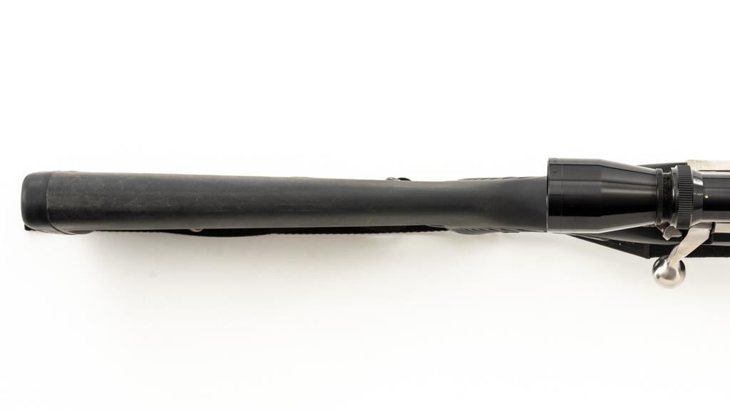 Ruger M77 MKII All Weather Bolt Action Rifle, #783-38375, .223 Rem. cal., 22'' barrel, stainless steel finish. Matte black DuPont Zytel synthetic ''Boat Paddle'' stock with sling swivels, padded Uncle Mike's rifle sling, ending with a ribbed solid rubber recoil pad, providing a 13.75'' LOP. There is no provision for sights. Rifle features a factory grooved receiver, hinged box magazine, and the bolt is etched with matching serial number. Mfg'd 1995. Topped with stainless steel rings and a Leupold VARI-X II 2-7x scope, finished in gloss black, with a duplex reticle. Scope is in excellent condition, with clear, crisp optics. Rifle is in excellent overall condition, showing little use. Stock with only light storage marks. Action functions smoothly with a crisp trigger. Bore is mirror bright with excellent rifling. Est.: $700-$1,000. (Modern/PPT)