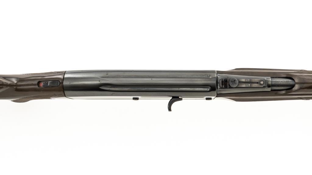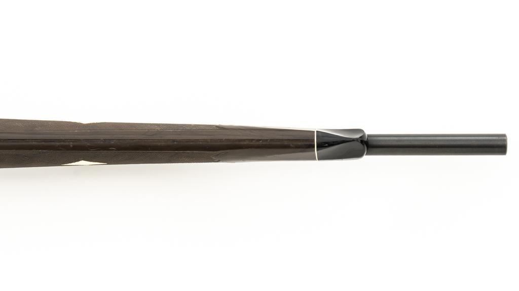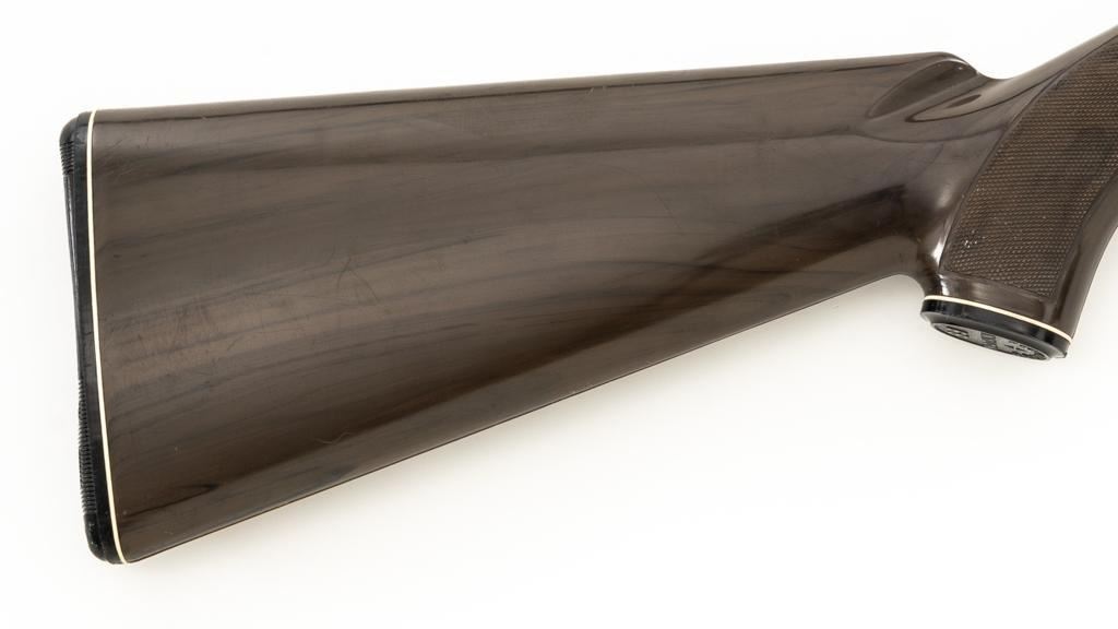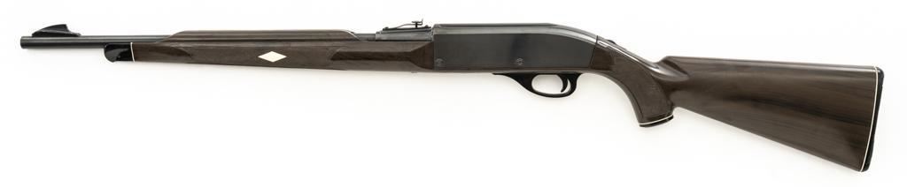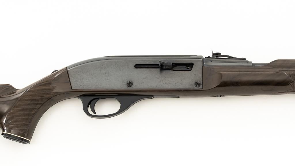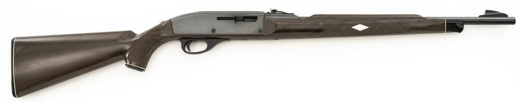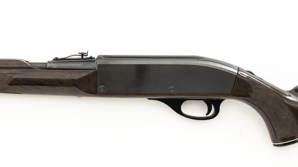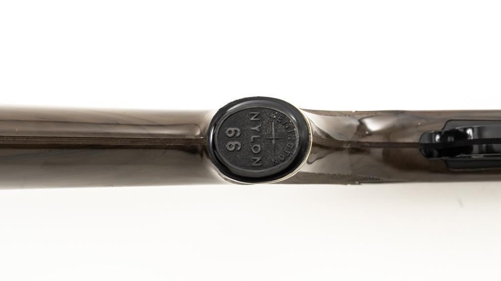Scarce Seneca Green Remington Nylon 66 Semi-Automatic Rifle, #NVSN, .22 LR cal., 19.5'' barrel, blue finish, checkered Zytel plastic two-piece pistol grip stock in Seneca Green with faux ivory diamonds and Remington Nylon 66 grip cap, ending with a ribbed plastic buttplate, providing a 13.75'' LOP. Rifle also features a ramped blade front and adjustable ''U''-notched rear sight, factory grooved receiver, and tubular magazine that loads through the buttstock. Mfg'd 1961. Rifle is in very good overall condition, retaining approx. 96%-97% factory finish with light wear at the muzzle and around the front sight, scattered minor marks and freckling to the receiver cover. Stock with moderate scuffs and scratches scattered throughout. Action functions smoothly. Bore is bright with well-defined rifling. Approx. 45,000 were produced with the Seneca Green stock. Est.: $500-$700. (C&R)