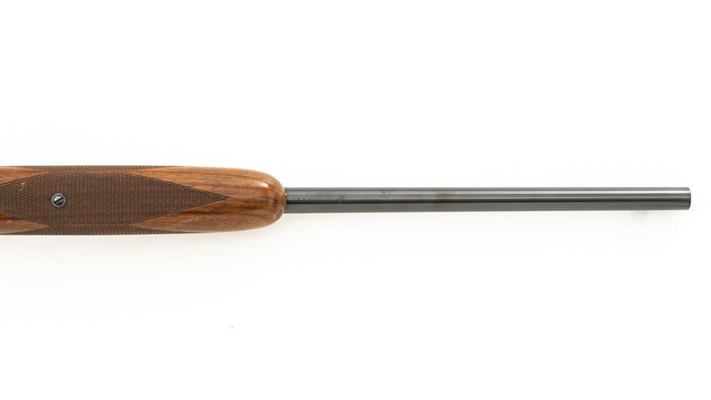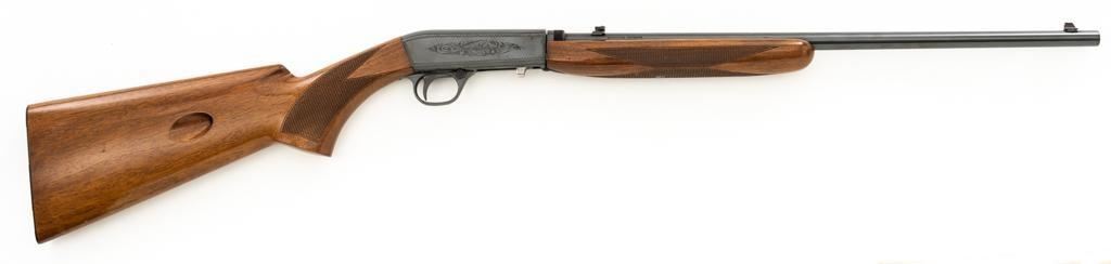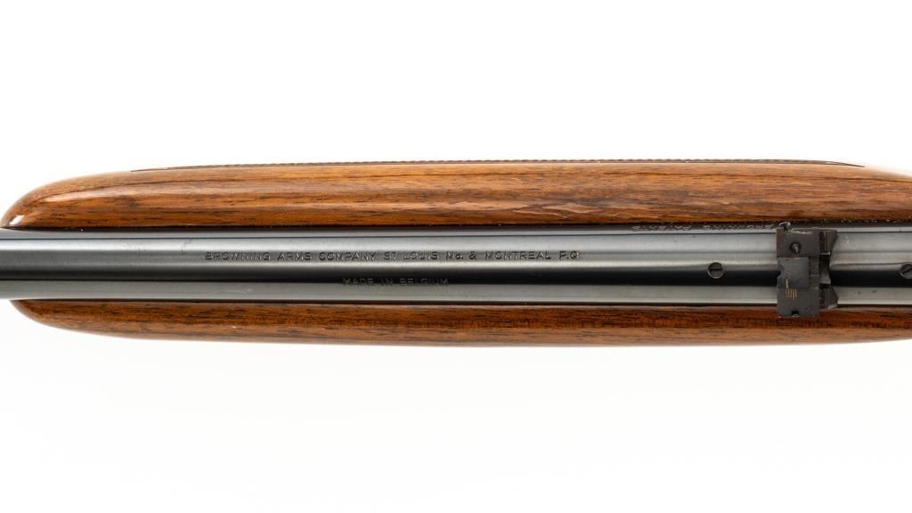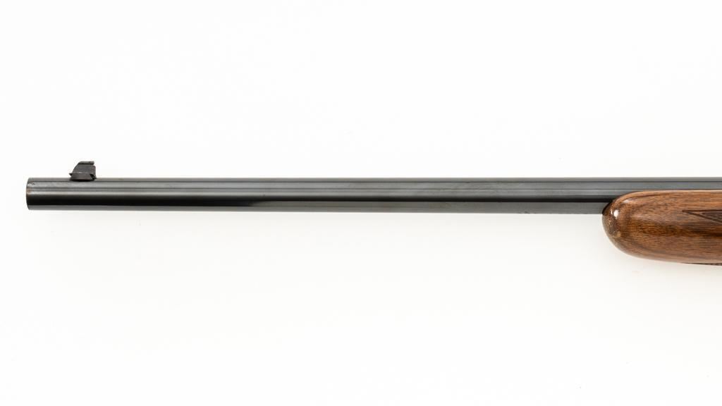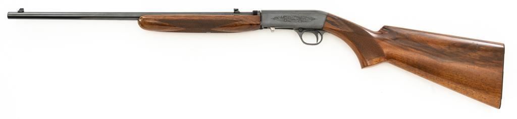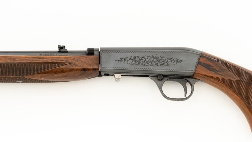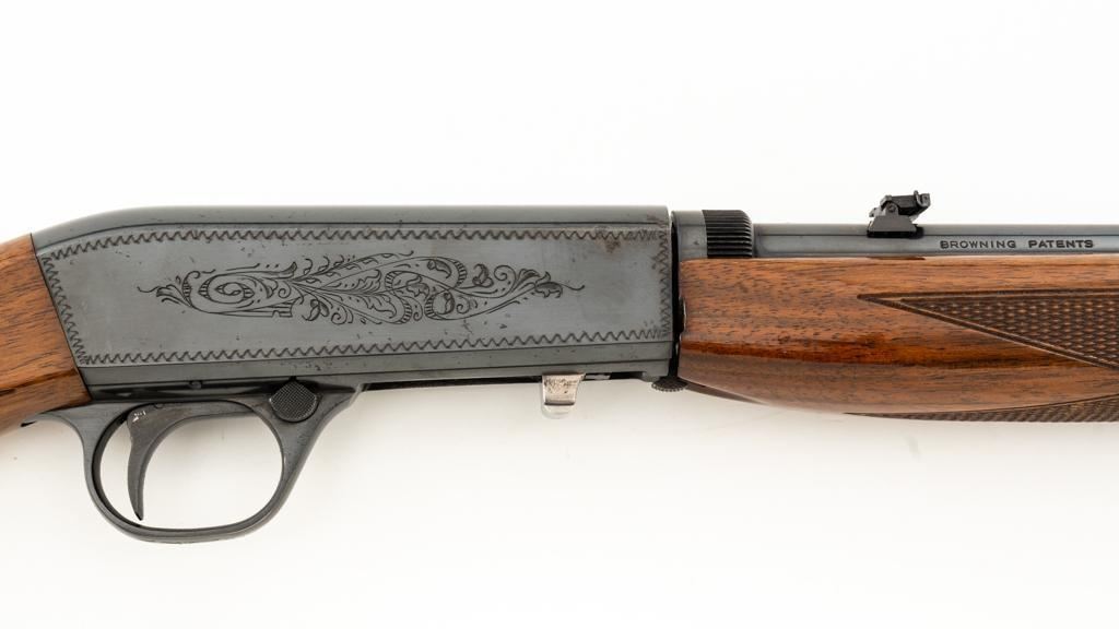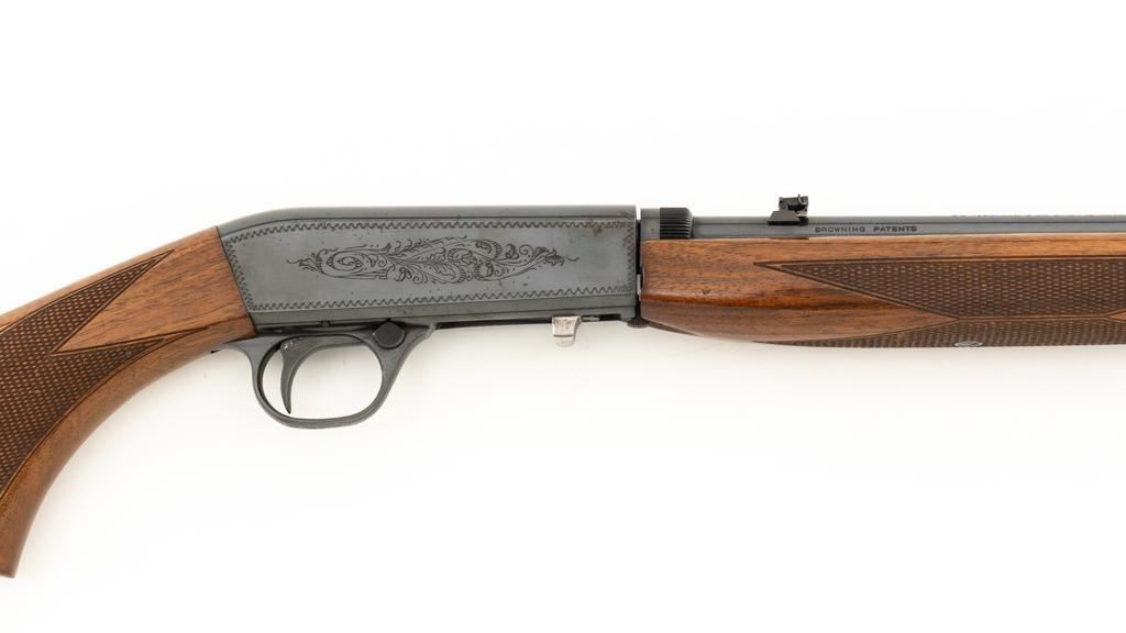 Belgian Browning Model SA-22 Semi-Automatic Takedown Rifle, #69T16997, .22 LR cal., 19'' barrel, blue finish, checkered walnut forend and pistol grip stock, ending with a ribbed blue steel buttplate, providing a 14'' LOP. Includes factory dovetailed blade front and folding adjustable rear sight, with two drilled and tapped holes on each side of the rear sight, filled with plug screws. Factory markings are clear, with a Belgian proof on the bolt, and marked ''MADE IN BELGIUM'' on the barrel. Mfg'd 1969. Rifle is in near excellent overall condition, retaining approx. 97%-98% factory finish, with light wear at the muzzle, a few spots of minor corrosion on the underside of the barrel, and handling marks. Receiver displays fine border and light scroll engraving with some minor edgewear. Stock is in near excellent condition, with intermittent light indentations, and minor storage marks. Action functions smoothly. Bright bore is near excellent with well-defined rifling. Est.: $700-$900. (C&R)