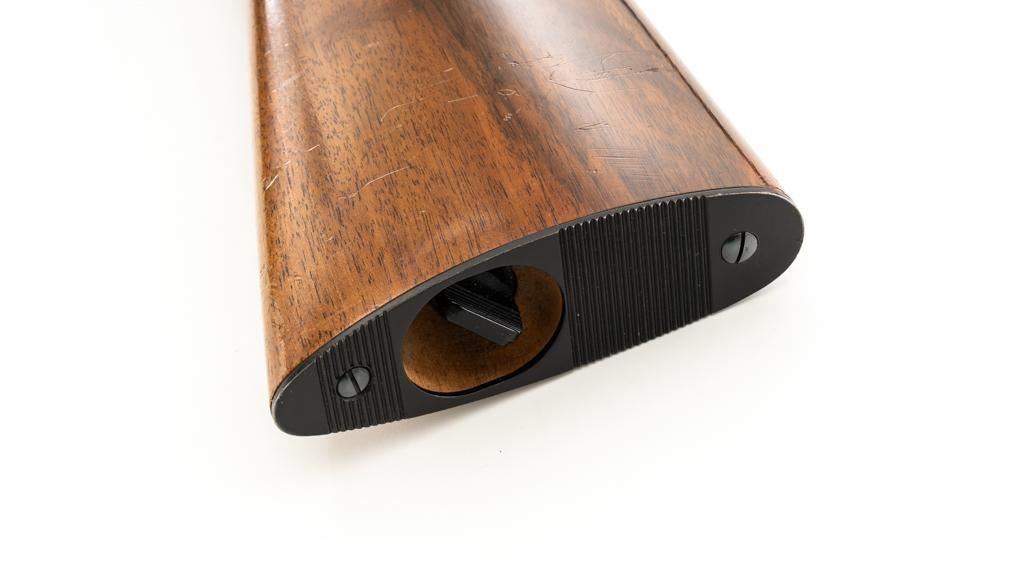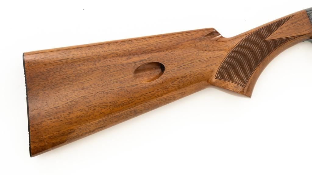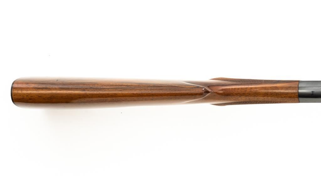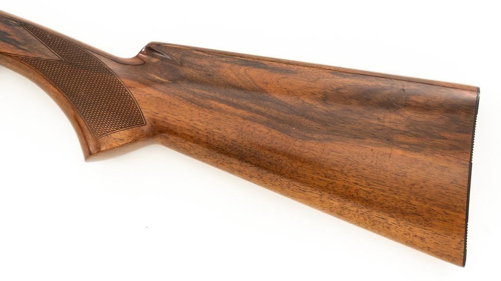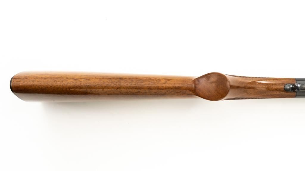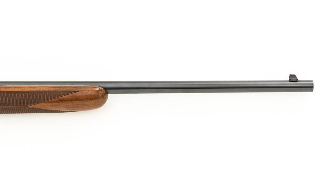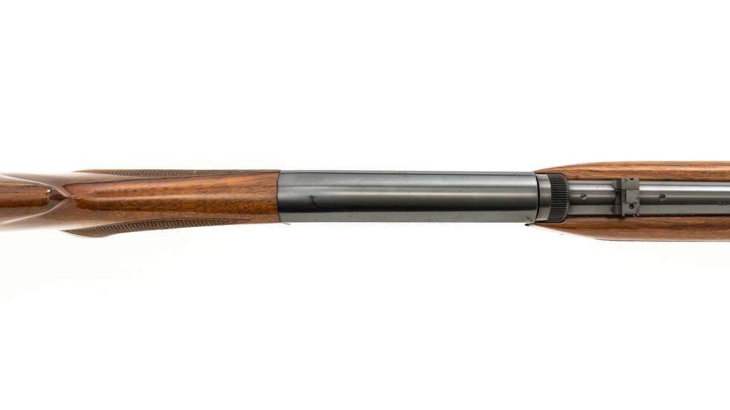 Belgian Browning Model SA-22 Semi-Automatic Takedown Rifle, #69T16997, .22 LR cal., 19'' barrel, blue finish, checkered walnut forend and pistol grip stock, ending with a ribbed blue steel buttplate, providing a 14'' LOP. Includes factory dovetailed blade front and folding adjustable rear sight, with two drilled and tapped holes on each side of the rear sight, filled with plug screws. Factory markings are clear, with a Belgian proof on the bolt, and marked ''MADE IN BELGIUM'' on the barrel. Mfg'd 1969. Rifle is in near excellent overall condition, retaining approx. 97%-98% factory finish, with light wear at the muzzle, a few spots of minor corrosion on the underside of the barrel, and handling marks. Receiver displays fine border and light scroll engraving with some minor edgewear. Stock is in near excellent condition, with intermittent light indentations, and minor storage marks. Action functions smoothly. Bright bore is near excellent with well-defined rifling. Est.: $700-$900. (C&R)