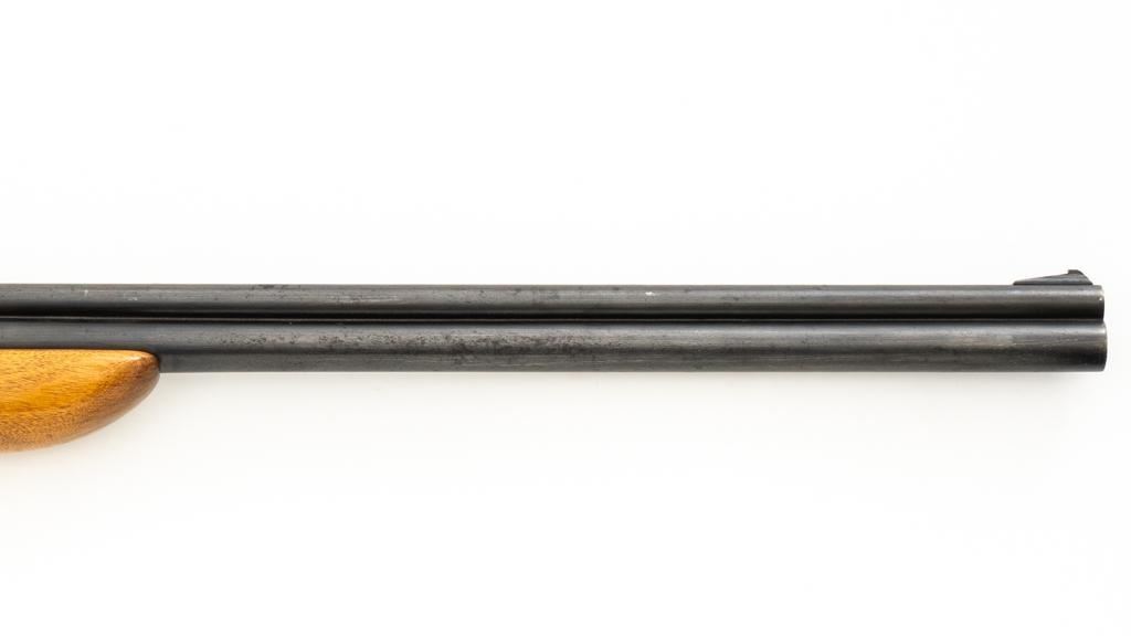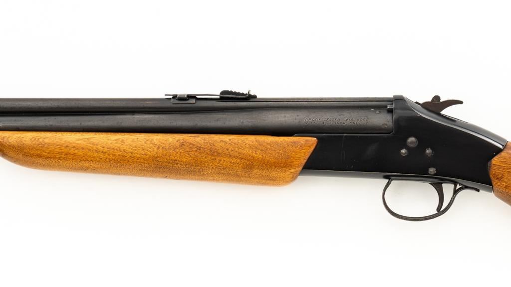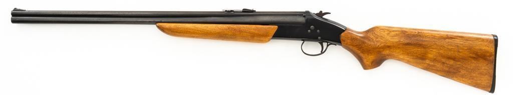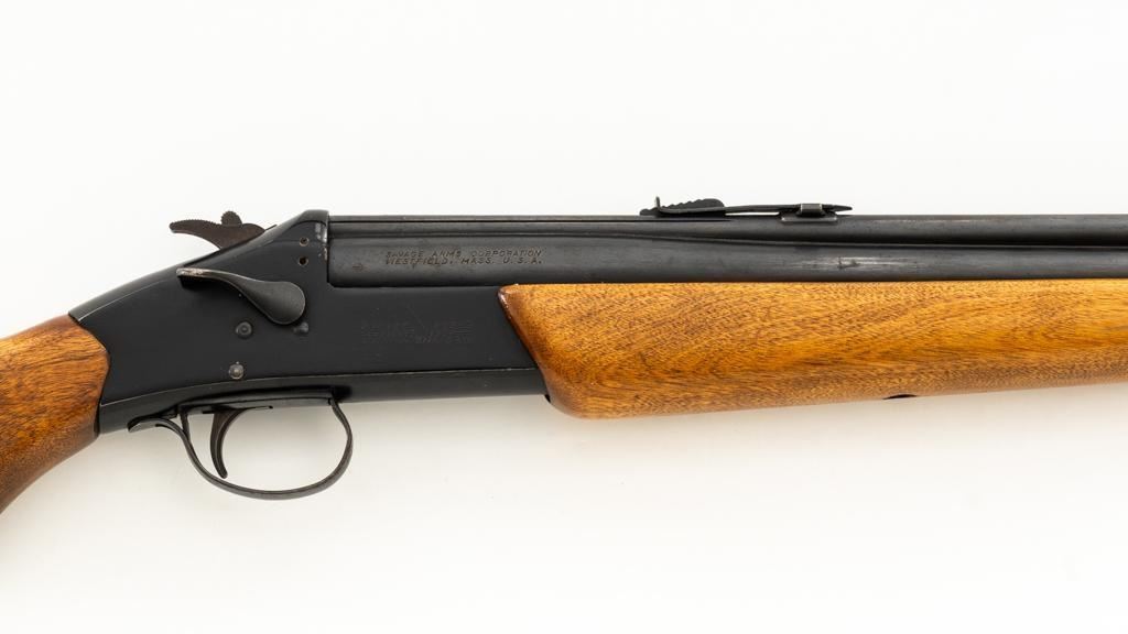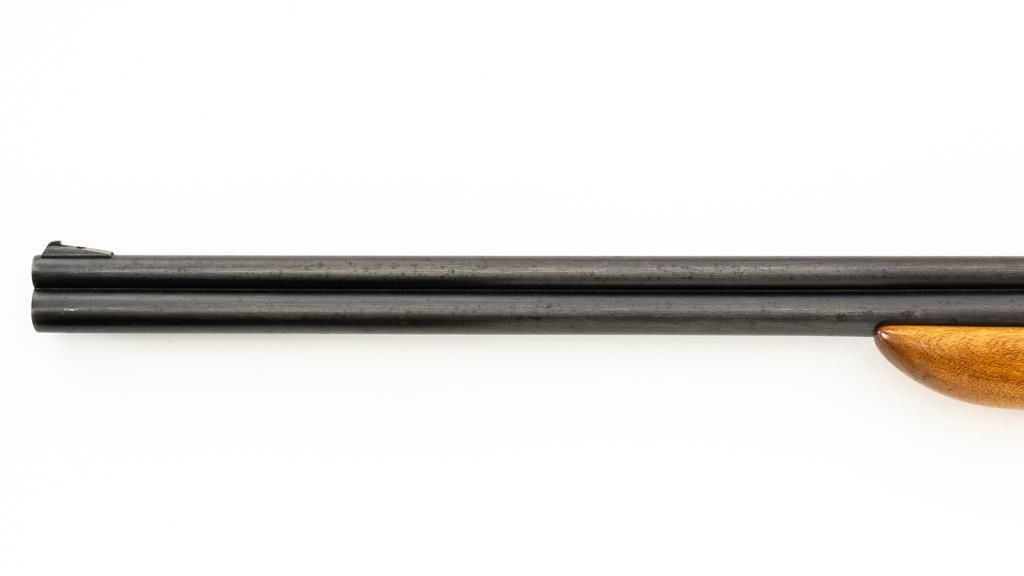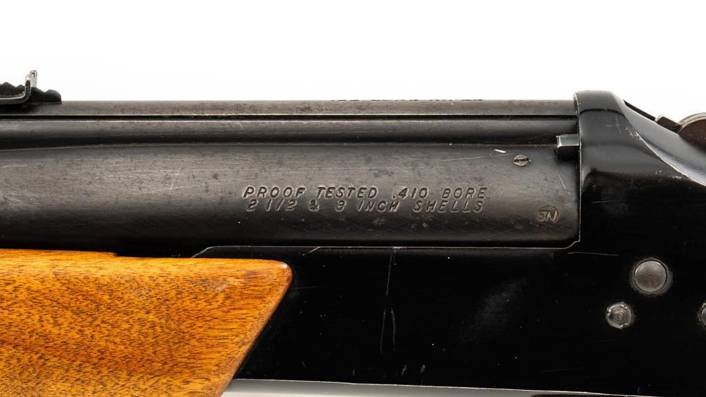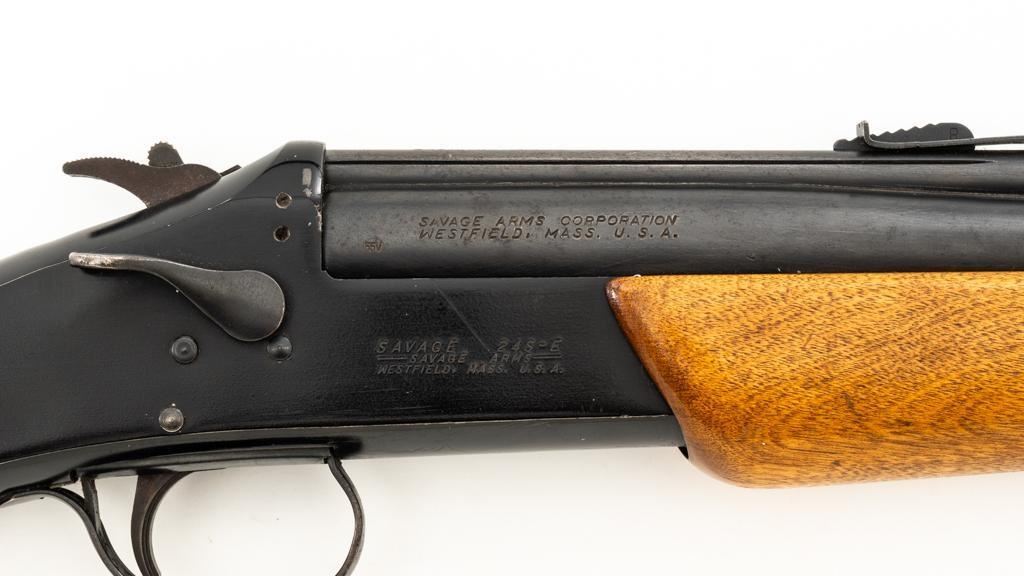 Savage Model 24S-E Combination Gun, #NVSN, .22 LR / .410 gauge, 24'' blued barrels, black receiver, smooth hardwood forend and pistol grip stock ending with a ribbed plastic buttplate, providing a 14'' LOP. Sights include a ramped blade front and standard elevator ''U''-notch rear. In very good+ overall condition, retaining approx. 90% metal finish, showing a few areas of thinning on the barrel. There are some small specks of patina and mild erosion on the barrel, near the breech. Receiver shows light high point edgewear and mild scratching. Stock is in very good condition with scuffs, shallow indentations, and a few areas of thinning finish. Action functions well and locks up securely. Smoothbore is bright throughout; rifled bore is very good with defined rifling. Est.: $400-$600. (C&R/PPT)