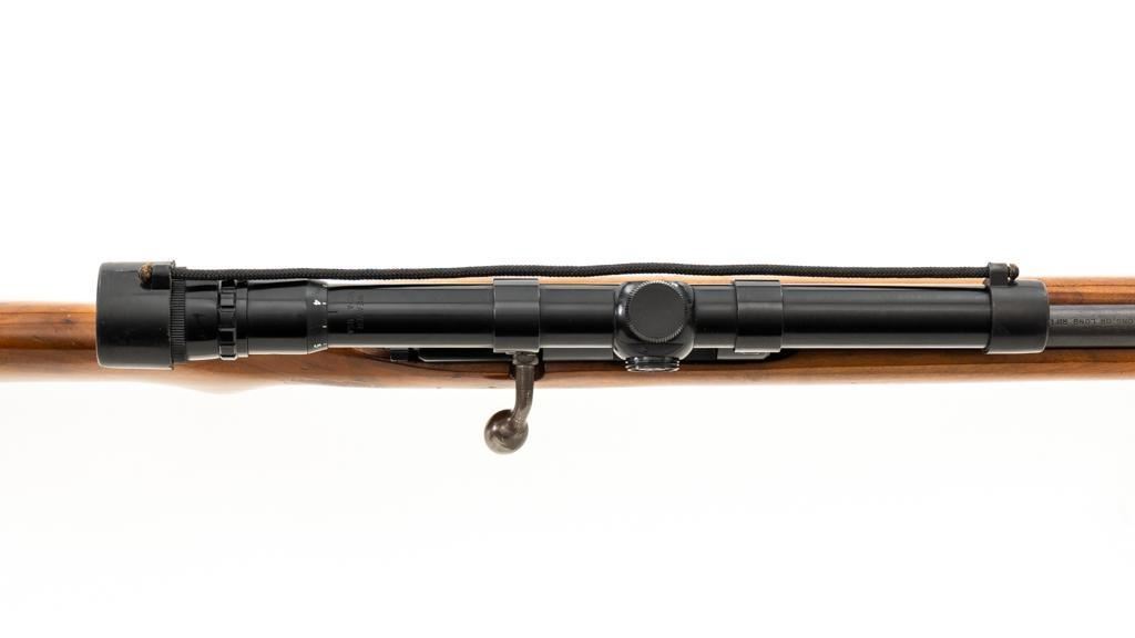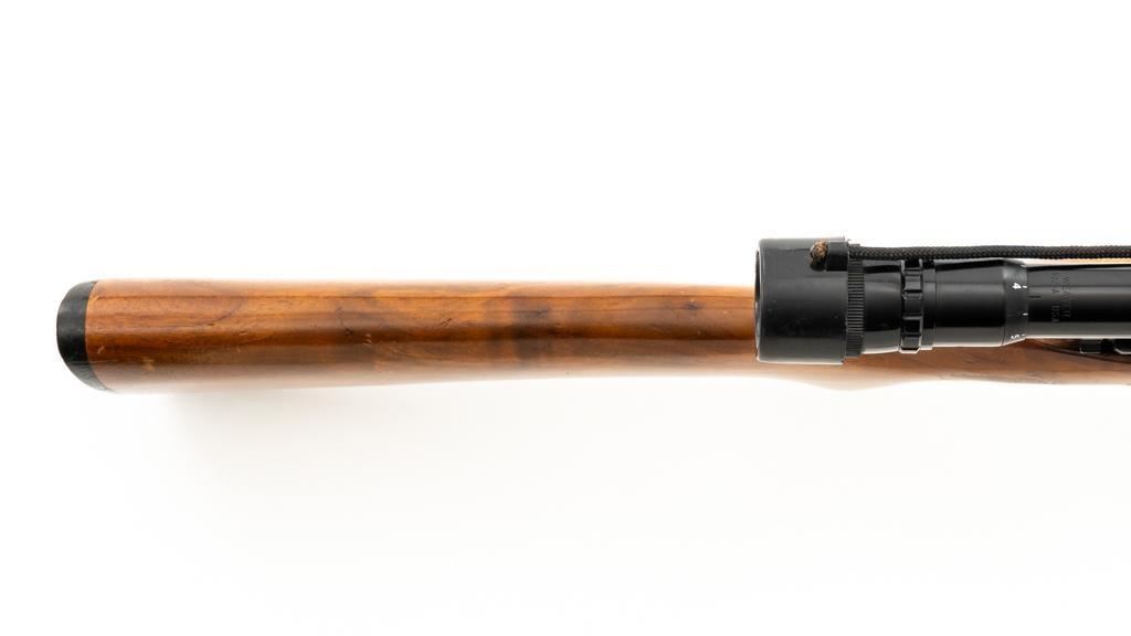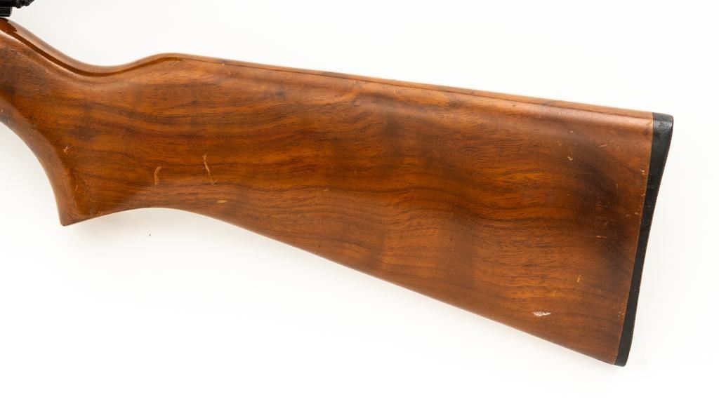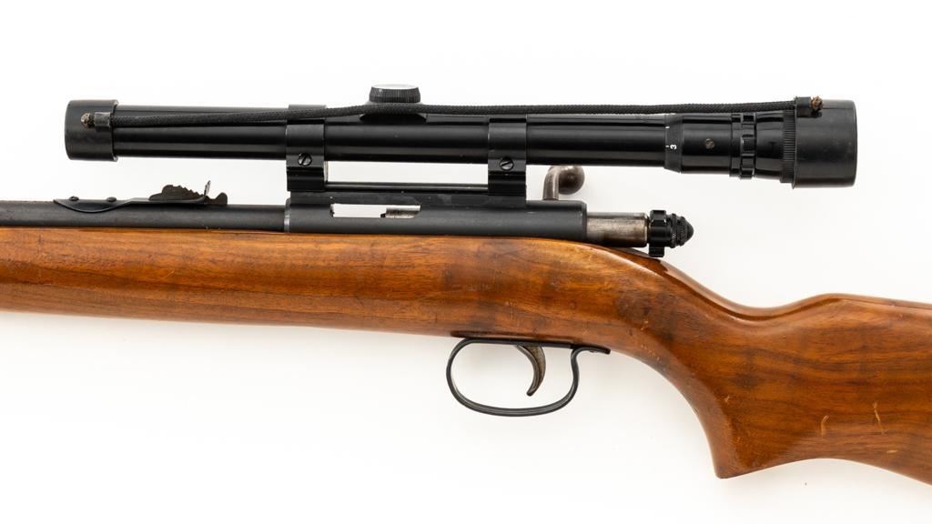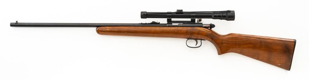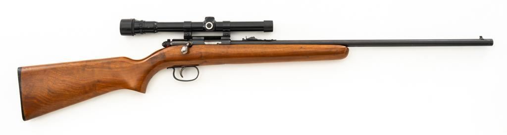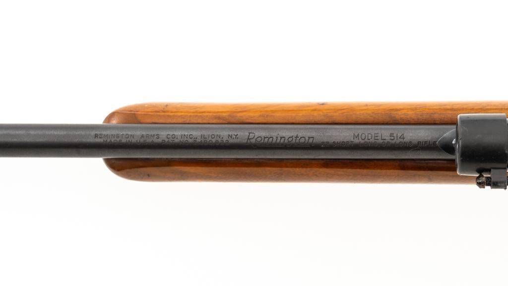 Remington Model 514 Bolt Action Single Shot Rifle, #NVSN, .22 S-L- LR cal., 23'' barrel, matte blue finish, smooth walnut one-piece pistol grip stock with a checkered plastic Remington buttplate, providing a 13.5'' LOP. Sights include a blade front and standard elevator rear with ''U''-notched groove. Rifle is topped with a Weaver one-piece base, rings, and Weaver V-22A 3-6x scope with gloss black, duplex reticle, and includes a set of plastic lens covers. Exterior of the scope shows moderate age and wear, optics are clear. Rifle is in fine overall condition, retaining approx 94%-95% factory blue finish with wear at the muzzle, scattered scuffs along the barrel. Receiver and trigger guard show light edgewear and spots of minor surface erosion. Stock with scattered scuffs, scratches, and there is some loss and flaking of finish at the wrist. Action is a little stiff and would benefit from through cleaning. Bright bore is near excellent with crisp rifling. Est.: $150-$250. (C&R/PPT)