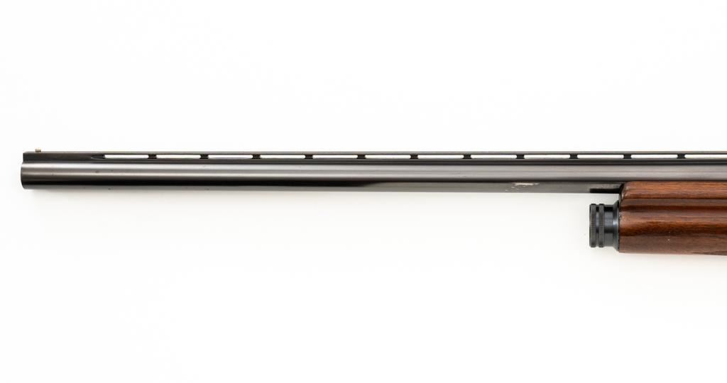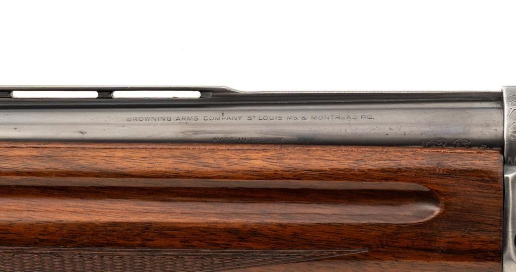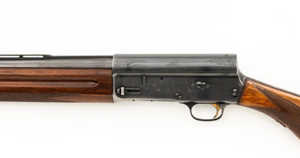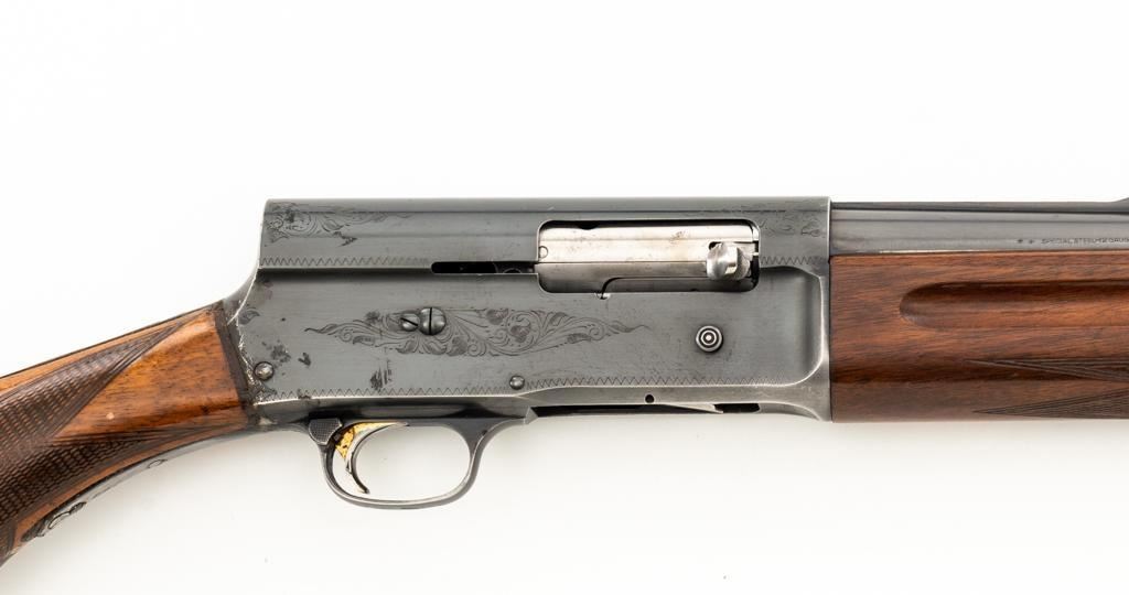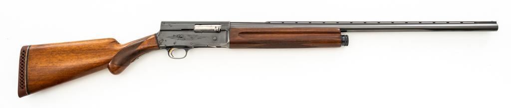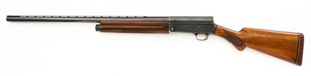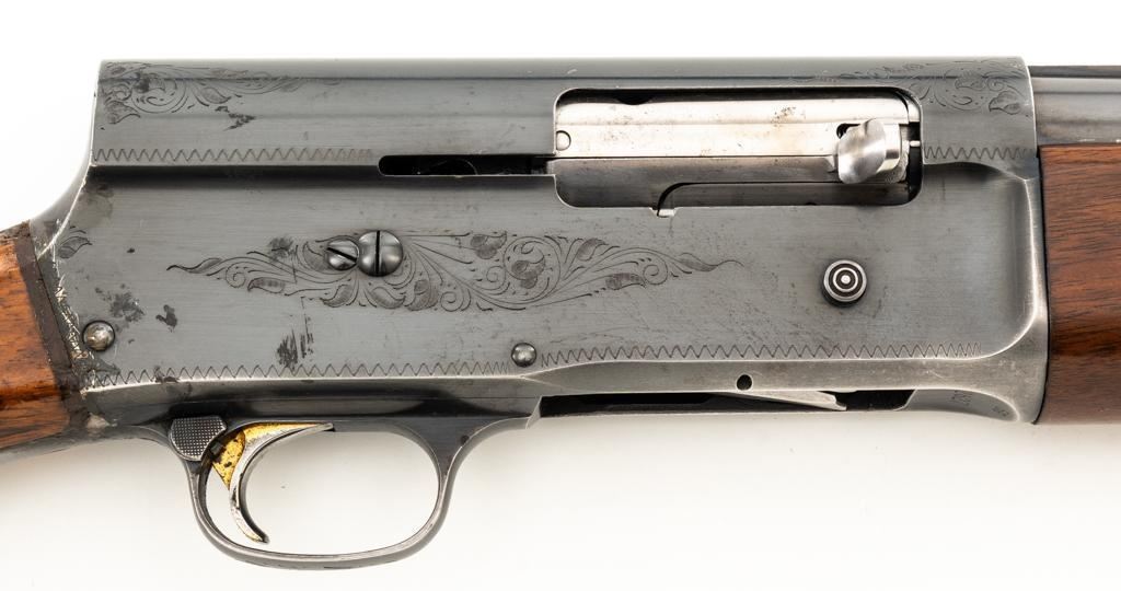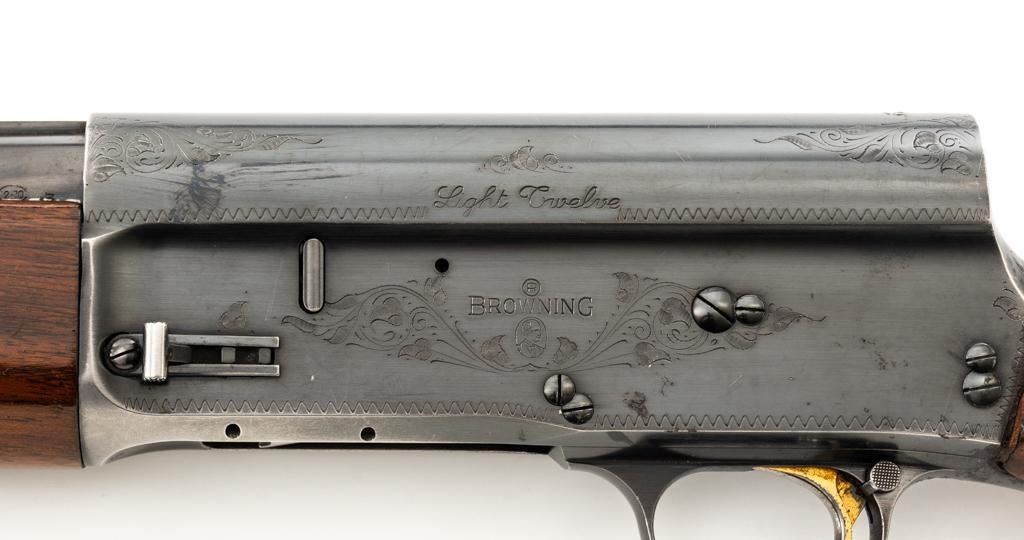 Belgian Browning ''Light Twelve'' Auto-5 Semi-Automatic Shotgun, #5G2627, 12 ga., 27.6'' vent rib barrel with 2-3/4'' chamber, Modified choke, silver bead front sight. Blued finish with standard engraving to the receiver. Checkered pistol grip walnut stock with gloss finish and red Pachmayr ventilated recoil pad; LOP is 15.25''. Mfg'd 1965. Shotgun is in fine overall condition retaining approx. 85%-88% factory blue, with scattered scratches and handling marks; receiver with thinning to the finish, mainly around the loading port. Gold plated trigger has been polished to silver. Stock and forend with handling marks and light dents. An additional coat of varnish has been added. The area of the stock touching the receiver has had an approx. 1/16'' shim of wood and bedding compound added. It appears the upper and lower tang have been bedded. Checkering is clean and unmarred. Action functions smoothly and locks up tight; bore is bright. Est.: $500-$700. (C&R/PPT)