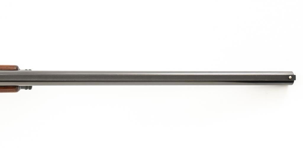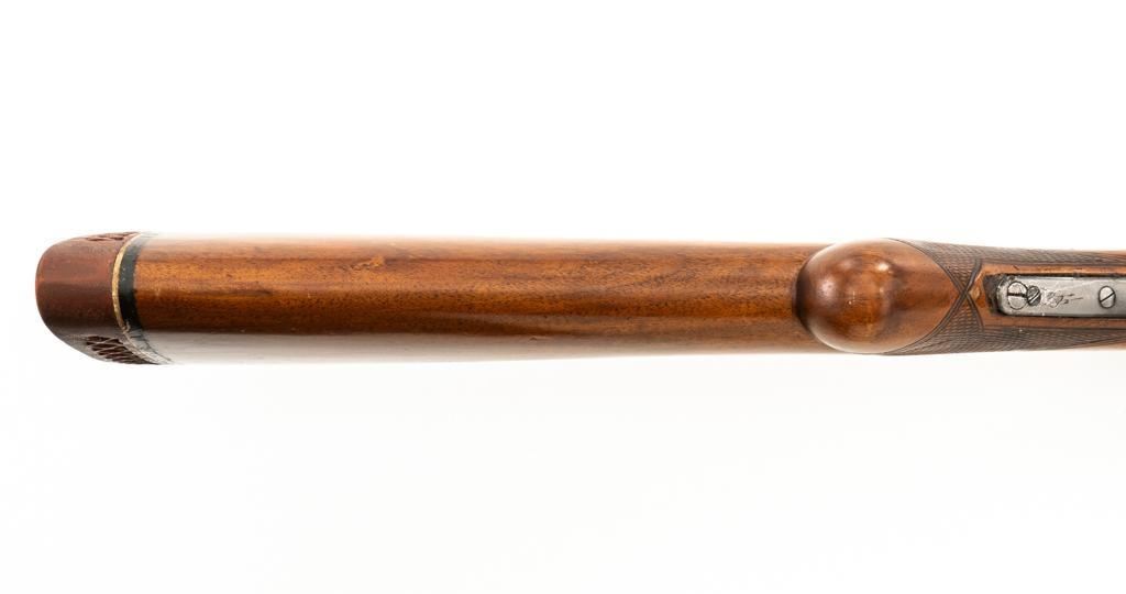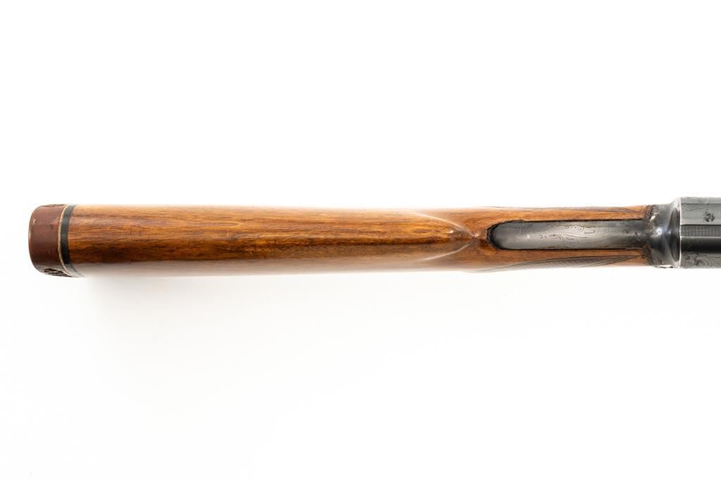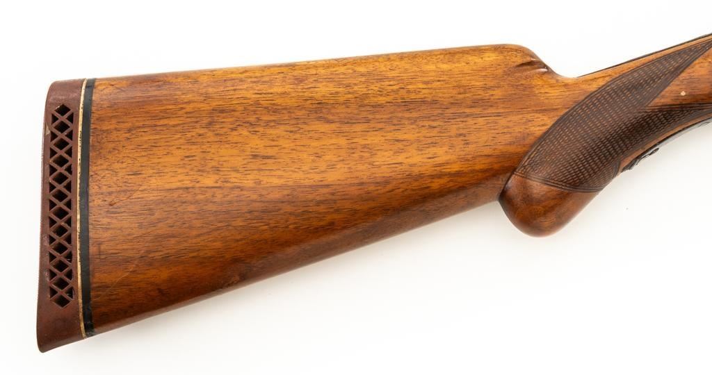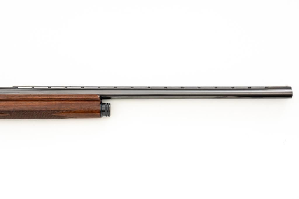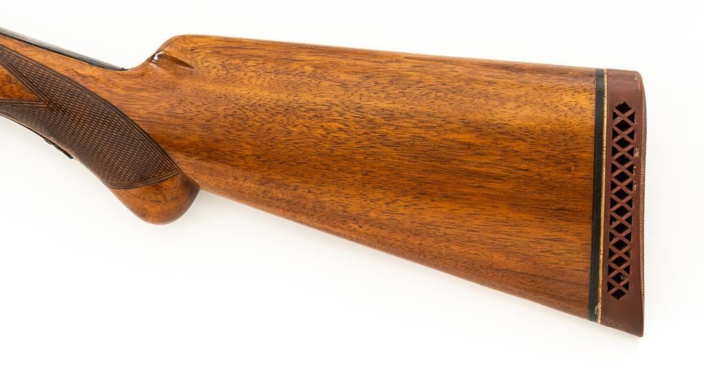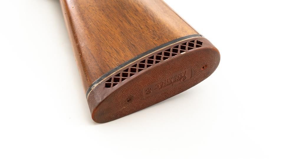 Belgian Browning ''Light Twelve'' Auto-5 Semi-Automatic Shotgun, #5G2627, 12 ga., 27.6'' vent rib barrel with 2-3/4'' chamber, Modified choke, silver bead front sight. Blued finish with standard engraving to the receiver. Checkered pistol grip walnut stock with gloss finish and red Pachmayr ventilated recoil pad; LOP is 15.25''. Mfg'd 1965. Shotgun is in fine overall condition retaining approx. 85%-88% factory blue, with scattered scratches and handling marks; receiver with thinning to the finish, mainly around the loading port. Gold plated trigger has been polished to silver. Stock and forend with handling marks and light dents. An additional coat of varnish has been added. The area of the stock touching the receiver has had an approx. 1/16'' shim of wood and bedding compound added. It appears the upper and lower tang have been bedded. Checkering is clean and unmarred. Action functions smoothly and locks up tight; bore is bright. Est.: $500-$700. (C&R/PPT)