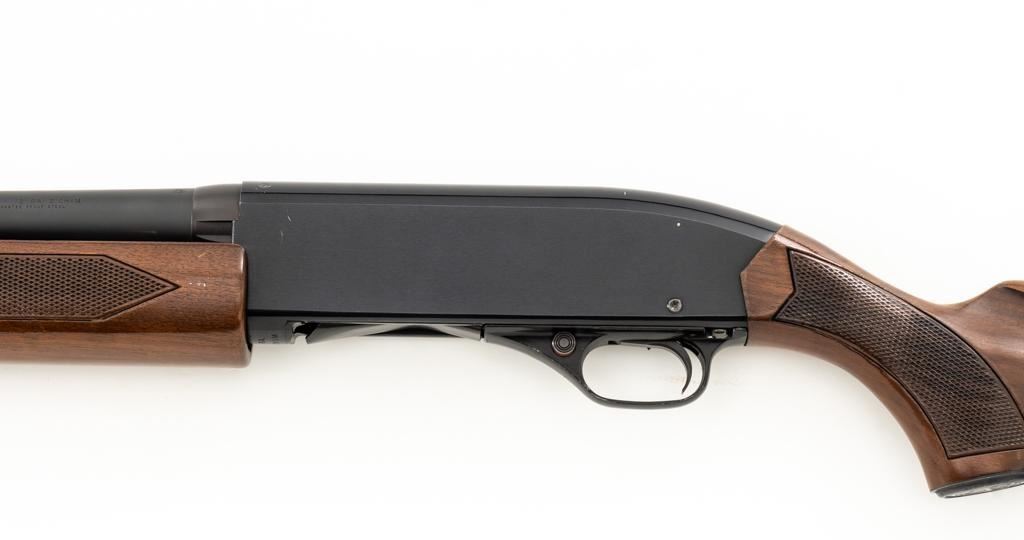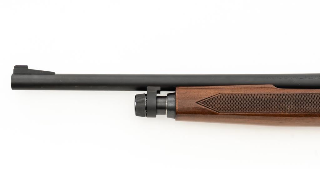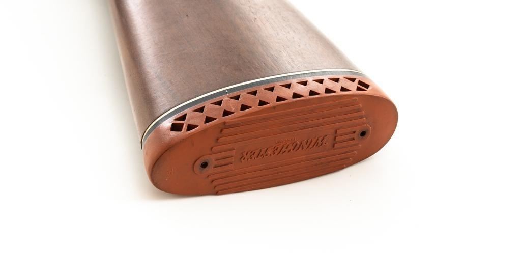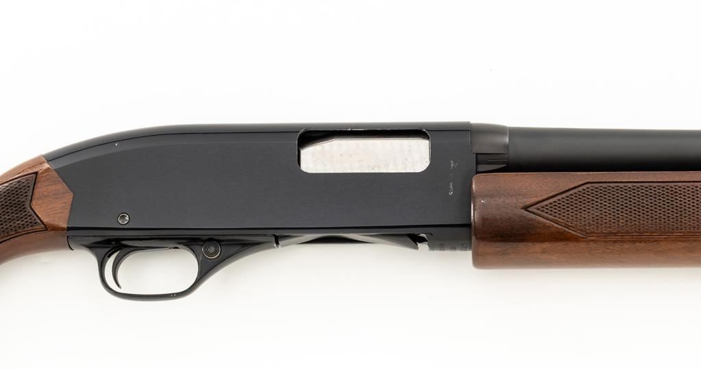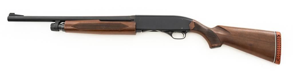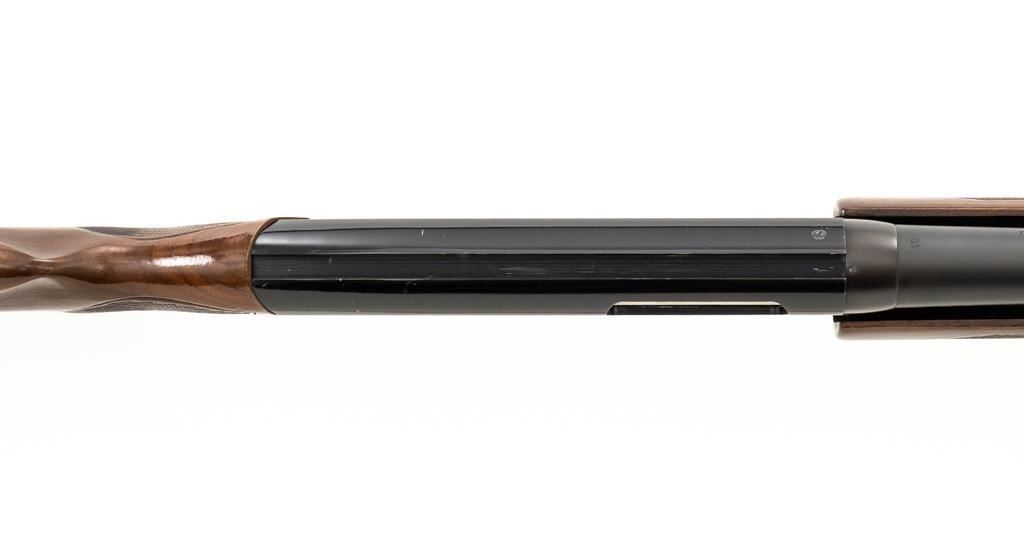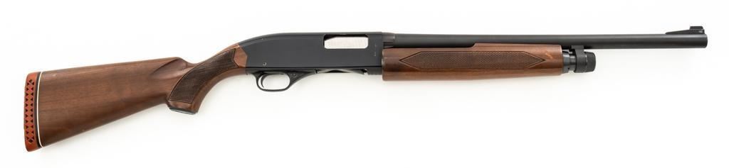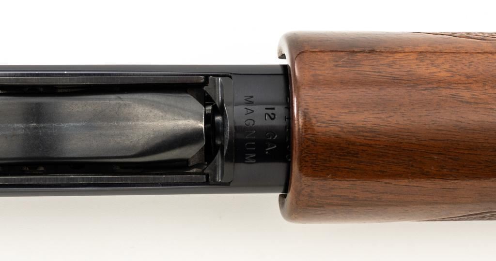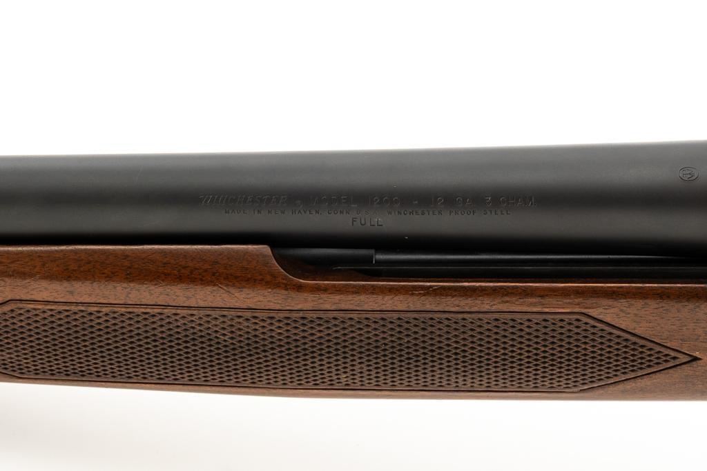 Winchester Model 1200 Slide Action Riot Shotgun, #L711198, 12 ga., 18'' barrel with 3'' chamber and Full choke, matte blue finish, checkered walnut forend and pistol grip stock ending with a ventilated rubber recoil pad, providing a 14'' LOP. Trijicon Tritium ramped blade front sight is dim. Bolt is factory jeweled.Metal rates very good overall and retains approx. 97%-98% factory matte blue finish, with small marks and scattered light scuffs. Stock is in very good condition, with a few deeper scrapes on the right side of the forend; buttstock shows scuffs and scrapes along the top of the comb. Action is crisp and functions smoothly. Bore is mirror bright. Est.: $250-$400. (Modern/PPT)