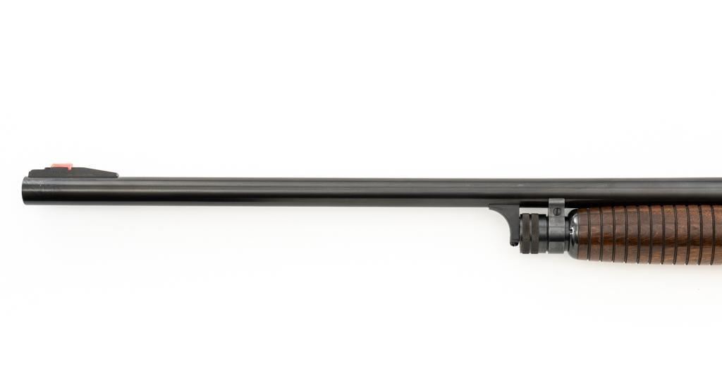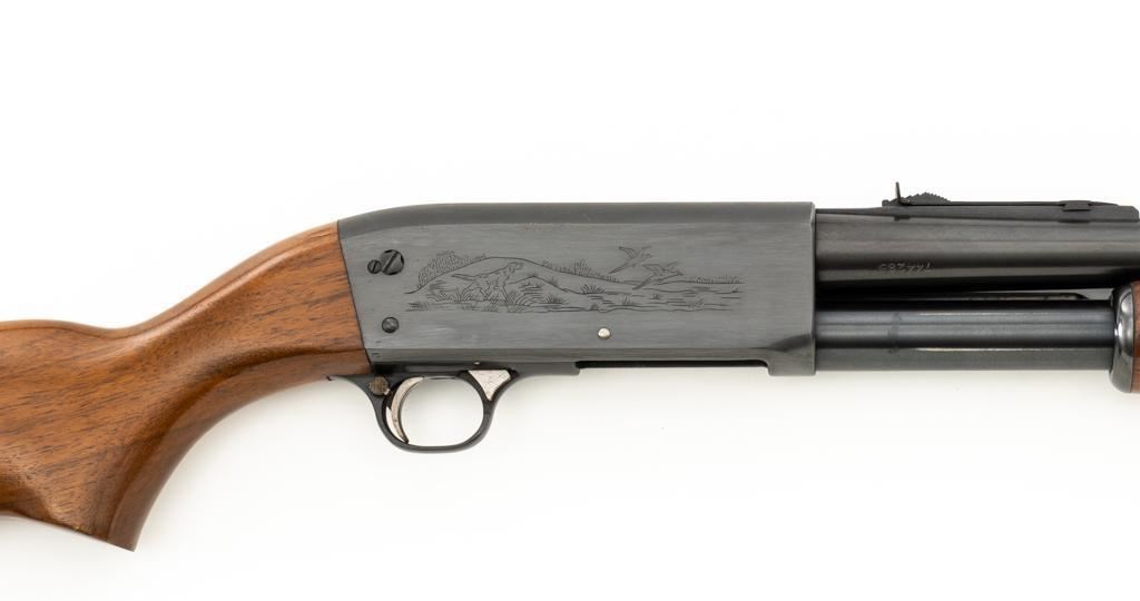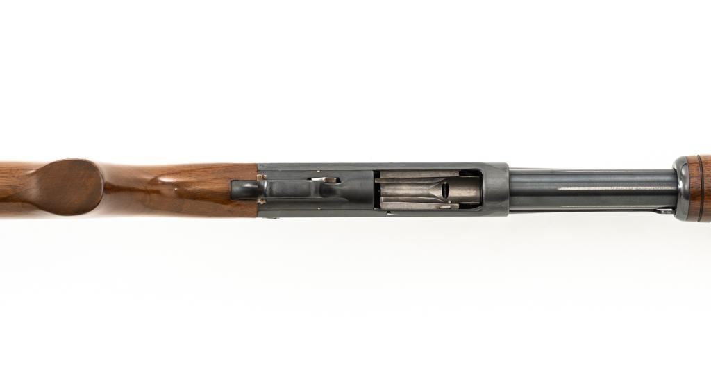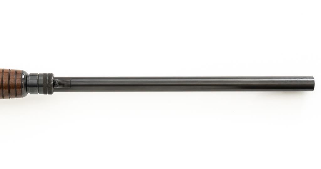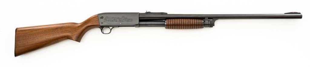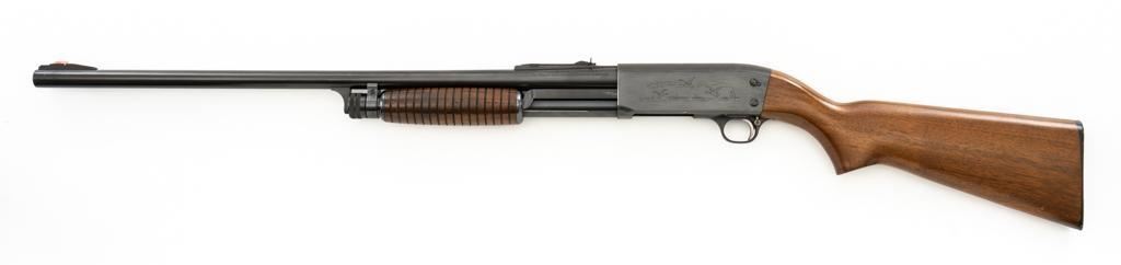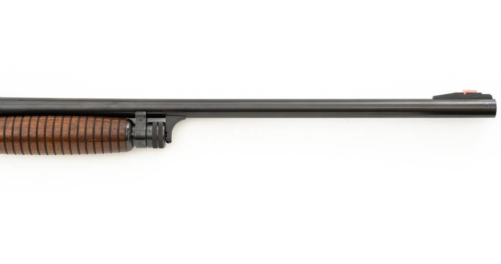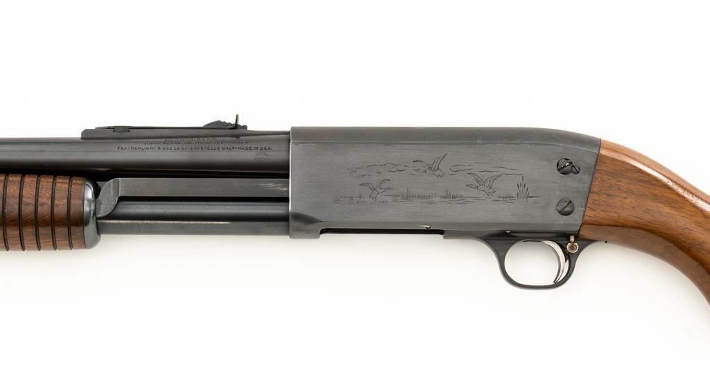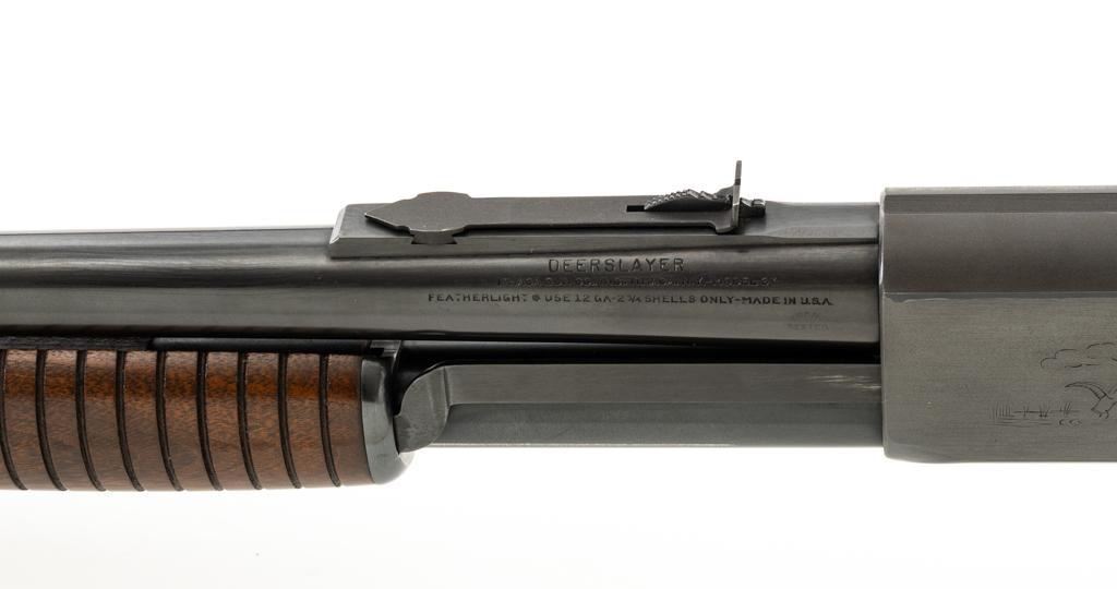 Ithaca Model 37 Slide Action Shotgun, #744285, 12 ga., 26'' Featherlight Deerslayer barrel with 2-3/4'' chamber, choked Mod. Receiver with standard light roll engraving and blued finish. Smooth pistol grip walnut stock, 16-groove forend, with Ithaca grooved hard plastic buttplate; LOP is 14''. Orange fiber-optic front sight and standard elevator rear sight with ''V''-notched groove. Mfg'd circa 1958. Frame and barrel have matching numbers. Shotgun is in excellent overall condition, retaining approx. 96%-98% factory blue, with minor marks from use and handling. Stock and forend have a few minor scuffs, with the most noticeable being on the bottom of the buttstock, mid-way between the pistol grip and buttplate. Action is smooth and has the ability to ''slam fire''. Bore is bright. Est.: $350-$550. (C&R/PPT)