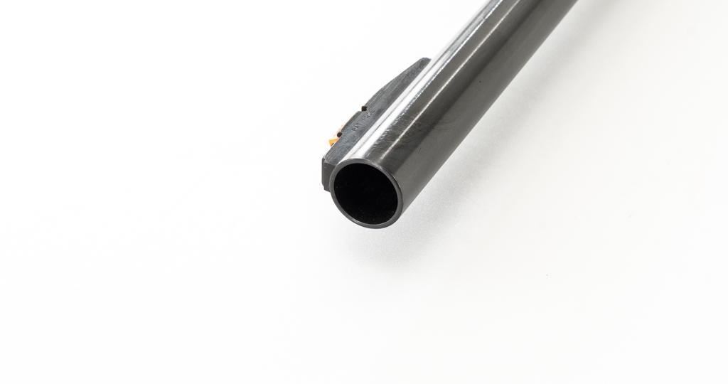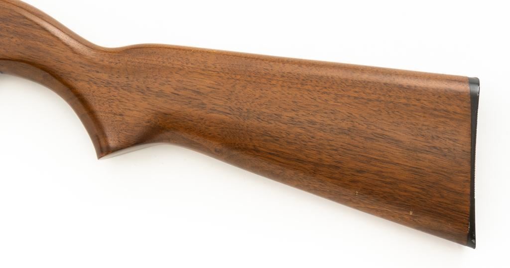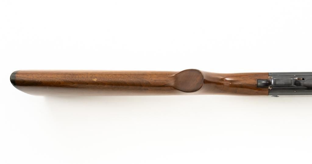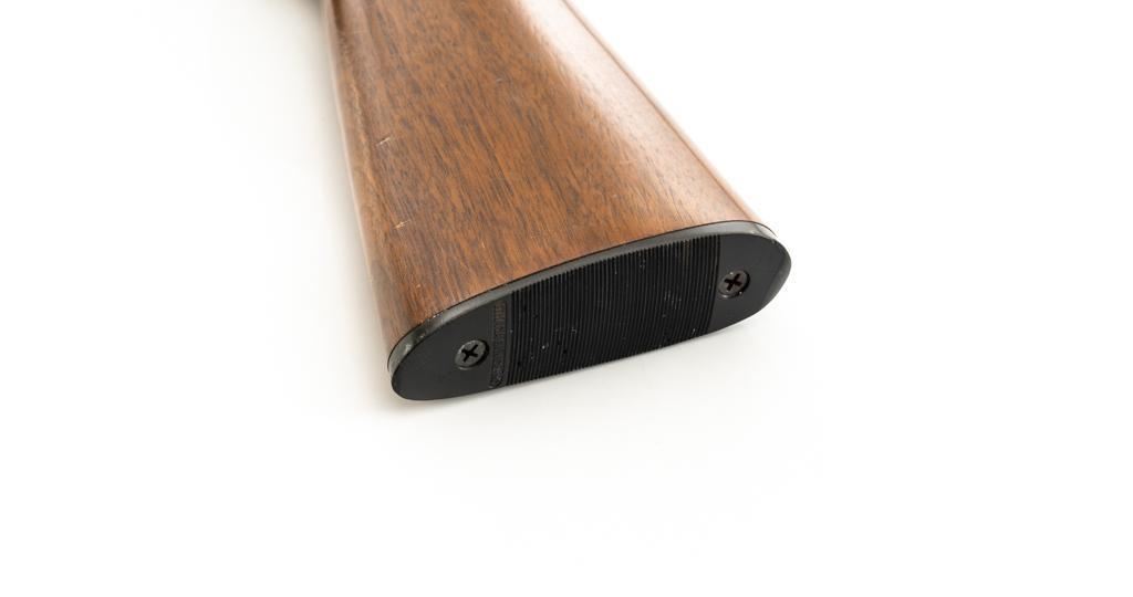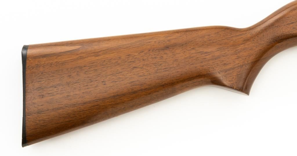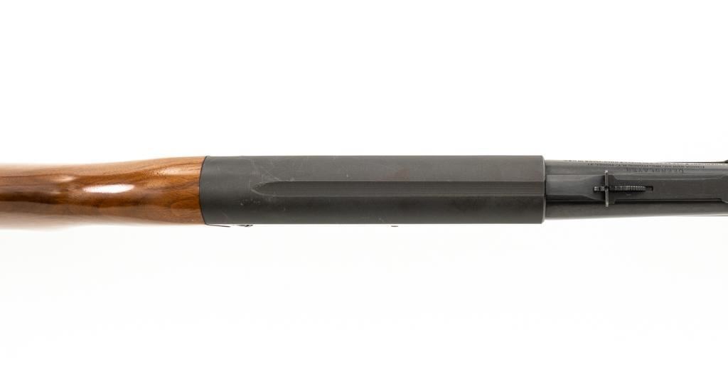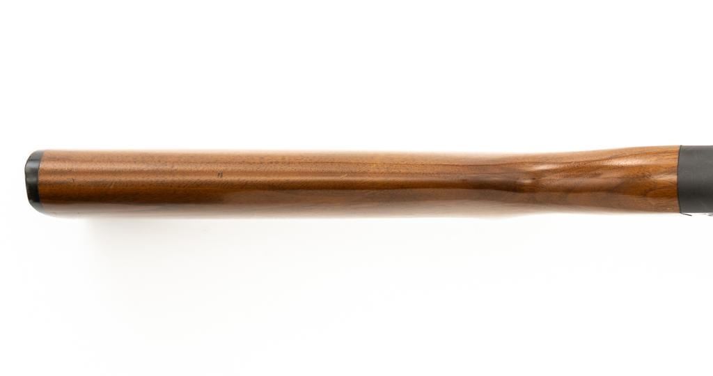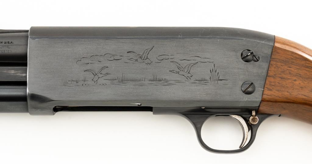 Ithaca Model 37 Slide Action Shotgun, #744285, 12 ga., 26'' Featherlight Deerslayer barrel with 2-3/4'' chamber, choked Mod. Receiver with standard light roll engraving and blued finish. Smooth pistol grip walnut stock, 16-groove forend, with Ithaca grooved hard plastic buttplate; LOP is 14''. Orange fiber-optic front sight and standard elevator rear sight with ''V''-notched groove. Mfg'd circa 1958. Frame and barrel have matching numbers. Shotgun is in excellent overall condition, retaining approx. 96%-98% factory blue, with minor marks from use and handling. Stock and forend have a few minor scuffs, with the most noticeable being on the bottom of the buttstock, mid-way between the pistol grip and buttplate. Action is smooth and has the ability to ''slam fire''. Bore is bright. Est.: $350-$550. (C&R/PPT)