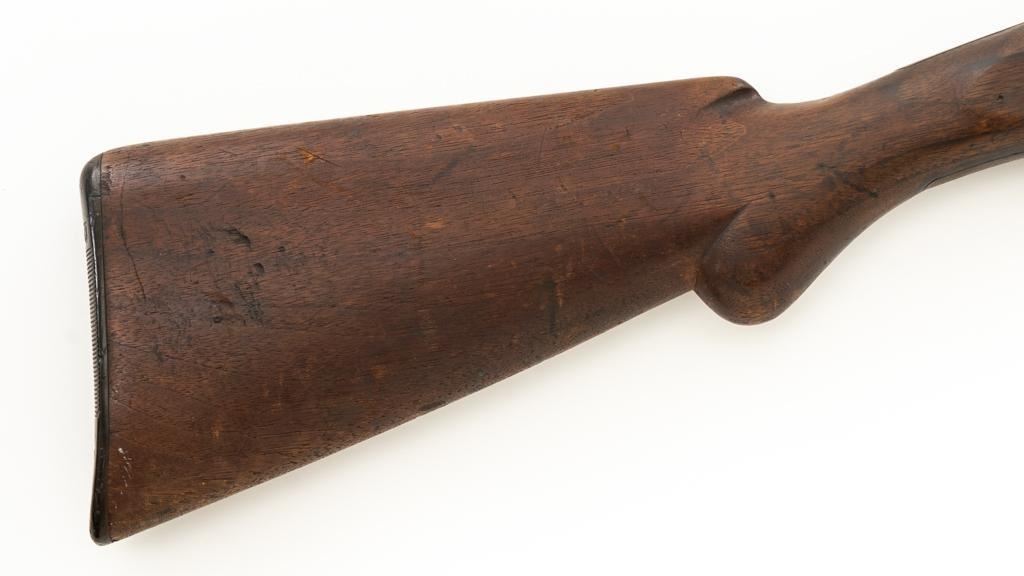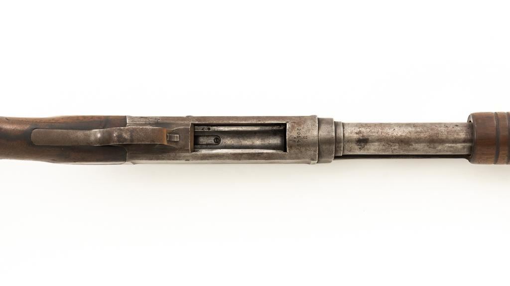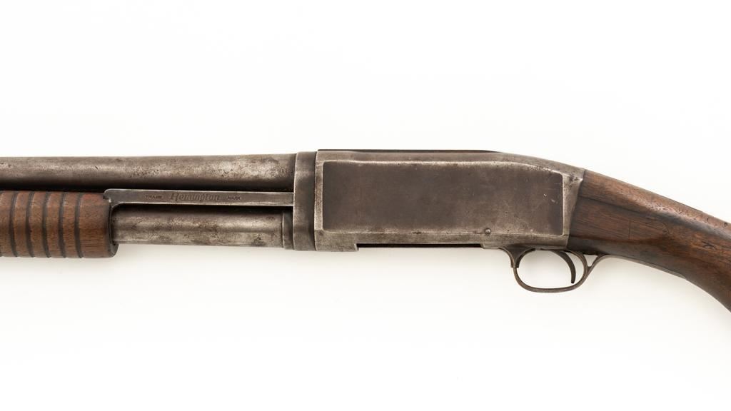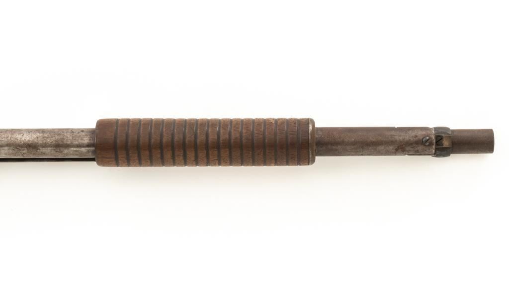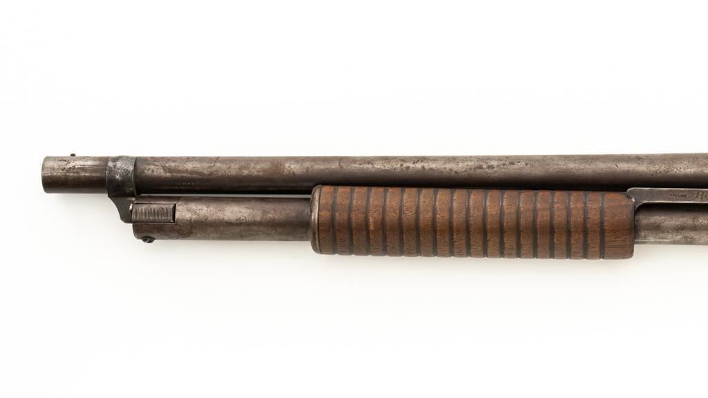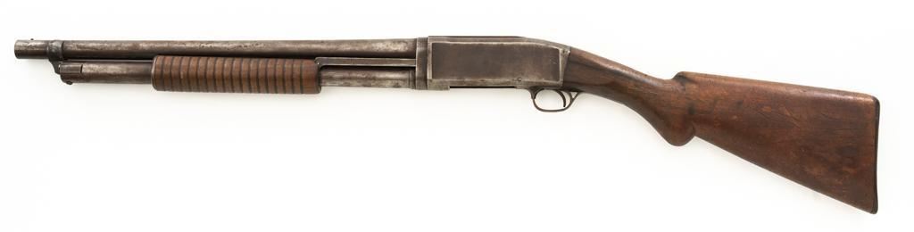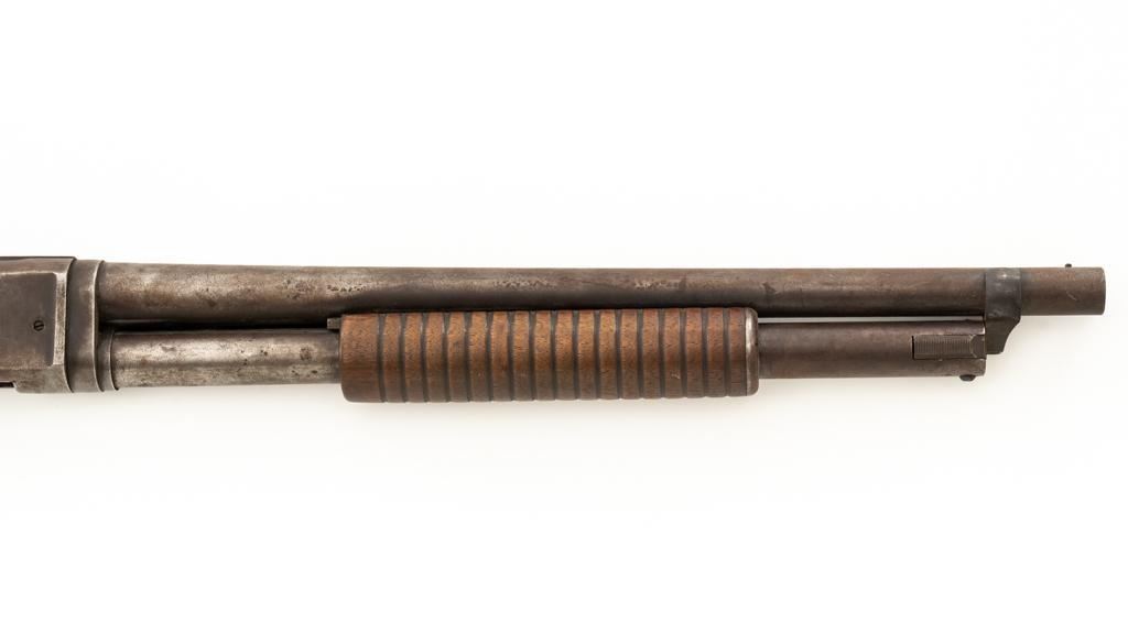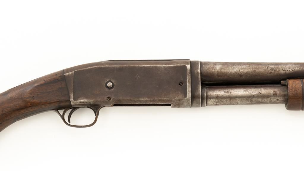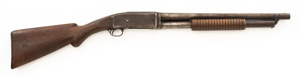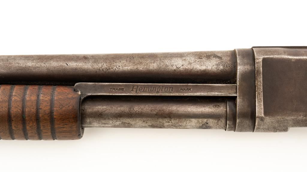 Remington Model 10 Slide Action Shotgun, #U20549, 12 ga., 18.5'' barrel with a 2-3/4'' chamber, Full choke, and brass bead front sight; blue finish. Smooth walnut forend and round knob pistol grip stock, ending with a ribbed hard rubber Remington buttplate, providing a 13.75'' LOP. Shotgun is in good overall condition, retaining traces of original finish in the protected areas, with the remainder gone to a mottled brown/gray patina, with light surface rust and erosion. Receiver shows considerable original finish drifting to plum patina with edge wear and erosion. Barrel has been shortened to ''Cowboy'' length. Factory markings are legible. Stock is in good condition, with impressions and a 2.5'' hairline, lateral crack at the left wrist. Action functions well. Bore is good and may clean better. Est.: $200-$400. (C&R/PPT)