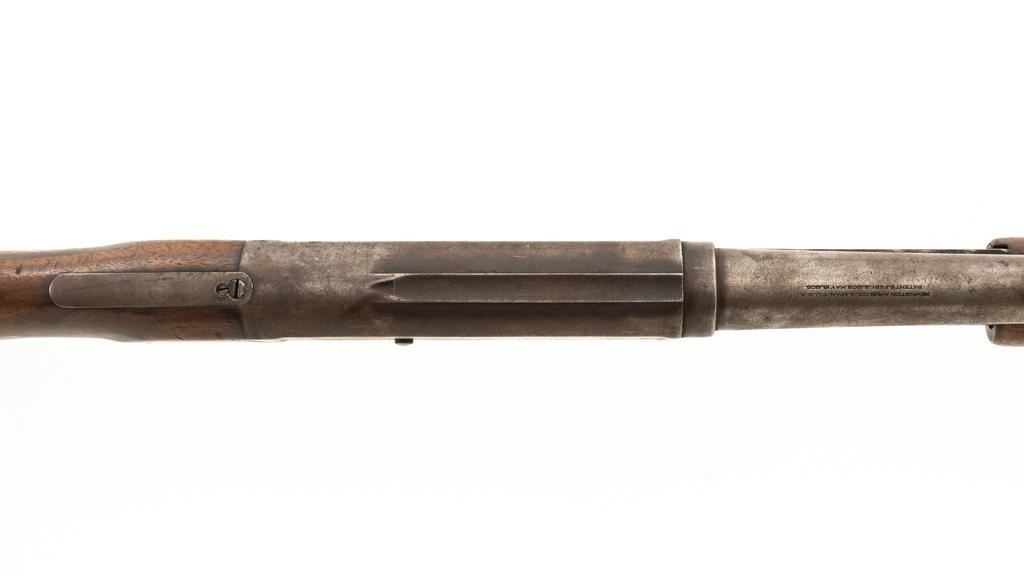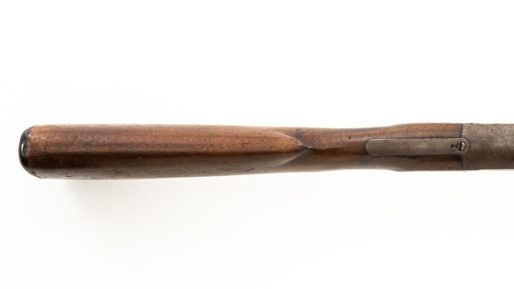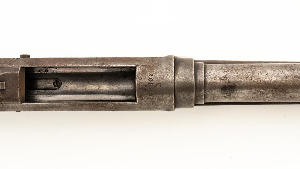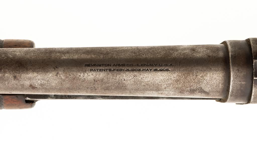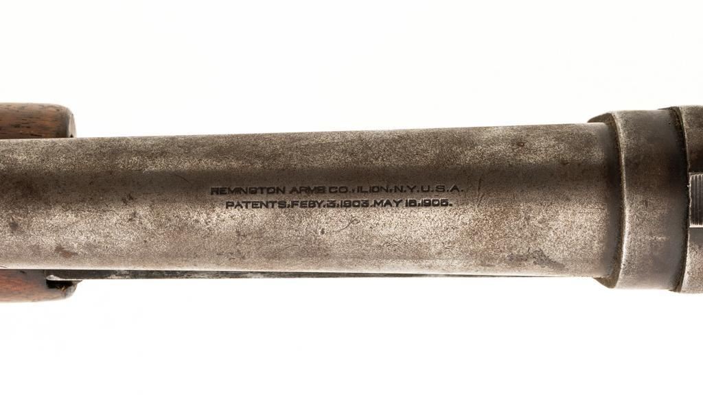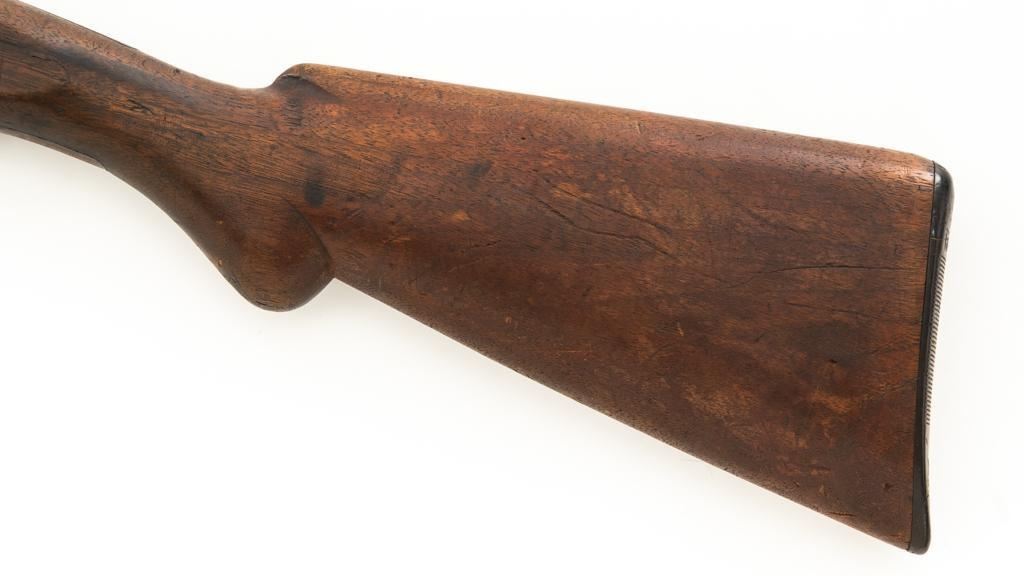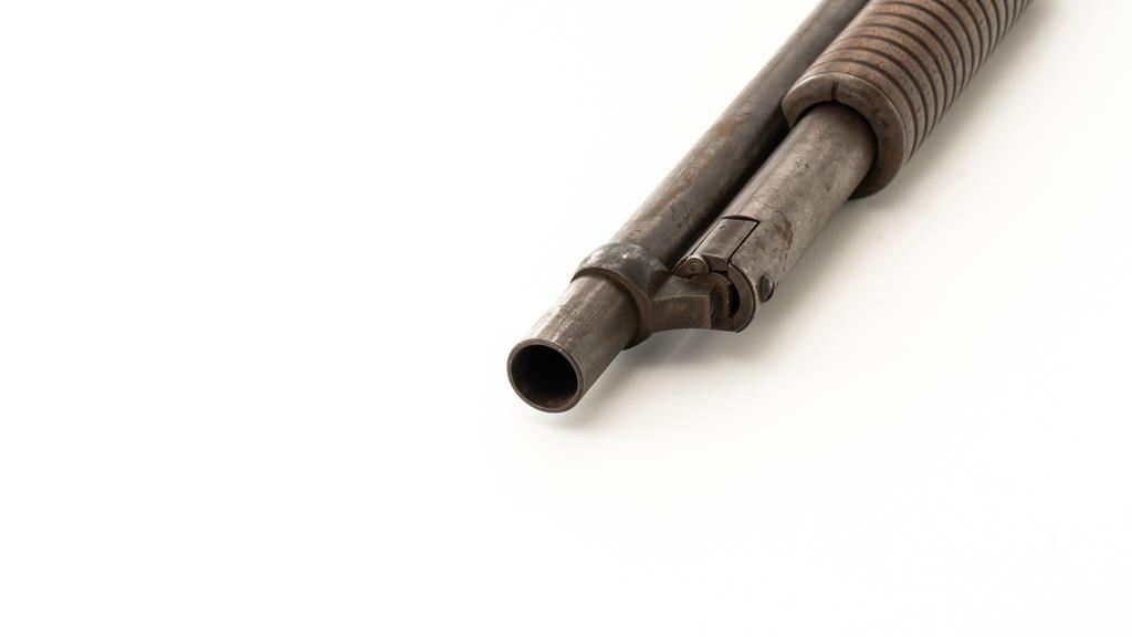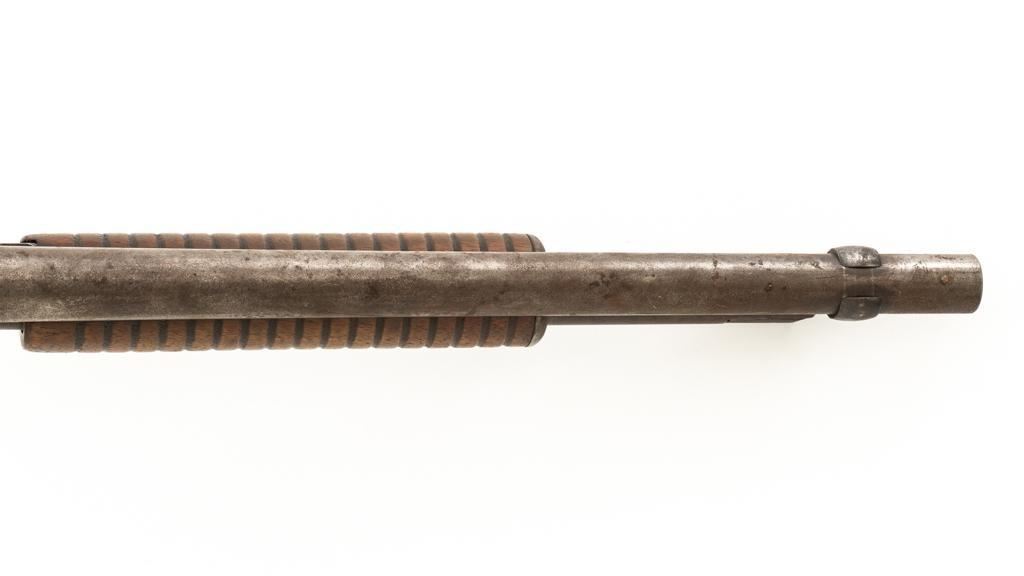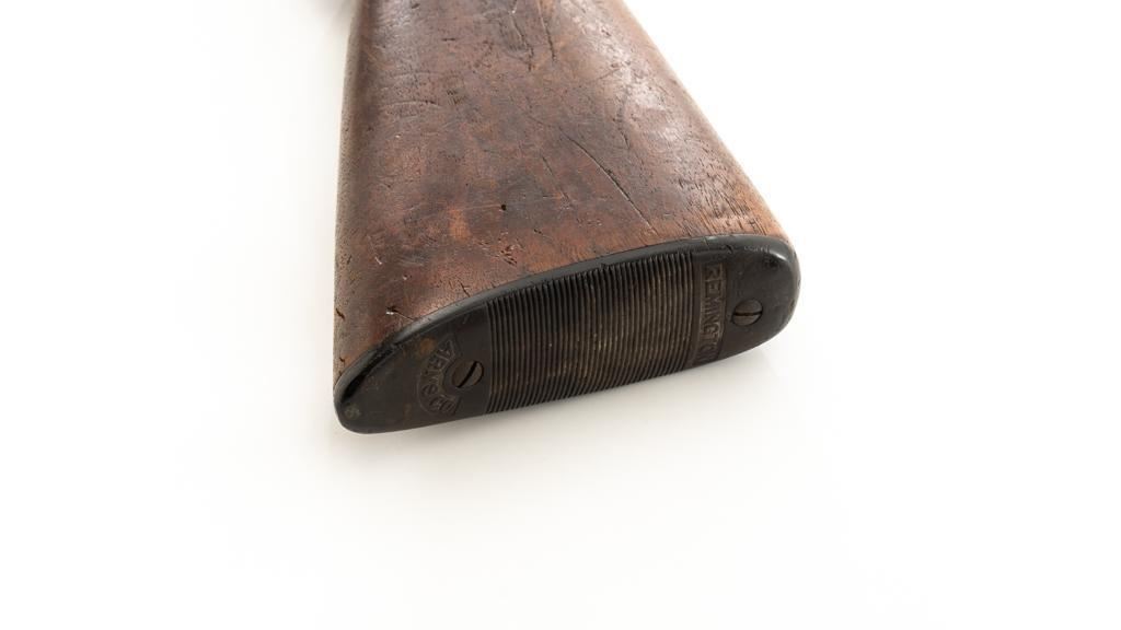 Remington Model 10 Slide Action Shotgun, #U20549, 12 ga., 18.5'' barrel with a 2-3/4'' chamber, Full choke, and brass bead front sight; blue finish. Smooth walnut forend and round knob pistol grip stock, ending with a ribbed hard rubber Remington buttplate, providing a 13.75'' LOP. Shotgun is in good overall condition, retaining traces of original finish in the protected areas, with the remainder gone to a mottled brown/gray patina, with light surface rust and erosion. Receiver shows considerable original finish drifting to plum patina with edge wear and erosion. Barrel has been shortened to ''Cowboy'' length. Factory markings are legible. Stock is in good condition, with impressions and a 2.5'' hairline, lateral crack at the left wrist. Action functions well. Bore is good and may clean better. Est.: $200-$400. (C&R/PPT)