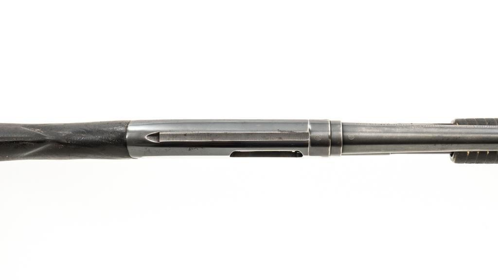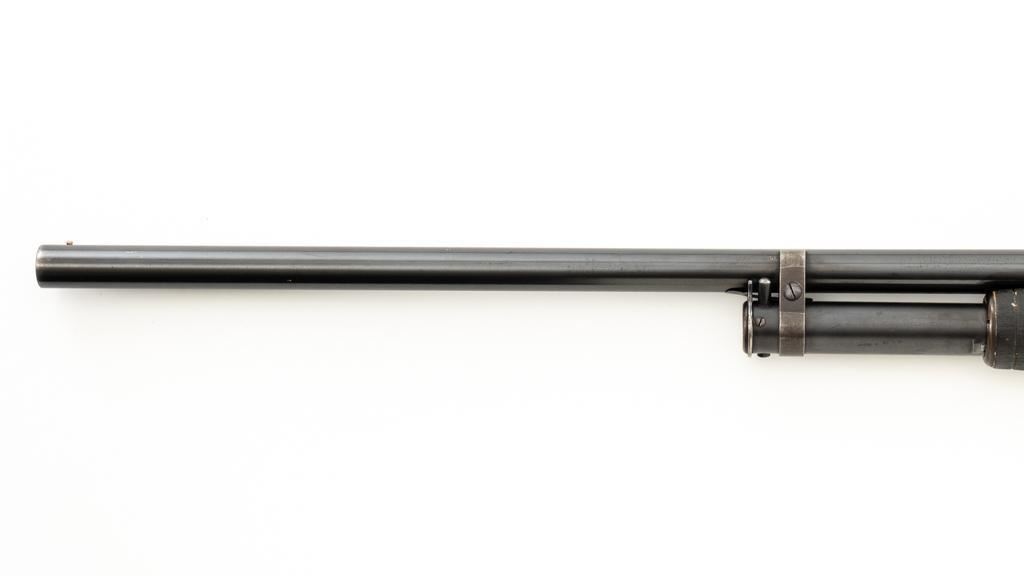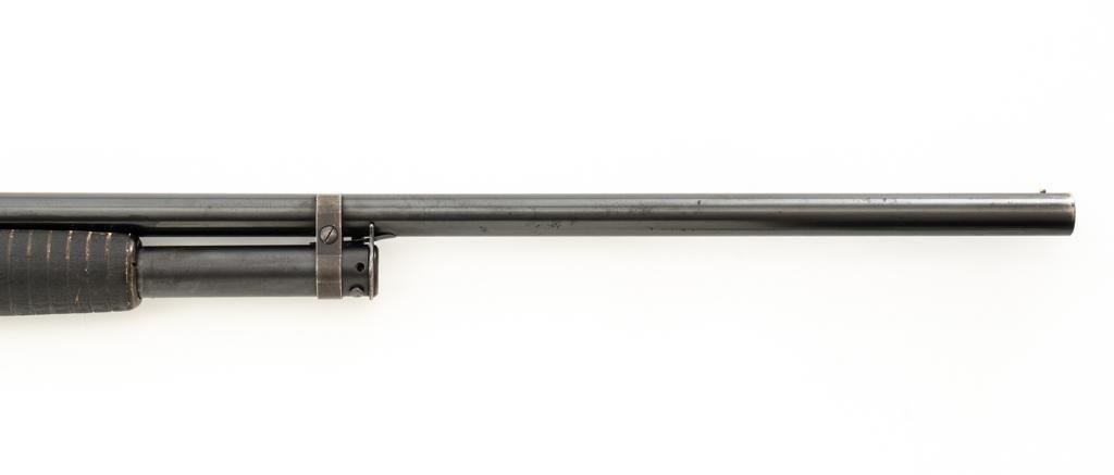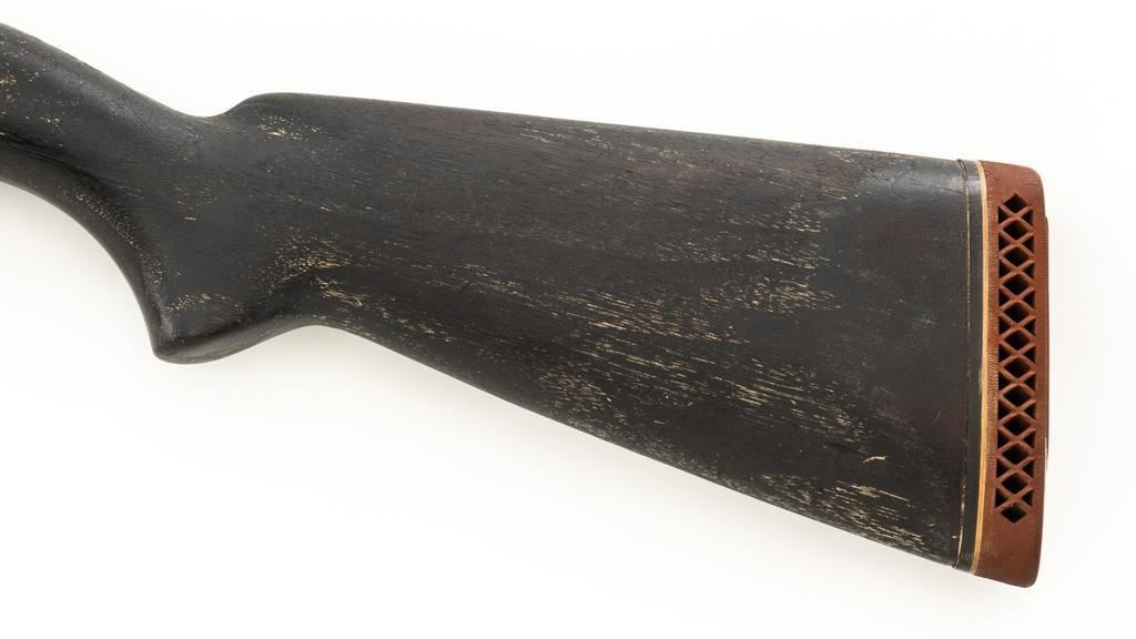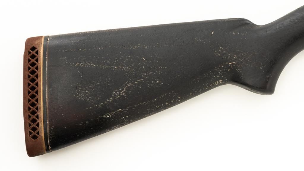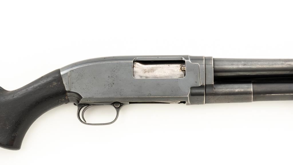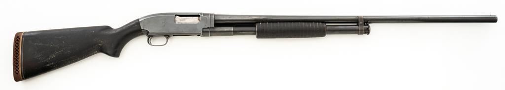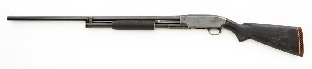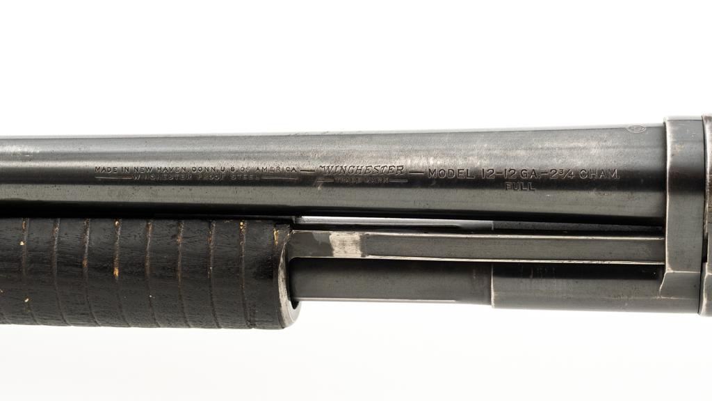 Winchester Model 12 Slide Action Shotgun, #1022277, 12 ga., 30'' plain barrel with 2-3/4'' chamber, Full choke and bead front sight; blue finish. Walnut smooth pistol grip stock with added 1'' vented recoil pad, forend with 18-groove; LOP 13.75'' Top of barrel and receiver are both Winchester proofed. Mfg'd 1943. Condition is very good. Approx. 90% factory blued finish remains, with areas of thinning, few small handling marks and light scratches. Left side of receiver has an approx. 2.25'' x .75'' area where cold blue or other type of finish has been applied. Both stock and forend have been painted black and show wear and smoothing from use. Action functions smoothly and locks up tight. Bore is bright. Est.: $200-$400. (C&R/PPT)