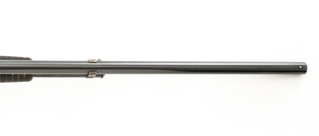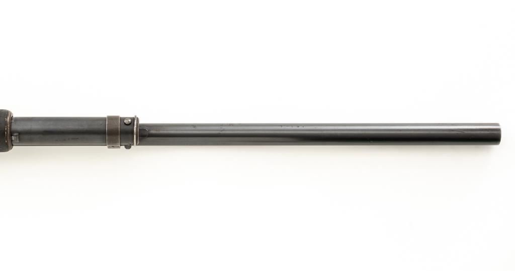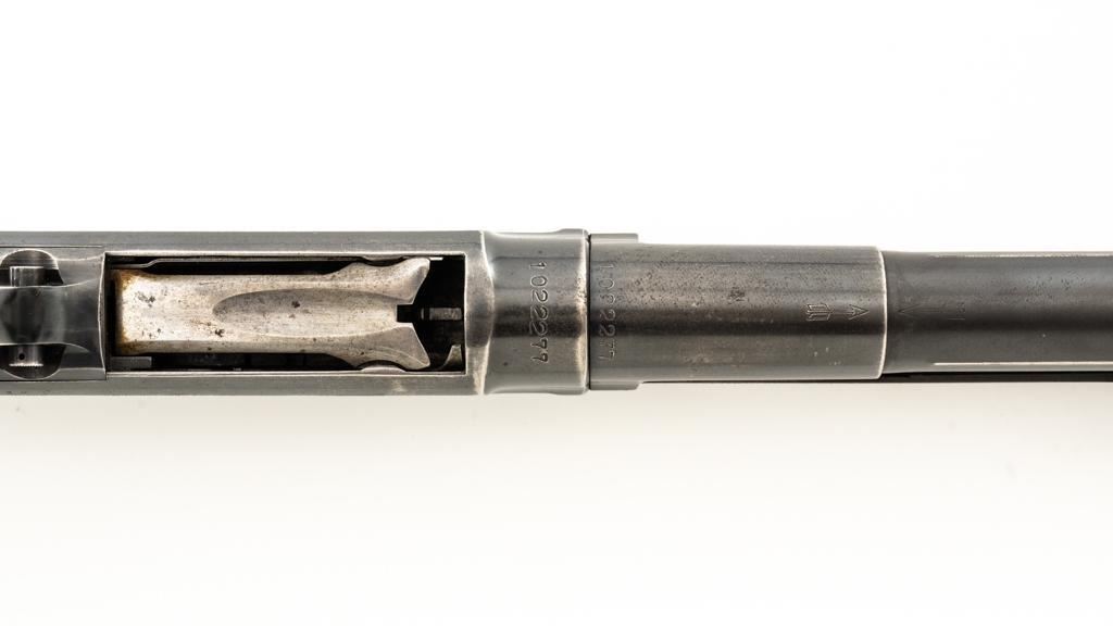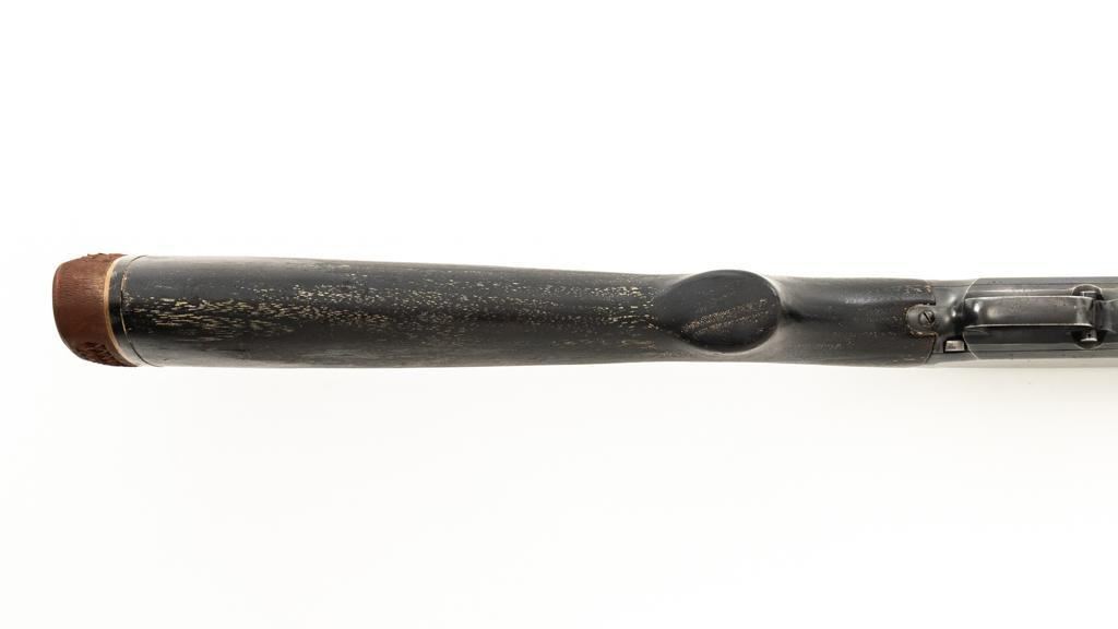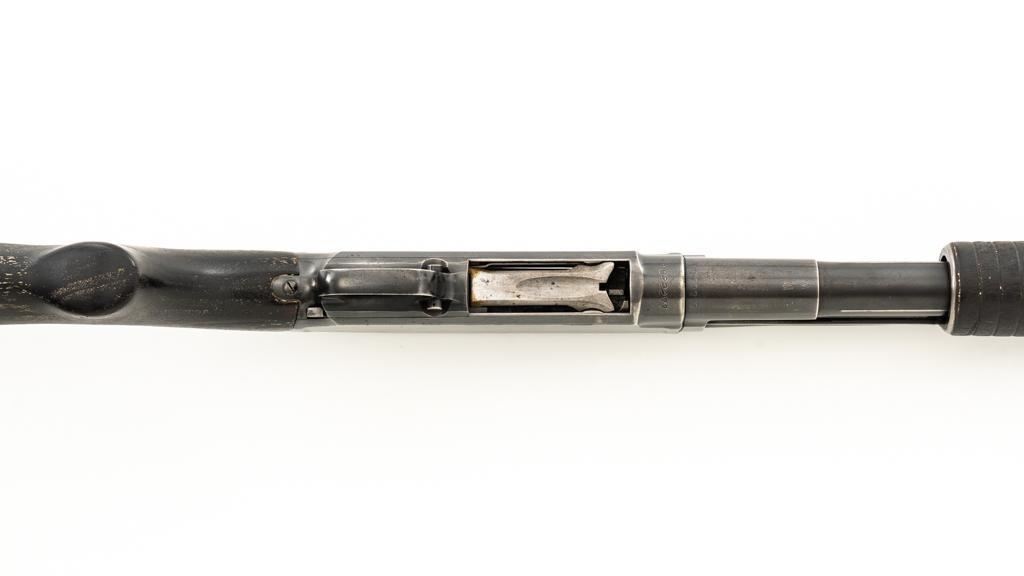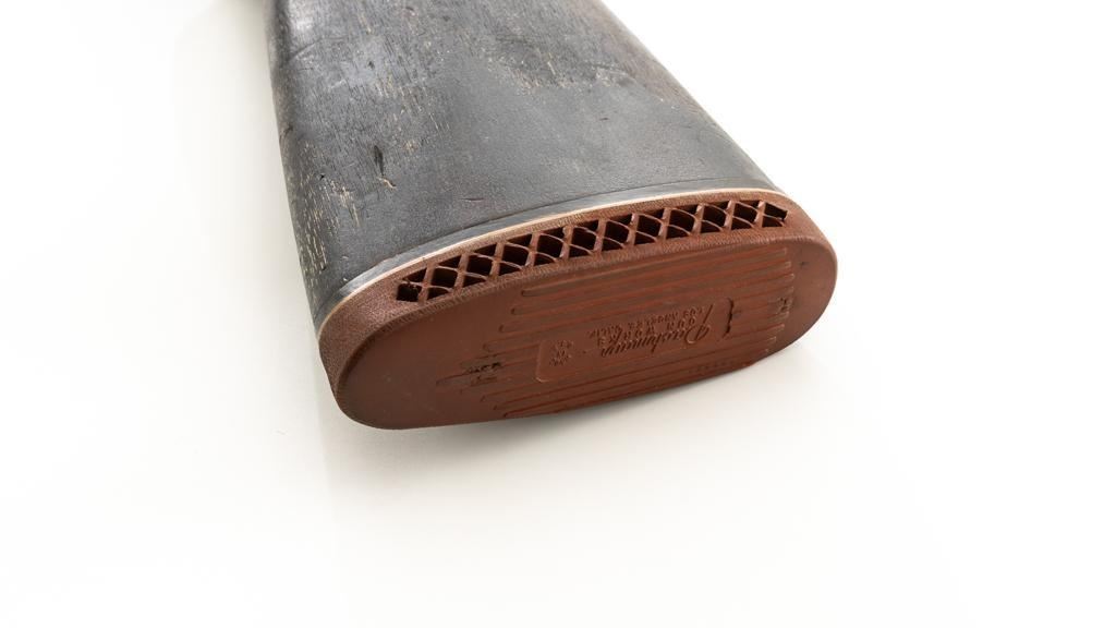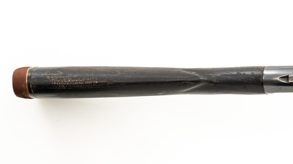 Winchester Model 12 Slide Action Shotgun, #1022277, 12 ga., 30'' plain barrel with 2-3/4'' chamber, Full choke and bead front sight; blue finish. Walnut smooth pistol grip stock with added 1'' vented recoil pad, forend with 18-groove; LOP 13.75'' Top of barrel and receiver are both Winchester proofed. Mfg'd 1943. Condition is very good. Approx. 90% factory blued finish remains, with areas of thinning, few small handling marks and light scratches. Left side of receiver has an approx. 2.25'' x .75'' area where cold blue or other type of finish has been applied. Both stock and forend have been painted black and show wear and smoothing from use. Action functions smoothly and locks up tight. Bore is bright. Est.: $200-$400. (C&R/PPT)