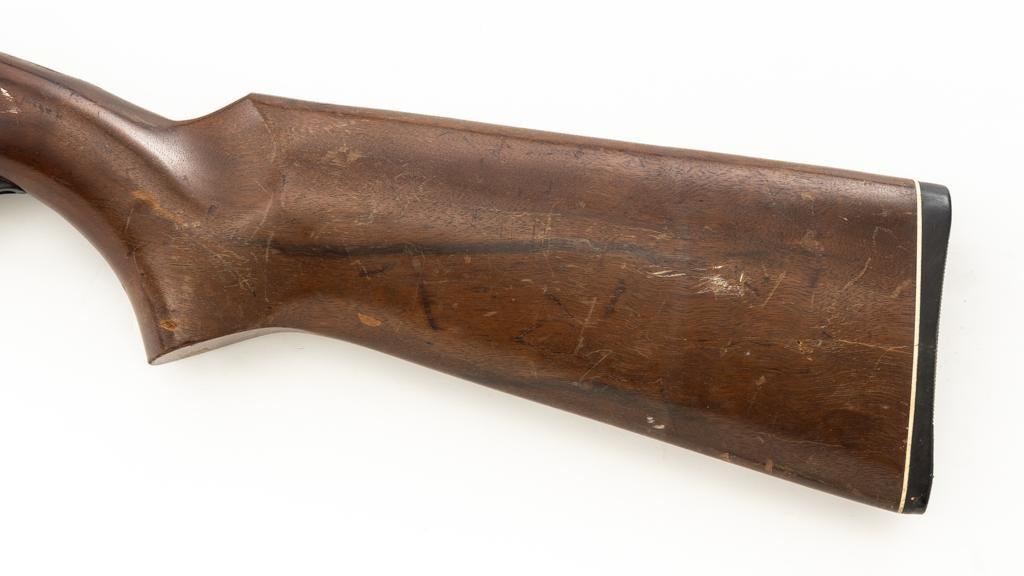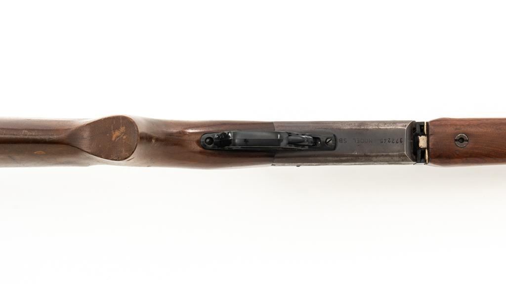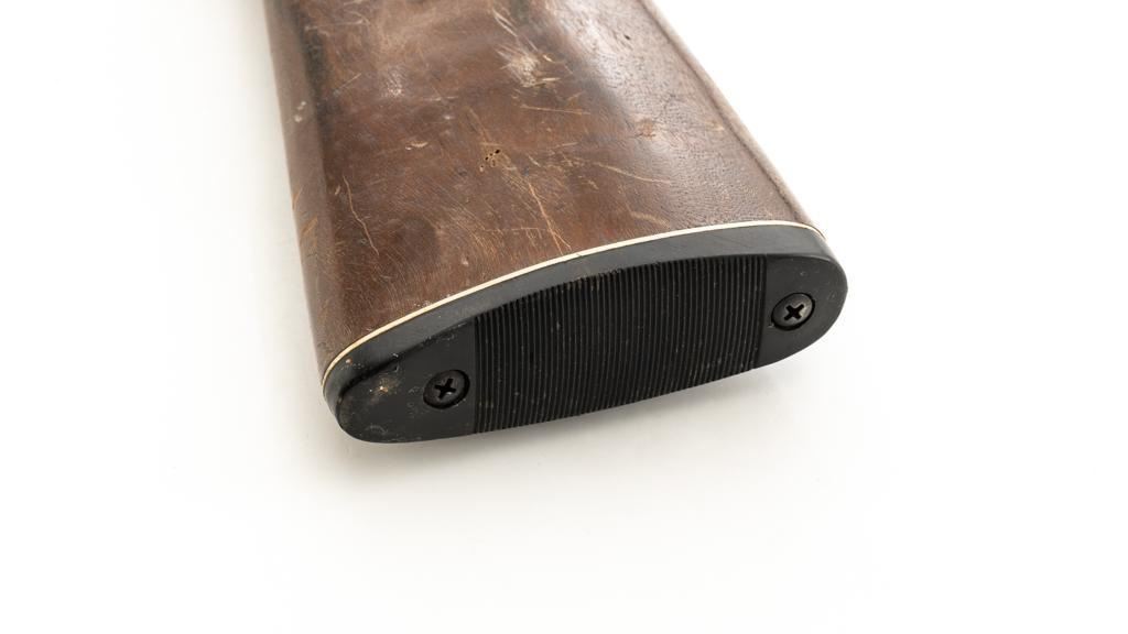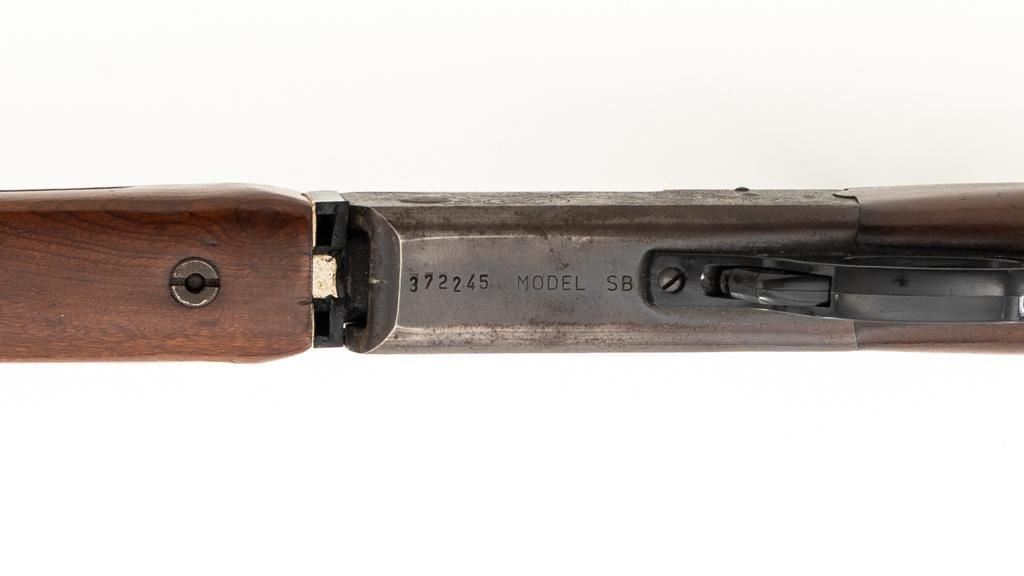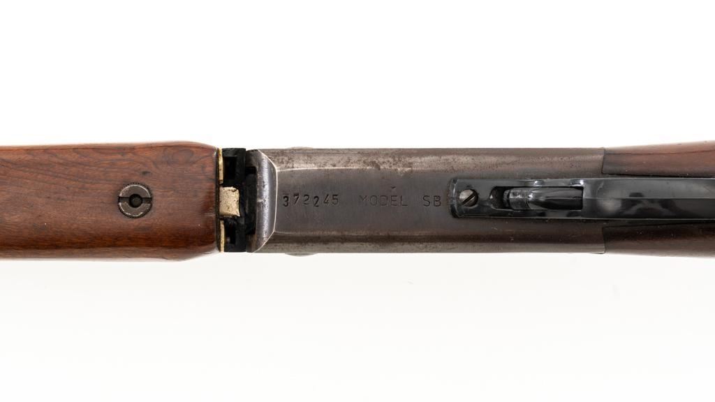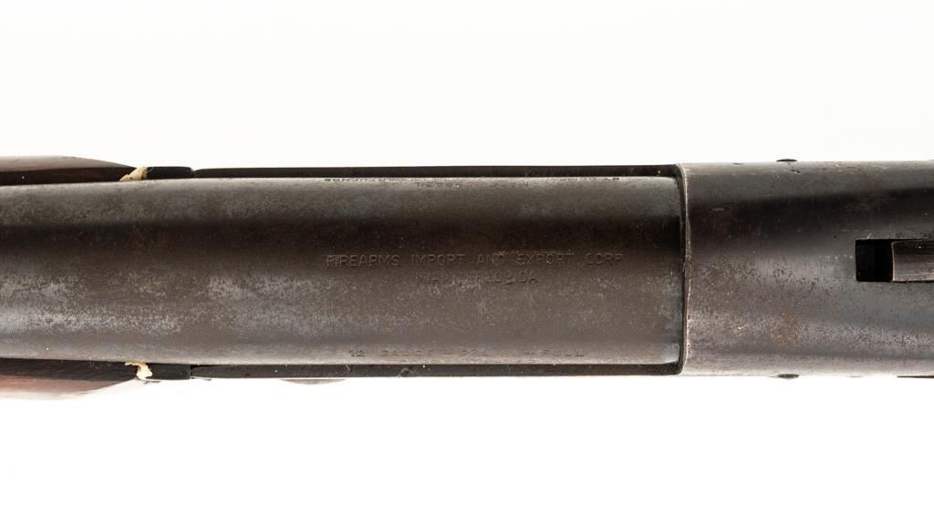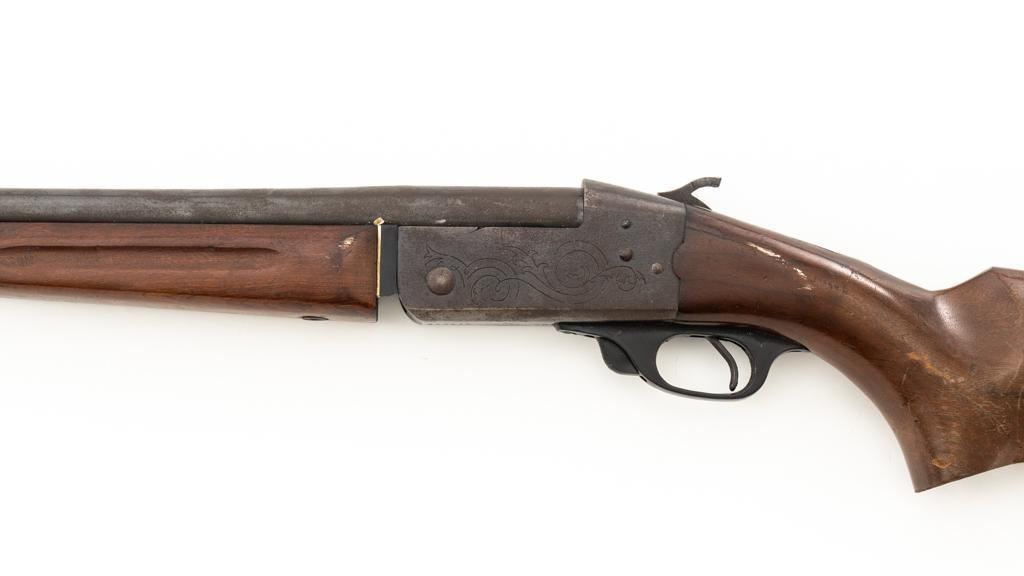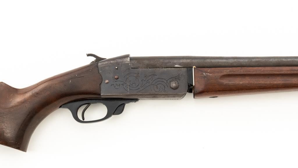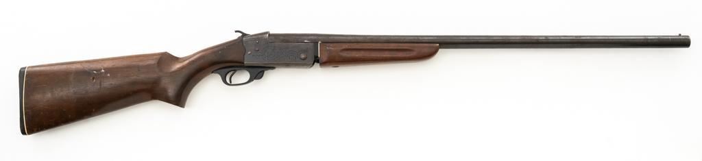 Brazilian FIE Model SB Single Shot Shotgun, #372245, 12 ga., 28'' barrel with a 2 3/4'' chamber, Full choke, and brass bead front sight; blue finish. Smooth hardwood pistol grip stock with finger groove forend, ending with a ribbed plastic buttplate, providing a 14'' LOP. Import marked on top of the barrel at the breech. Shotgun is in good overall condition, retaining approx. 65%-75% thinning blue finish, with wear at the muzzle and light surface rust and erosion along the barrel due to poor storage. Receiver is lightly machine engraved, displaying considerable thinning finish with edge wear and some areas of light surface. Stock with scattered dents, scratches, and white paint transfer in areas. Plastic buffer between the forend and receiver is broken, missing a large piece at the bottom. Action functions well and locks up securely. Bore is good and may clean to very good. Est.: $100-$200. (Modern/PPT)