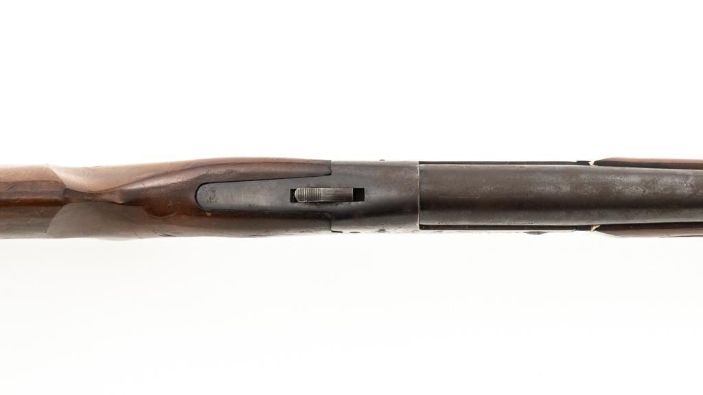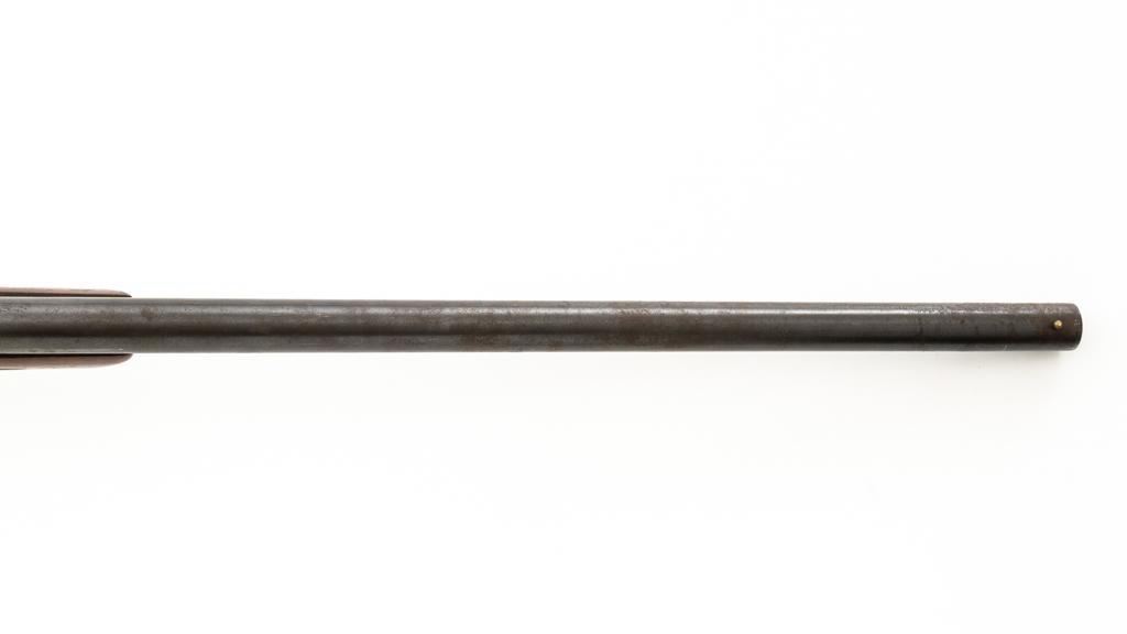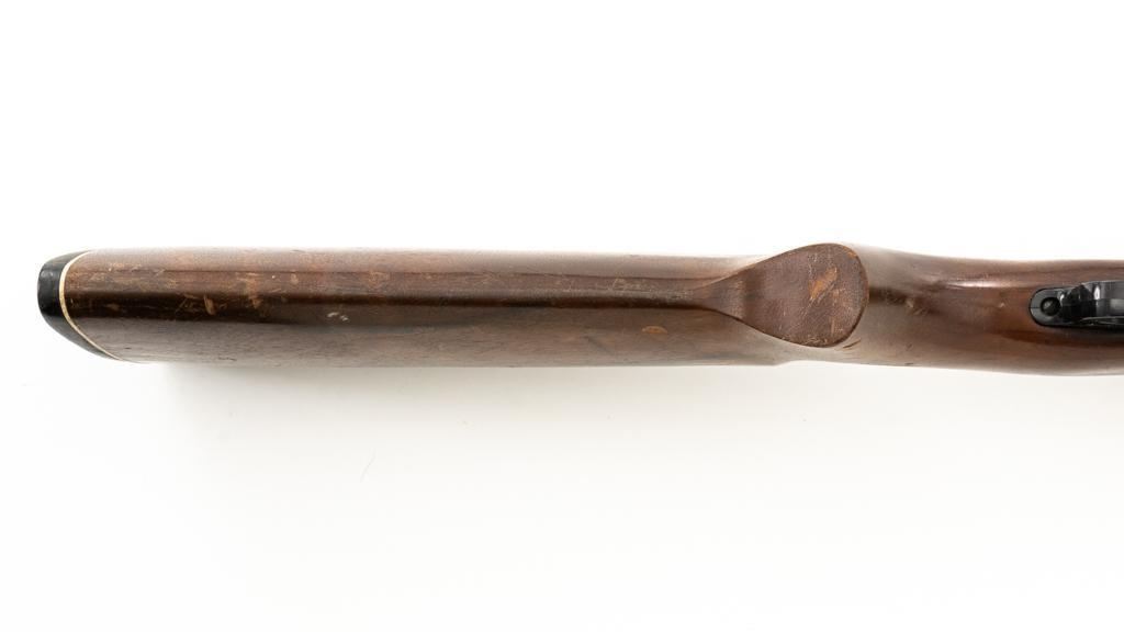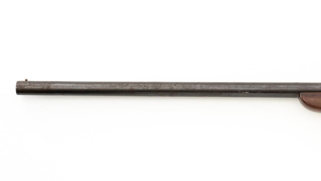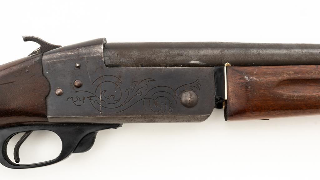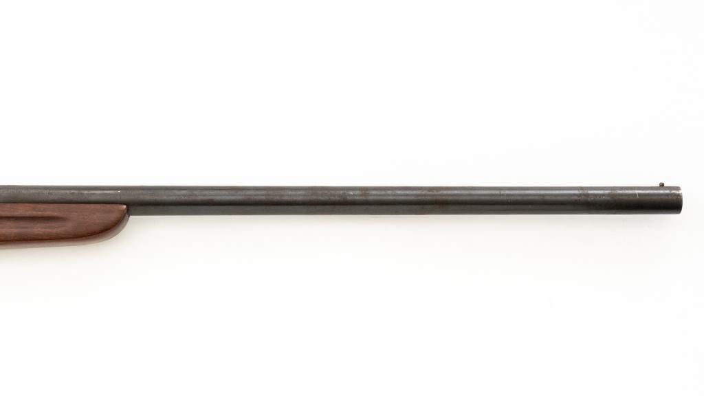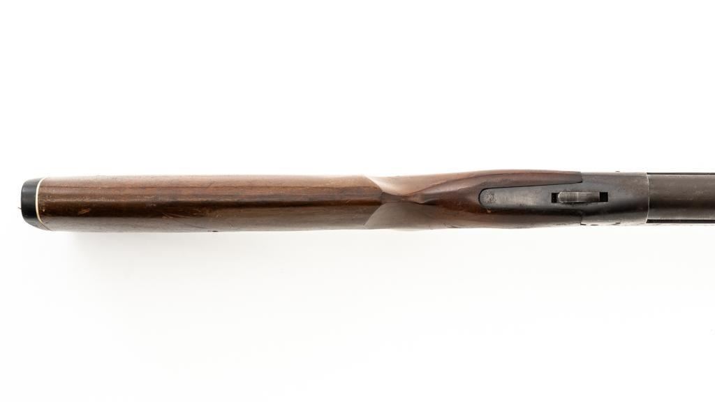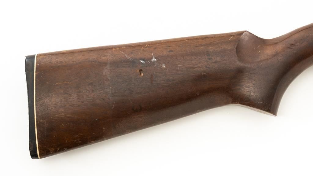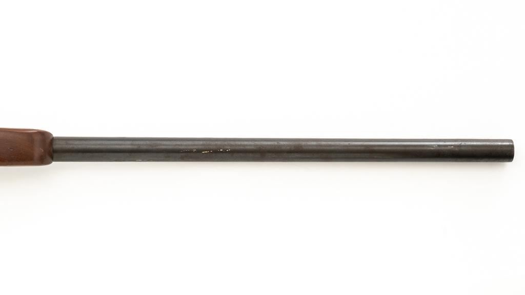 Brazilian FIE Model SB Single Shot Shotgun, #372245, 12 ga., 28'' barrel with a 2 3/4'' chamber, Full choke, and brass bead front sight; blue finish. Smooth hardwood pistol grip stock with finger groove forend, ending with a ribbed plastic buttplate, providing a 14'' LOP. Import marked on top of the barrel at the breech. Shotgun is in good overall condition, retaining approx. 65%-75% thinning blue finish, with wear at the muzzle and light surface rust and erosion along the barrel due to poor storage. Receiver is lightly machine engraved, displaying considerable thinning finish with edge wear and some areas of light surface. Stock with scattered dents, scratches, and white paint transfer in areas. Plastic buffer between the forend and receiver is broken, missing a large piece at the bottom. Action functions well and locks up securely. Bore is good and may clean to very good. Est.: $100-$200. (Modern/PPT)
