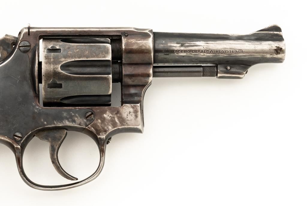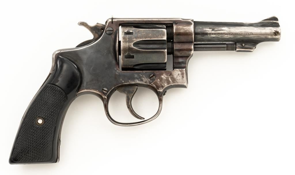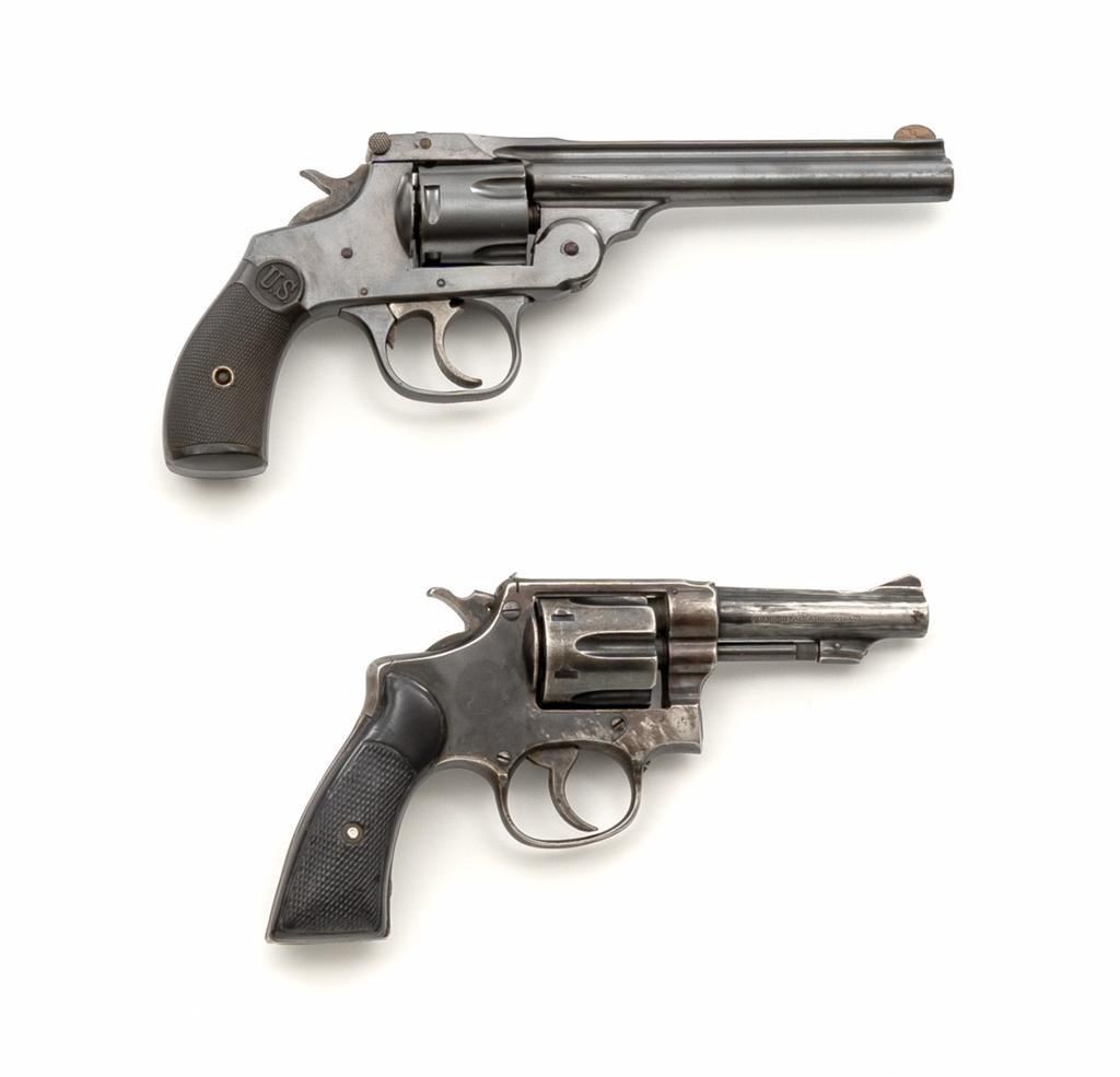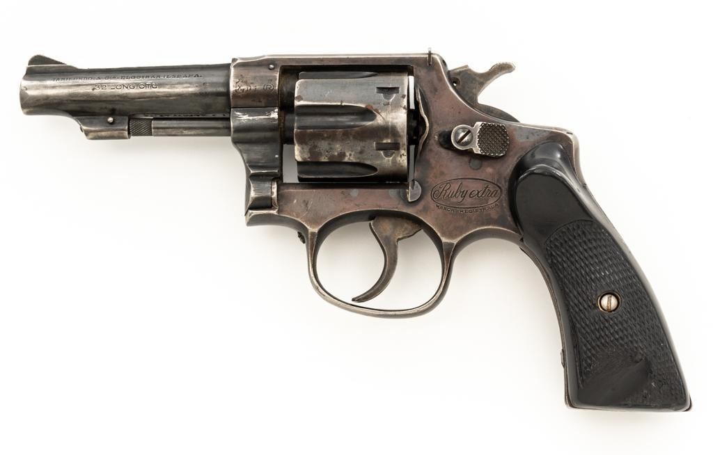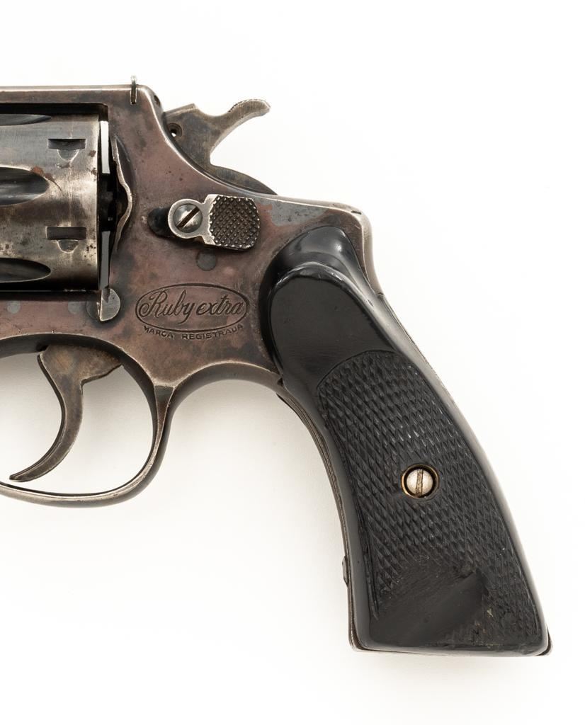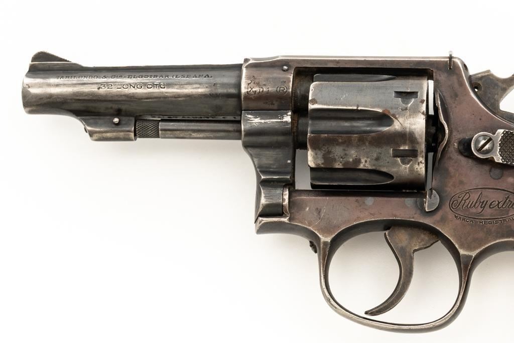 Lot of Two (2) Spanish & American Revolvers: 1.) Spanish Gabilondo & Cia Ruby Extra Double Action Revolver, #556289, .32 Long cal., 3.25'' pinned barrel, blue finish, checkered hard rubber two-piece grips with thumb rest on the left panel, serrated ramped blade front and fixed square-notch rear sight, color case hardened hammer, and trigger. Marked with numerous Spanish proofs, ''MADE IN SPAIN'' on the butt, and ''Ruby Extra'' in script at the left rear of the frame. Revolver is in good condition, retaining approx. 50%-60% thinning finish, with spots of light surface erosion, and evidence of aggressive cleaning at the right front of the frame. Grips rate good. Action functions well. Bore is good with moderate erosion and defined rifling. 2.) U.S. Revolver Co. Double Action 5-Shot Top-Break Revolver, #36772, .38 cal., 5'' ribbed barrel, blue finish, checkered hard rubber two-piece grips with ''U.S.'' monogram, half-round blade front and fixed ''U''-notch rear sight, color case hardened hammer, and trigger. Revolver is very good as refinished, retaining approx. 98% of an old reblued finish, with scratches and pin prick pitting under the new finish. Grips are near excellent. Action functions well. Bore is good with light erosion and some roughness near the muzzle, displaying defined rifling. Est.: $200-$400/lot. (Both/C&R)