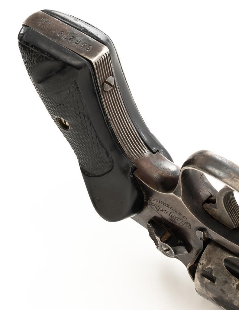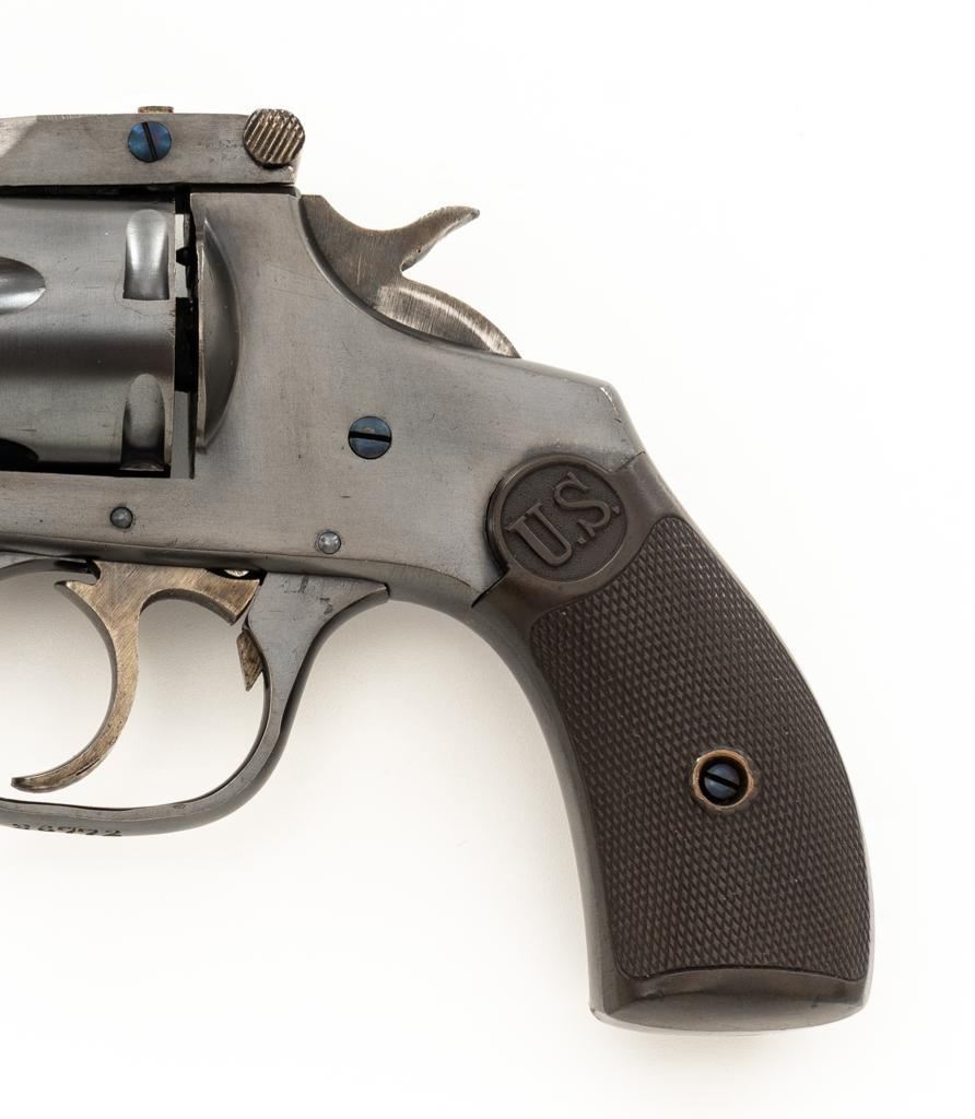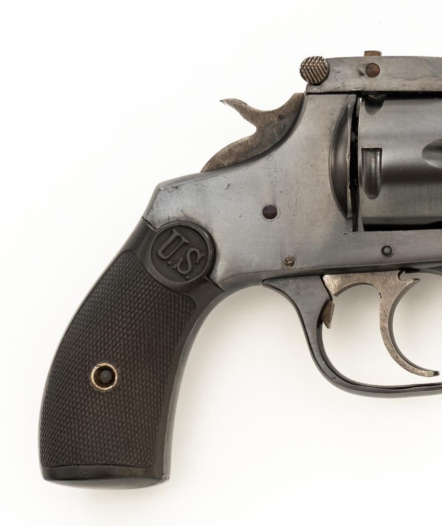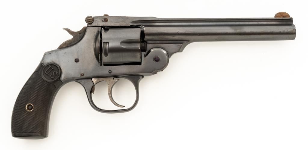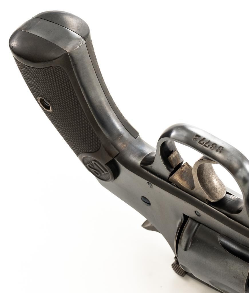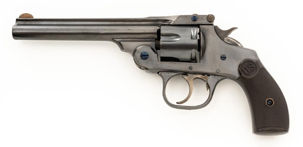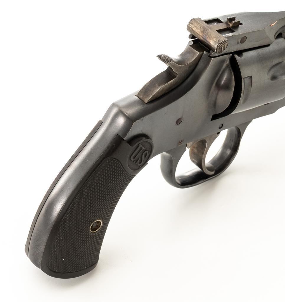 Lot of Two (2) Spanish & American Revolvers: 1.) Spanish Gabilondo & Cia Ruby Extra Double Action Revolver, #556289, .32 Long cal., 3.25'' pinned barrel, blue finish, checkered hard rubber two-piece grips with thumb rest on the left panel, serrated ramped blade front and fixed square-notch rear sight, color case hardened hammer, and trigger. Marked with numerous Spanish proofs, ''MADE IN SPAIN'' on the butt, and ''Ruby Extra'' in script at the left rear of the frame. Revolver is in good condition, retaining approx. 50%-60% thinning finish, with spots of light surface erosion, and evidence of aggressive cleaning at the right front of the frame. Grips rate good. Action functions well. Bore is good with moderate erosion and defined rifling. 2.) U.S. Revolver Co. Double Action 5-Shot Top-Break Revolver, #36772, .38 cal., 5'' ribbed barrel, blue finish, checkered hard rubber two-piece grips with ''U.S.'' monogram, half-round blade front and fixed ''U''-notch rear sight, color case hardened hammer, and trigger. Revolver is very good as refinished, retaining approx. 98% of an old reblued finish, with scratches and pin prick pitting under the new finish. Grips are near excellent. Action functions well. Bore is good with light erosion and some roughness near the muzzle, displaying defined rifling. Est.: $200-$400/lot. (Both/C&R)