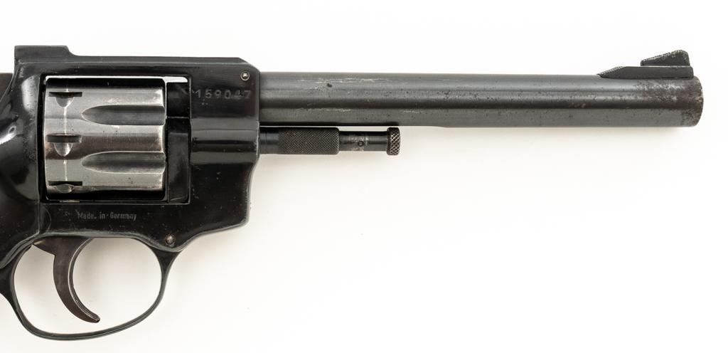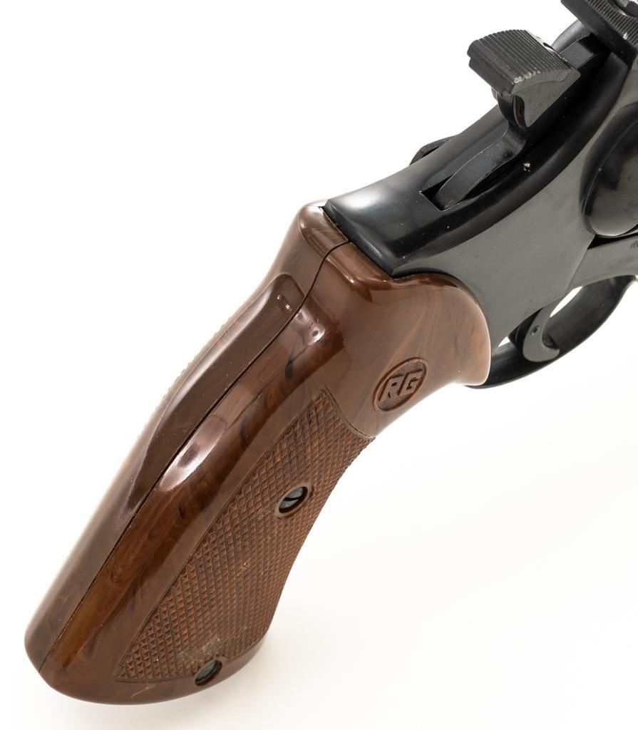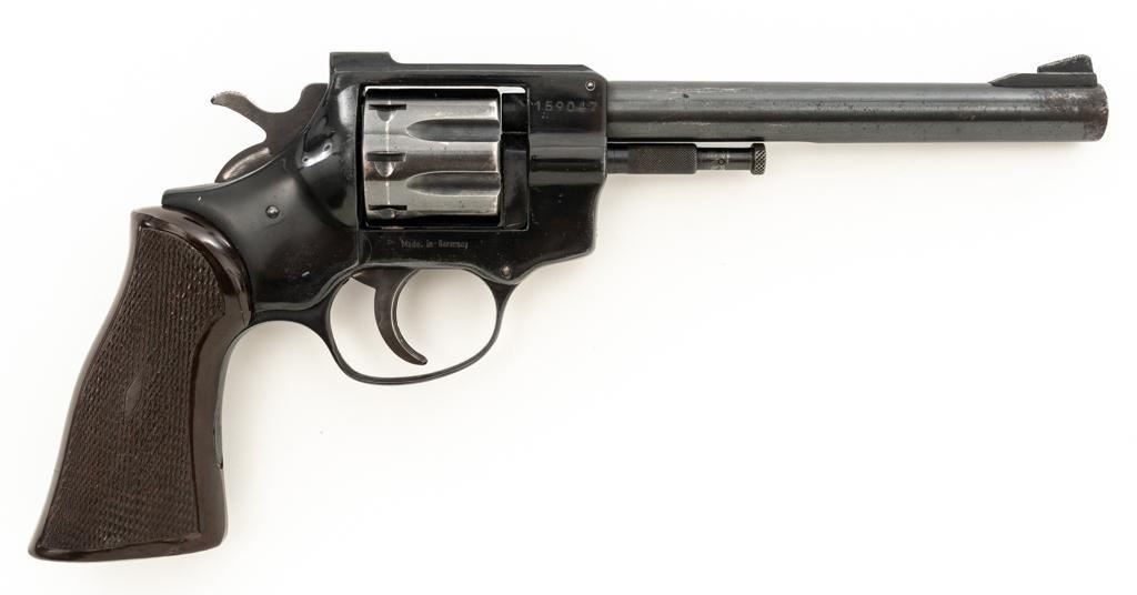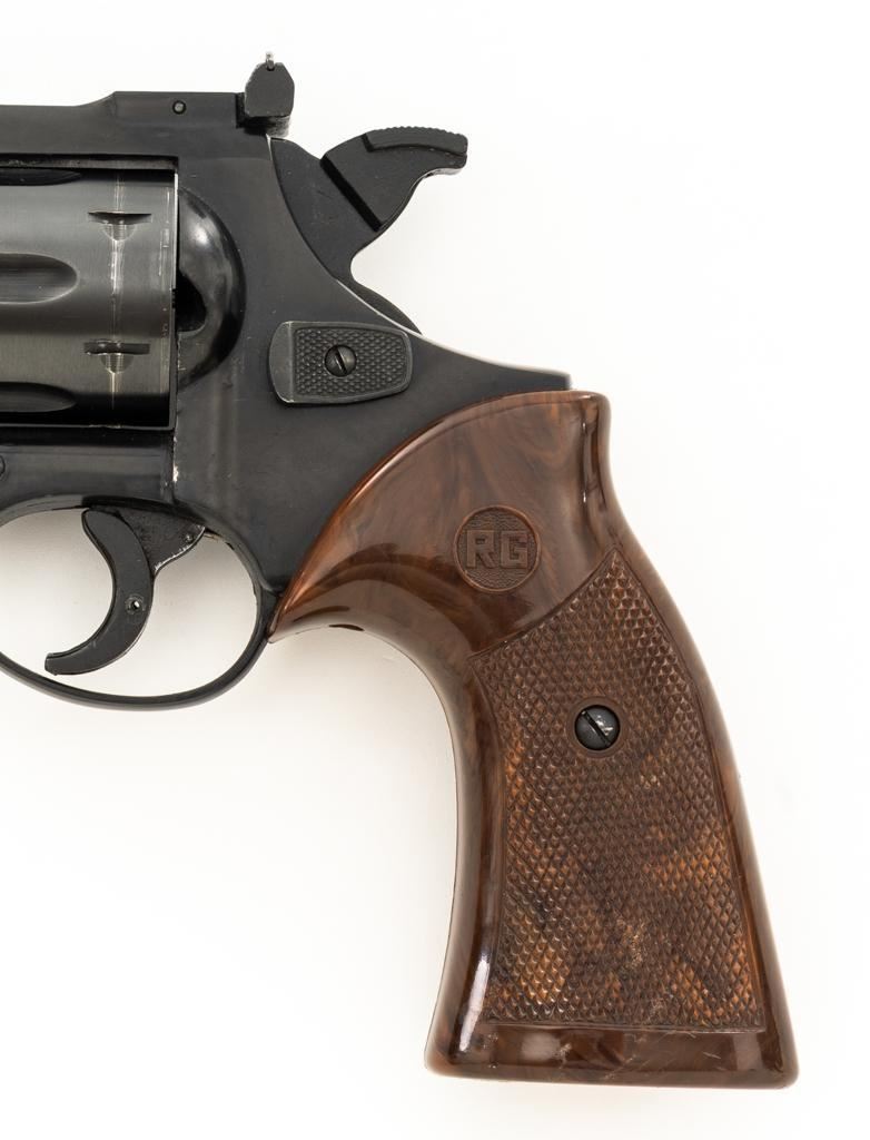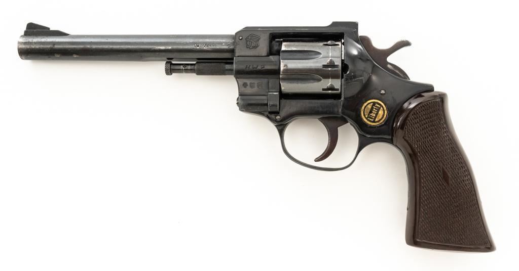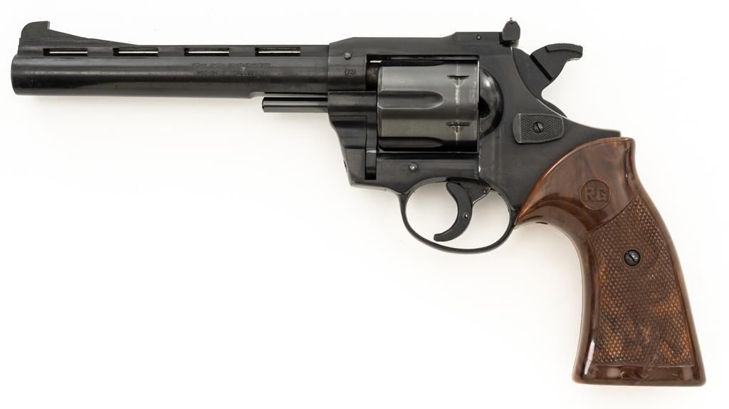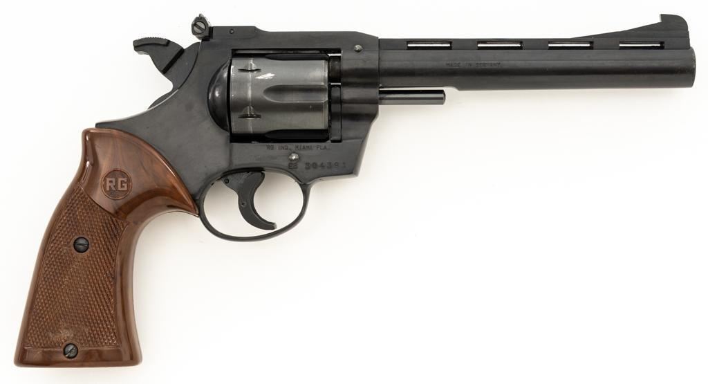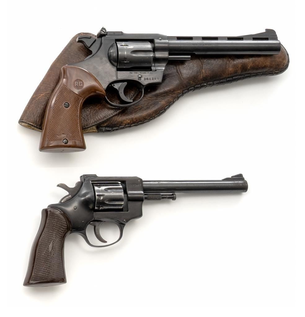 Lot of Two (2) Double Action Revolvers by RG & Arminius: 1.) RG Model 34T Double Action 6-Shot Revolver, #EB304391, .22 LR cal., 6'' vent rib barrel, black finish, checkered plastic two-piece grips, Patridge style front and adjustable square notch rear sight. Revolver is in near excellent overall condition, retaining approx. 95% thinning factory finish. Grips with a few flea bite chips at the bases and some minor damage at the base of the right panel. Action functions well. Bore is near excellent with defined rifling. 2.) Arminius Model HW7 Double Action 8-Shot Revolver, #159047, .22 LR cal., 6'' barrel, blue finish, checkered composition one-piece grips, serrated blade front and fixed square-notch rear sight. Includes a Eubanks Leather of Boise, ID stitched leather flap holster with fleece lining and brass snaps, marked on the reverse. Holster is in very good condition with tight stitching. Revolver is in very good overall condition, retaining approx. 90%-92% thinning finish, with wear and surface rust at the muzzle. Grips are very good. Action functions smoothly. Bore is very good with defined rifling. Est:$200-$300/lot(Both/Modern) (Not available to Calif. residents.)